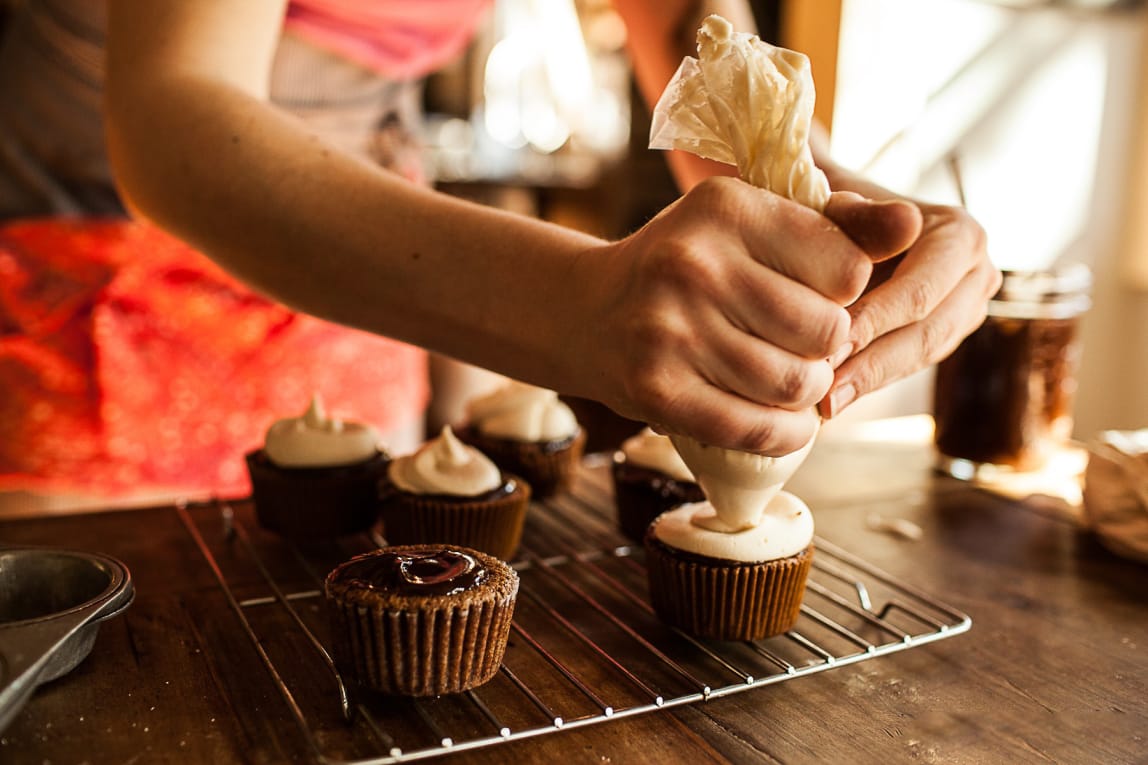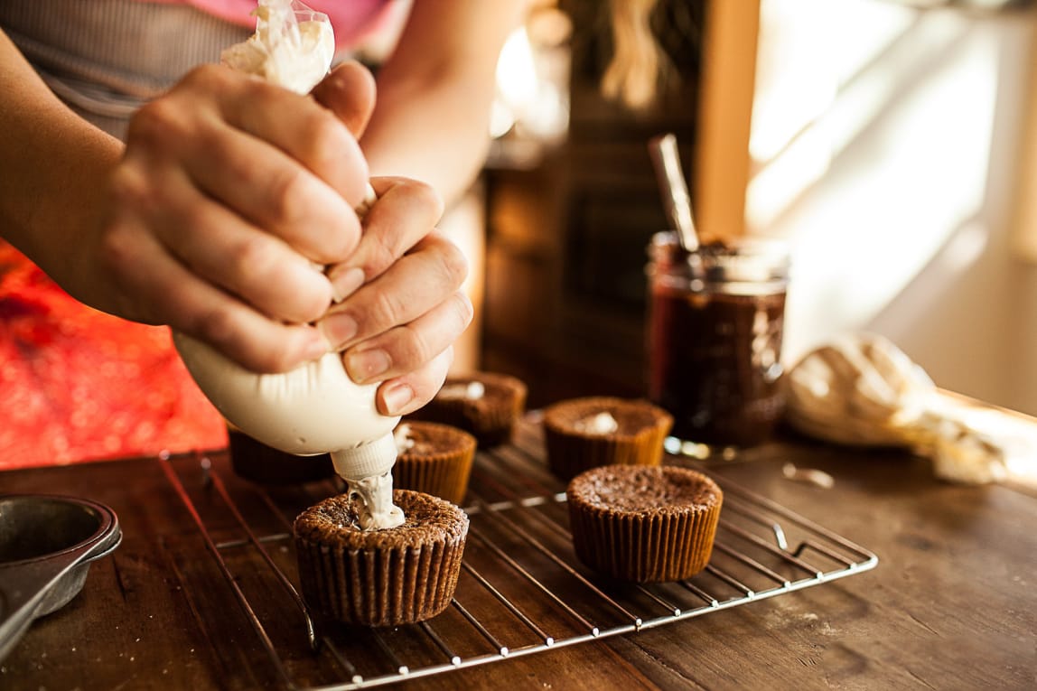 - While cooling, blend cream filling ingredients until fluffy. Place into a prepared piping bag! Once cupcakes are completely cooled, gently placing tip into cupcake and fill each cupcake{as pictured}.