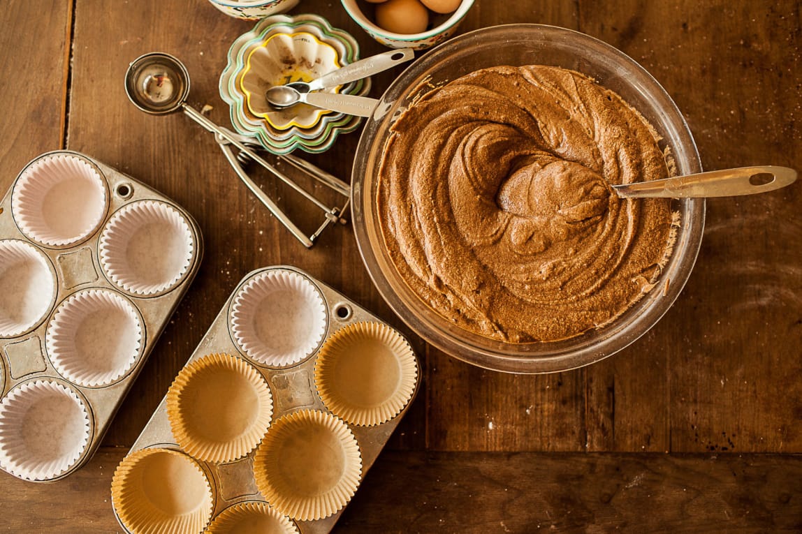 - Preheat oven to 350 degrees F. Line muffin cups with liners. Mix together the flour, cocoa, baking powder, and salt. Set aside.