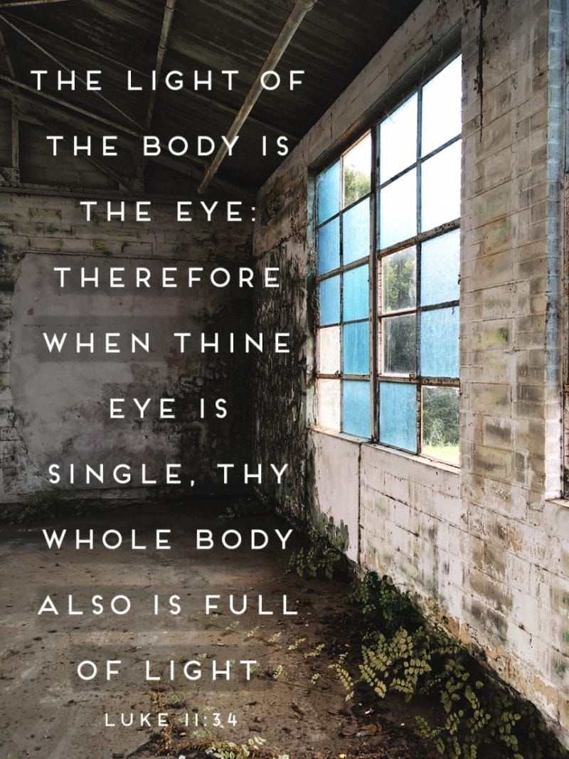 “No man, when he hath lighted a candle, putteth it in a secret place, neither under a bushel, but on a candlestick, that they which come in may see the light. The light of the body is the eye: therefore when thine eye is single, thy whole body also is full of light; but when thine eye is evil, thy body also is full of darkness.”