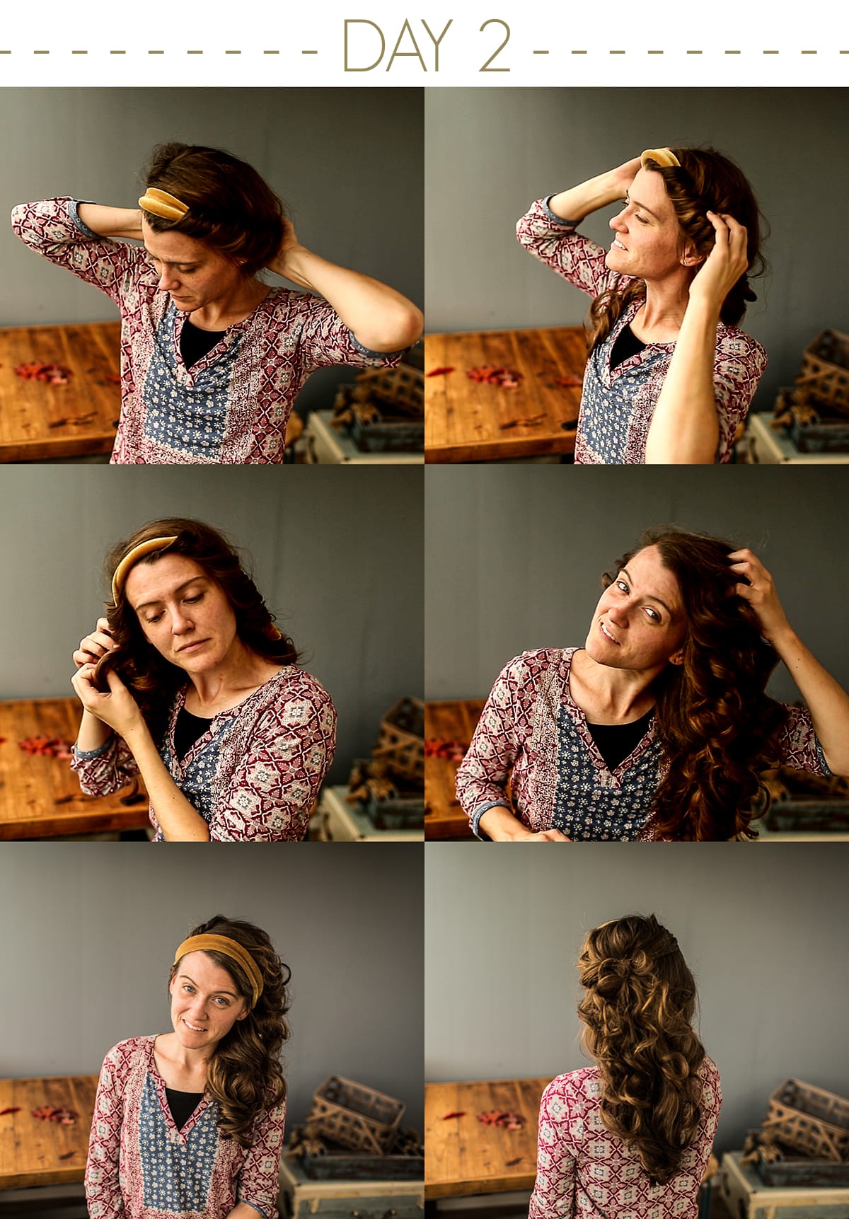 - Day 2. Remove all bobby pins, unclasp Katherine Stretch Velvet Headband, and gently shake hair out releasing the headband and revealing the curls. Do not use a hair brush for this portion. I will just gently massage the scalp and curls with my fingers to loosen!