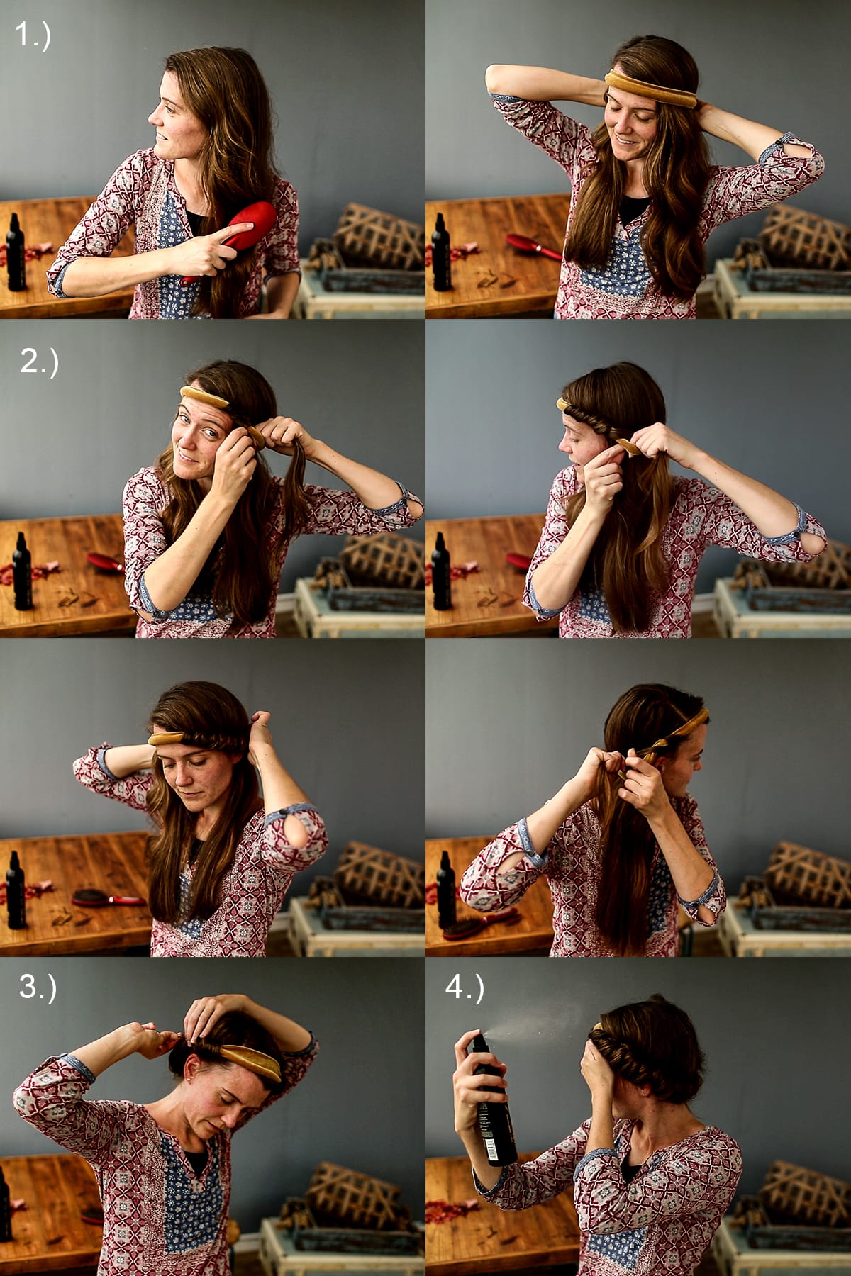 - ) Brush hair thoroughly, make sure your hair is parted as desired, and evenly divide hair in 2 equal portions(doesn’t have to be perfect just close :) ). I will lay both portions over each shoulder to keep them separated! Clasp Katherine’s Stretch Velvet Headband around the head just like you would wear a crown. Katherine Headband should be folded into about 1 inch thick band!