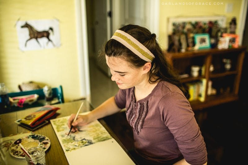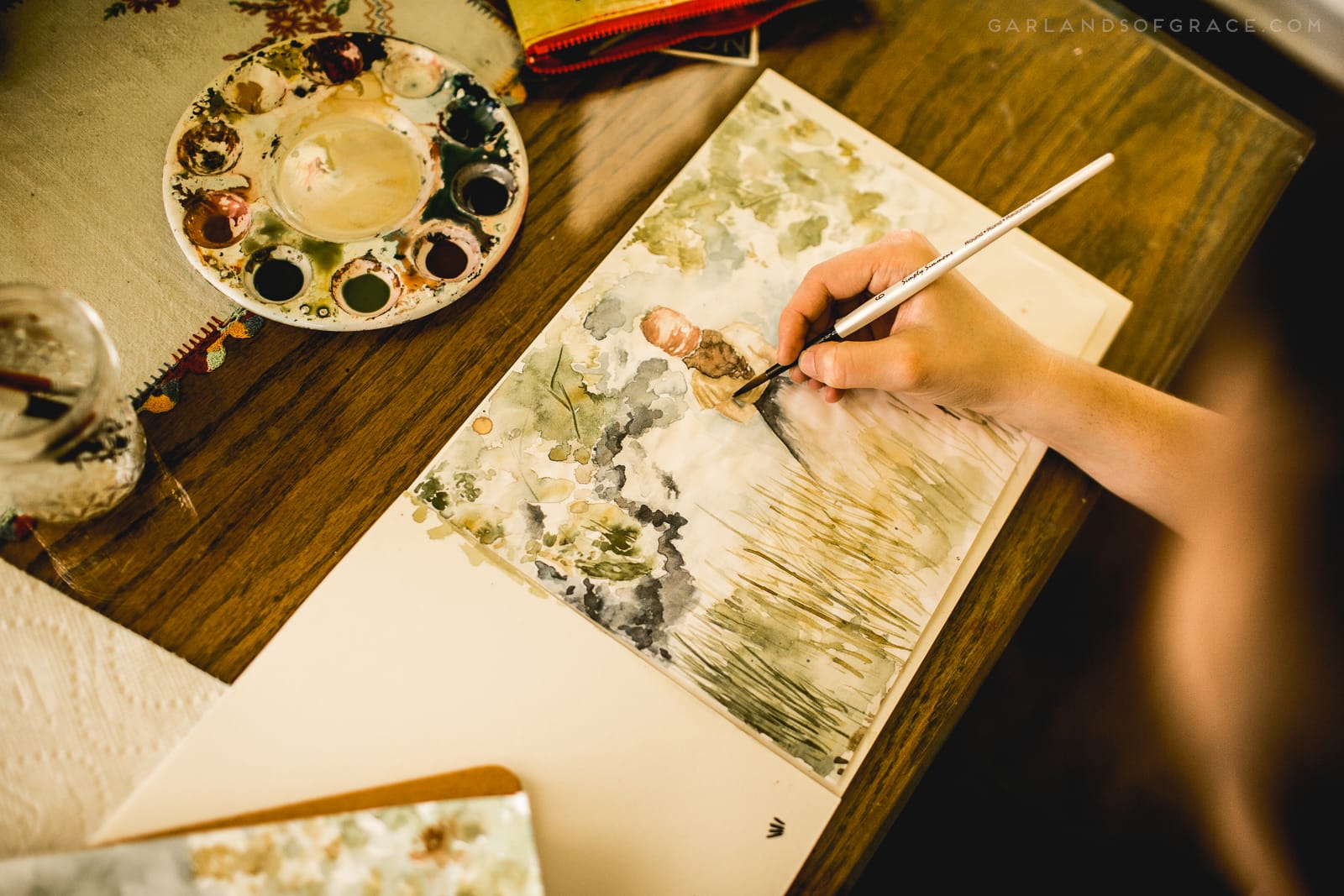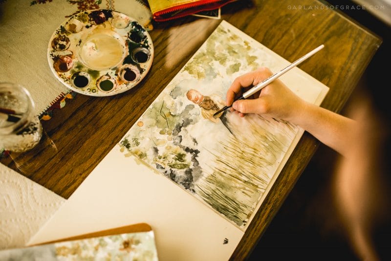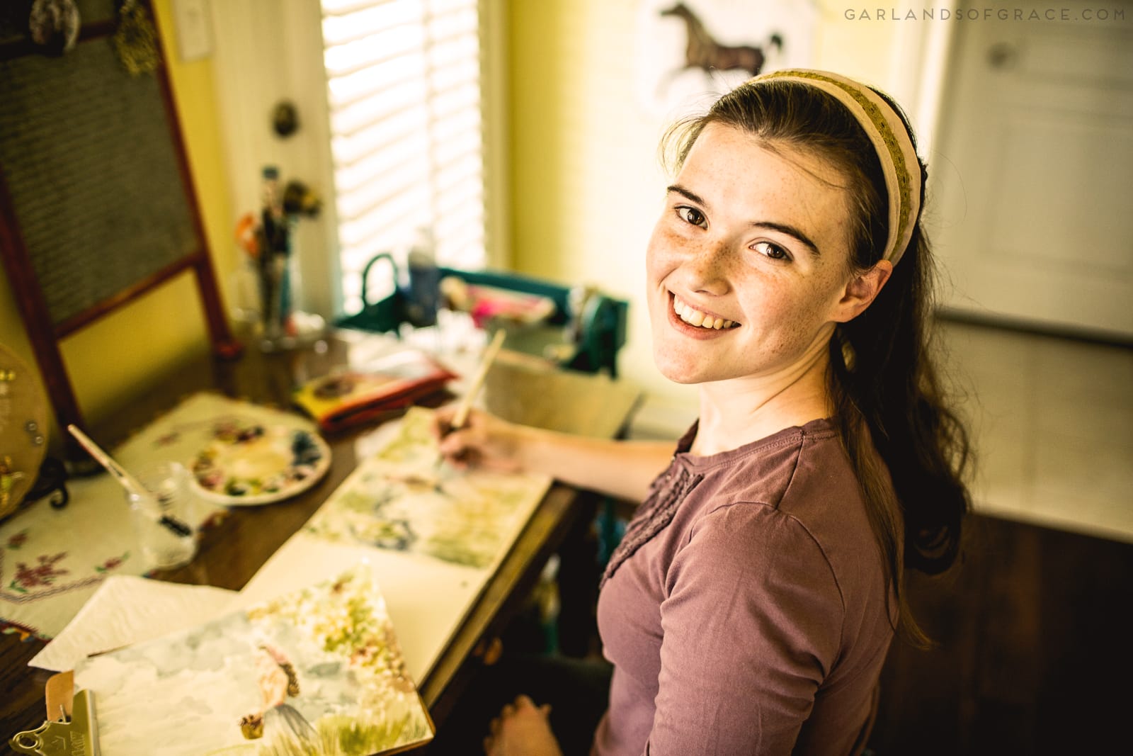 One of the joys of running Garlands of Grace is working together with my sisters and today it’s time for you all to meet Ruth! She is one of the sisters and artist here at Garlands of Grace. ? Ruth also keeps Garlands of Grace Pinterest filled with inspirational pins. If you haven’t followed us on pinterets yet, it’s a fun place to visit! Ruth has been gifted with an eye for watercolor and she diligently designs Garlands of Grace hang Tags, verse cards, and other sweet prints we offer!✨ Her latest artwork was the Garlands of Grace Adorned Notecards that went in our giveaway last month. We are so thankful to the Lord to have Ruth working along side of us and we hope you enjoy her little pieces of art included in Garlands Of Grace orders!! I snuck a few photos of this girl diligently at work a while back. She’s wearing her Organic Leaves Headband as she puts the finishing touches on her latest work! ??