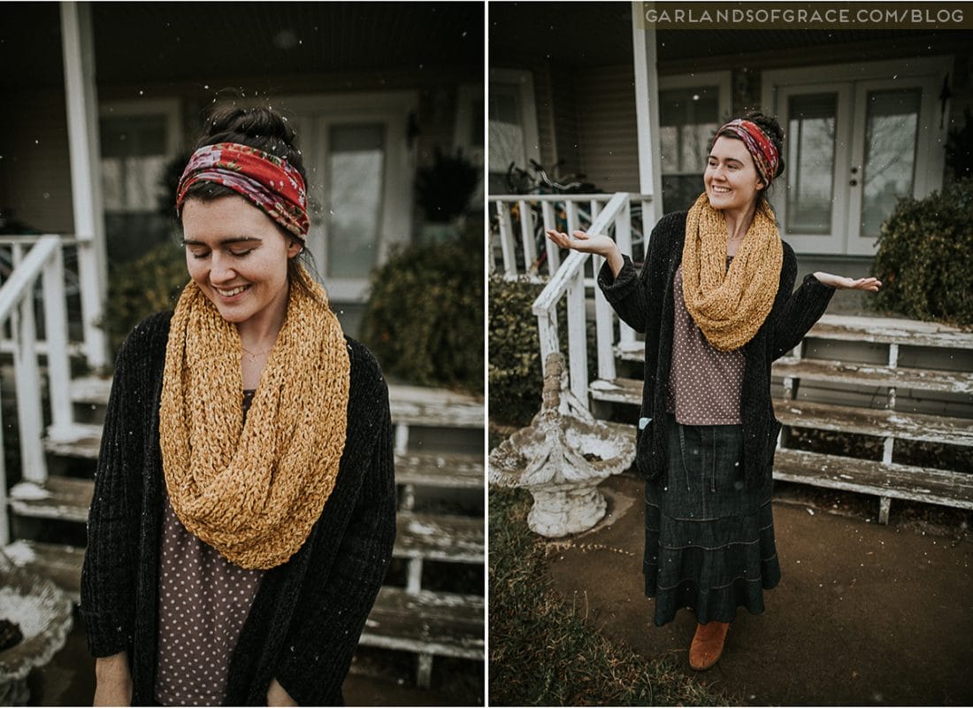 It’s not very often we get a flurry of snow falling in Texas! ✨❄️ As little as it was, it was a beautiful sight to see it fall yesterday afternoon. Lydia let me snap her photo as she enjoyed a “snow day”! She’s looking absolutely lovely in her Garlands of Grace Spiced Rose Cecily Headwrap. 😍 Love this cozy floral!!
