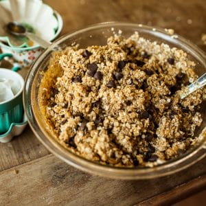 - Add the vanilla and then pour the mixture over the oats, using a rubber spatula to get all the sugar mixture out of the pan. Mix the ingredients together until the oats are completely coated. Add in chocolate chips(and any other mix-ins you would like) then press very firmly into parchment lined 9×13″ pan! Place them in the freezer for 20 minutes then cut to size.