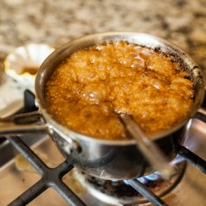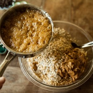 - In a large mixing bowl, mix together the oats, cereal and coconut. Add peanut butter(optional) to the top and set aside! Set a small saucepan over medium high heat and melt the butter. Add the honey, brown sugar and salt. Stir together then leave it alone as it comes to a boil. Once the boil has reached all the way around the edges of the pan, begin timing(this is where your iphone will come in handy ;)! Allow this mixture to boil for 2 minutes and 20 seconds. During this time, you may need to turn the heat down a bit so it doesn’t overflow, but be sure it keeps boiling.