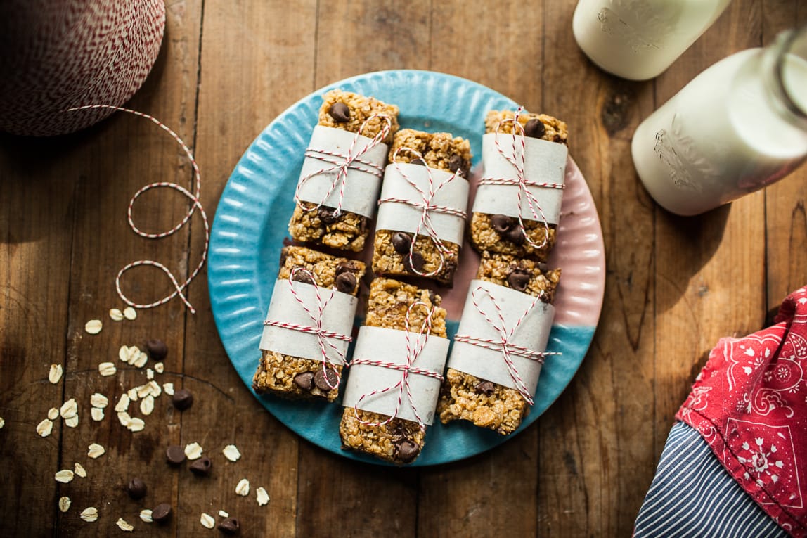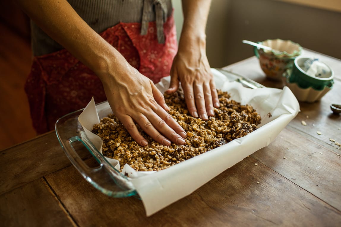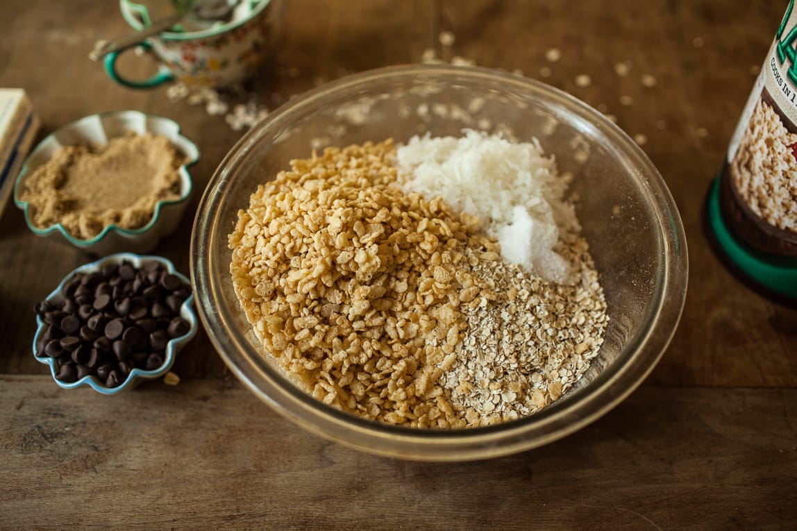 - Add the vanilla and then pour the mixture over the oats, using a rubber spatula to get all the sugar mixture out of the pan. Mix the ingredients together until the oats are completely coated. Add in chocolate chips(and any other mix-ins you would like) then press very firmly into parchment lined 9×13″ pan! Place them in the freezer for 20 minutes then cut to size.