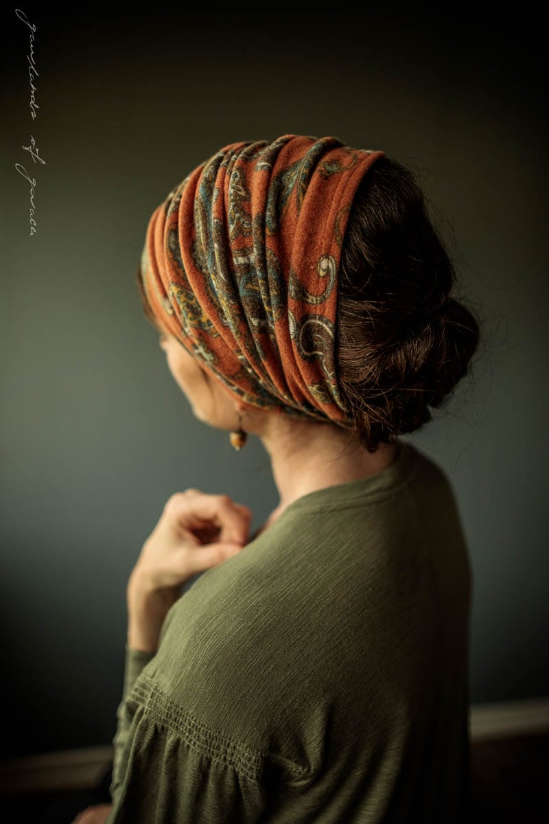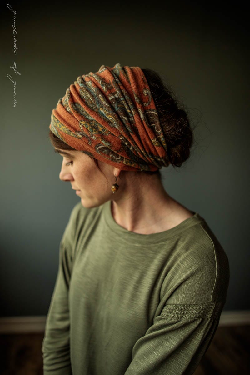 Long Sweaterknit Cowl Headwraps and headcoverings, Clasp Closure, Convertible Design, wear fully extended for full-coverage headcovering or bunched into headband style