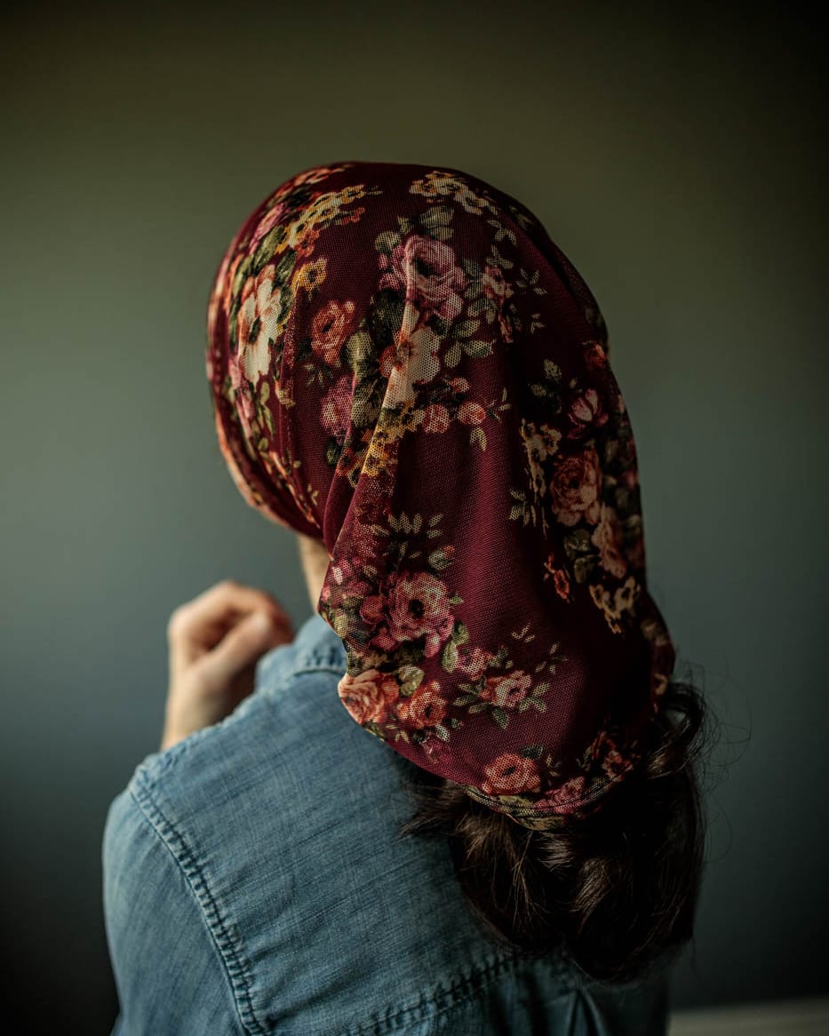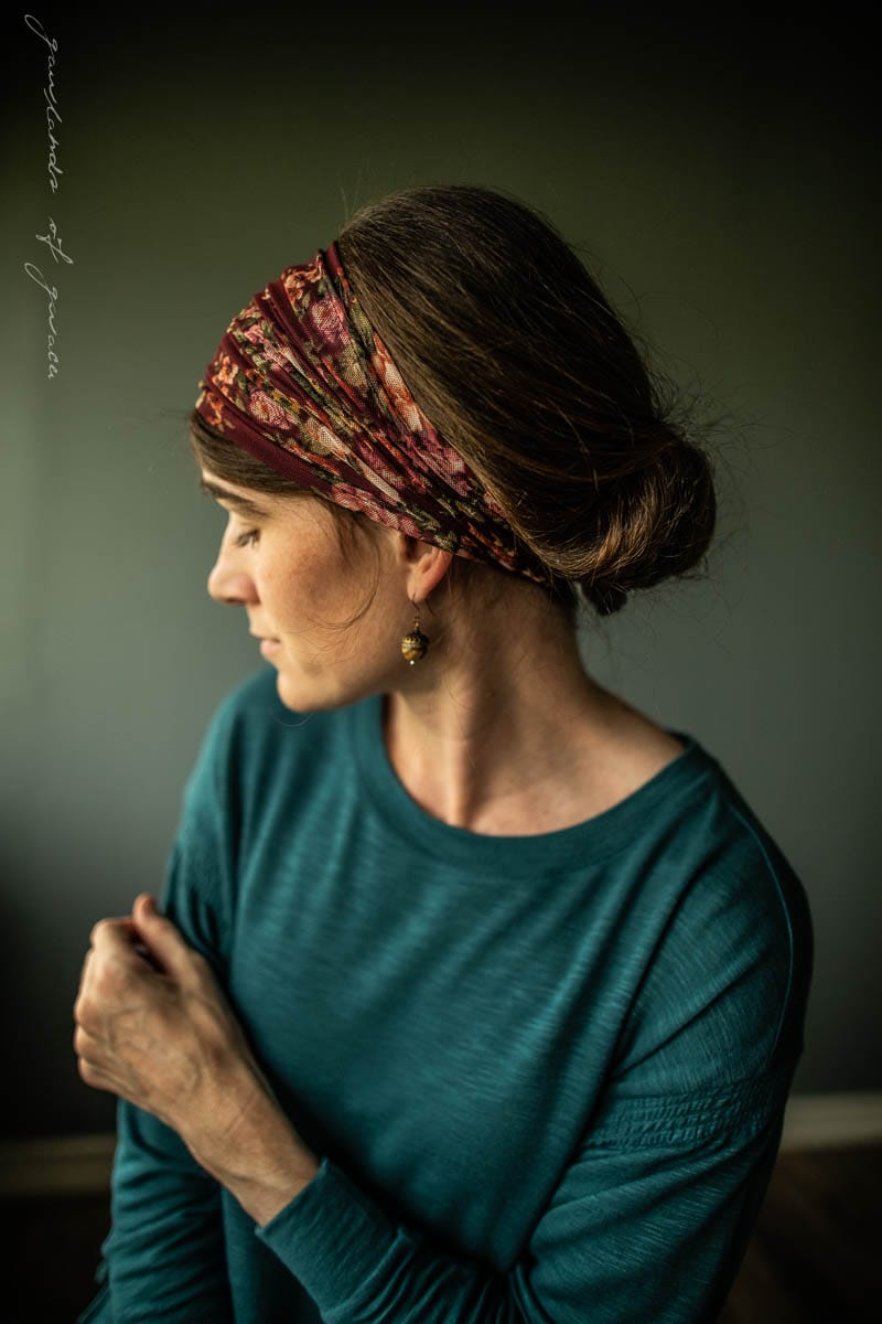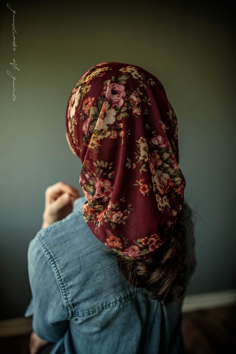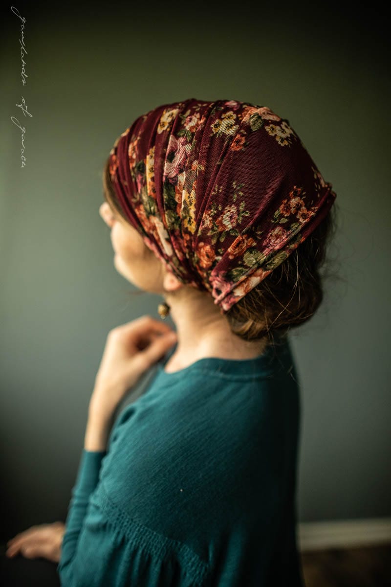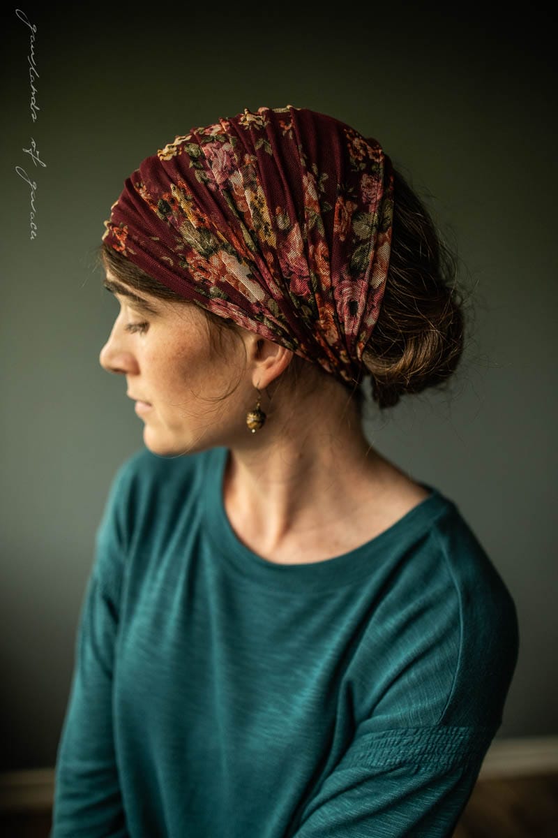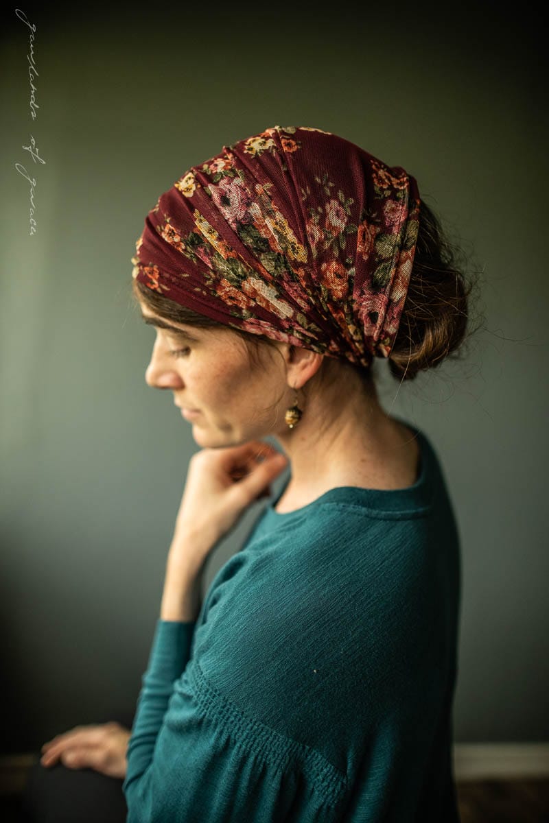 Garlands of Grace original soft stretch Cowl covering offers several styles in one! Headwrap may be worn long for a full-coverage headcovering, folded for medium length, or bunched into a headband style. Clasp Closure offers easy wear and styling that won’t ruin your hairdo. A Timeless, Flattering and Feminine hairwrap!