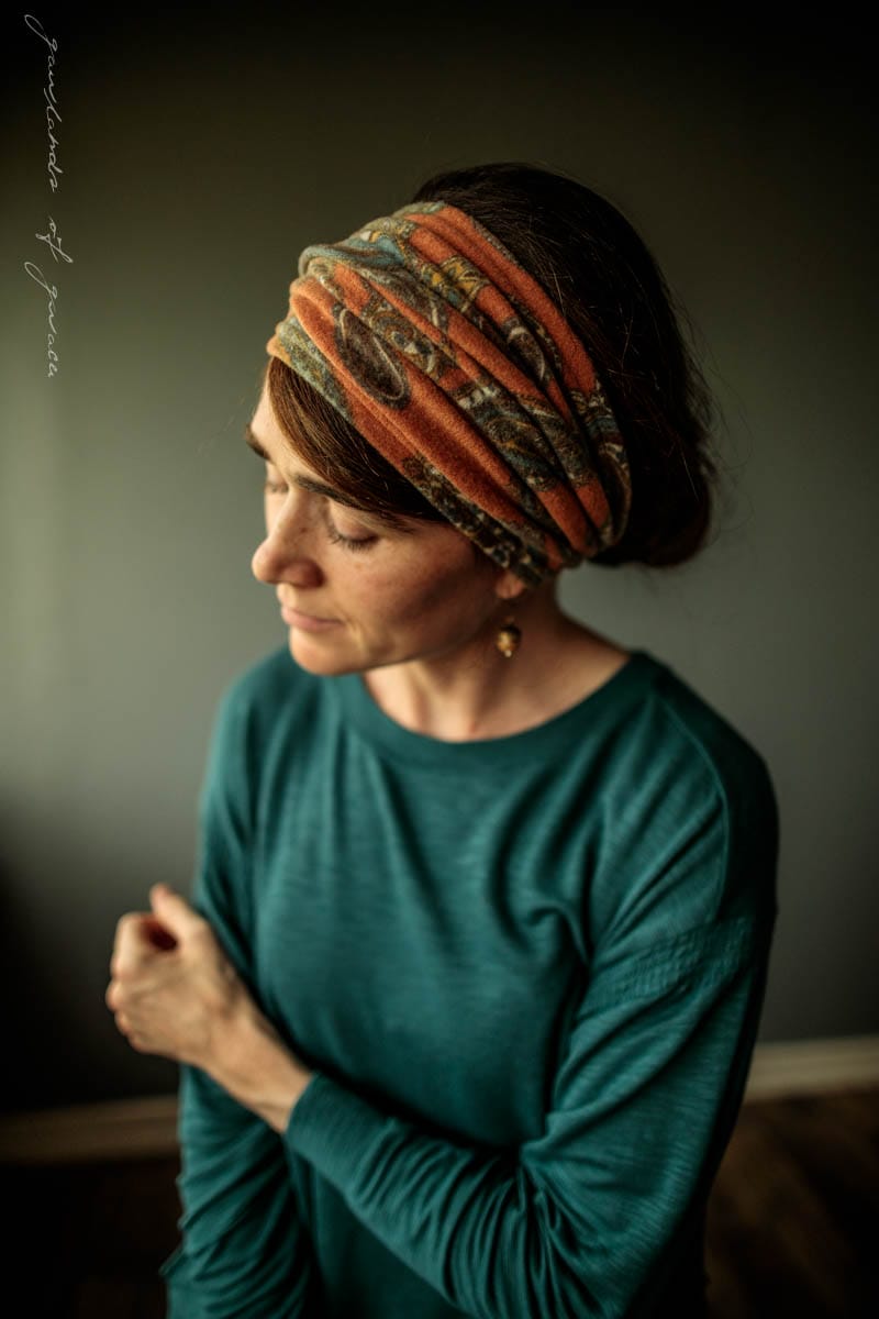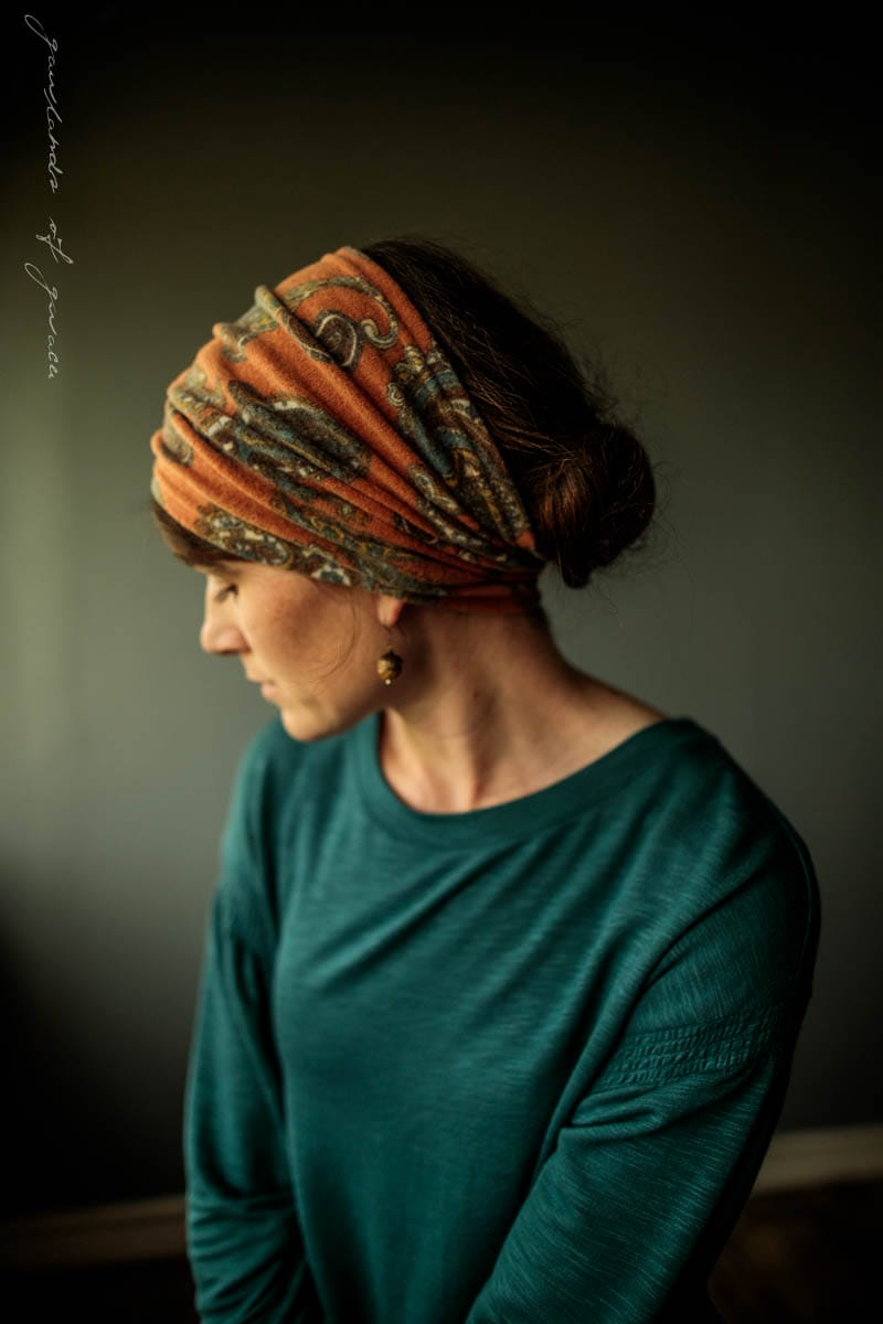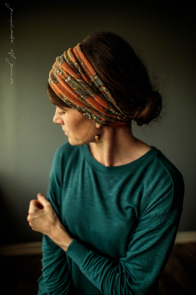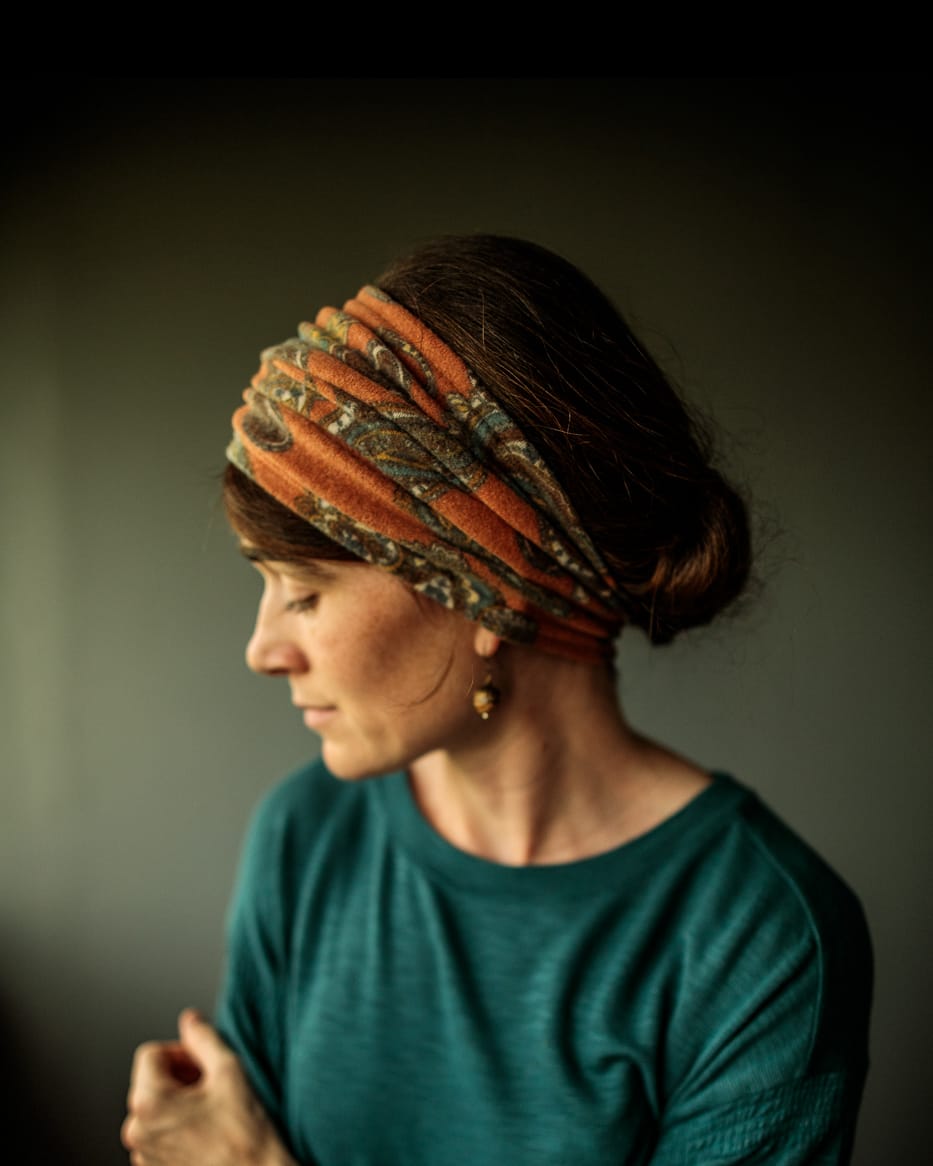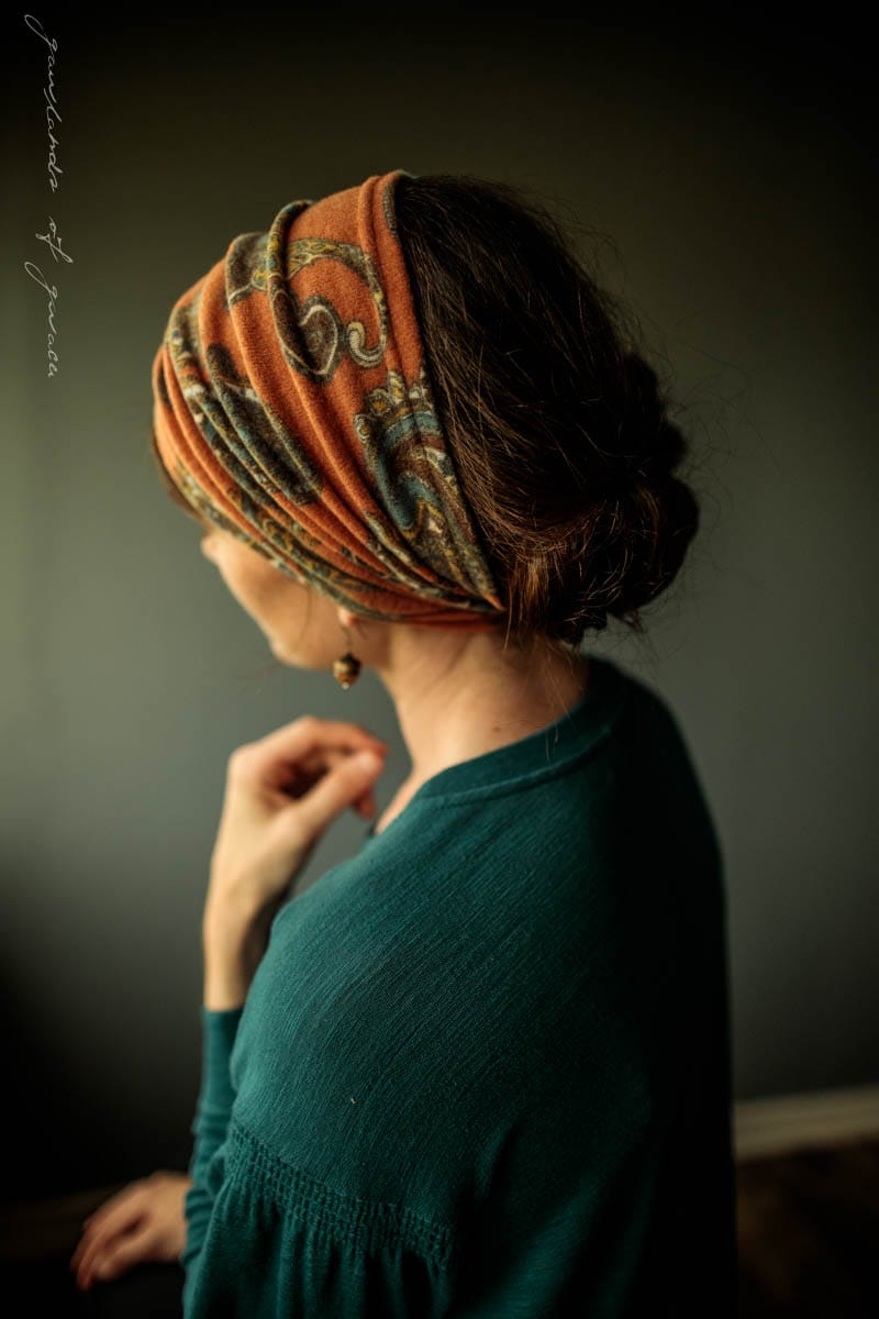 Cecily style Headcoverings, stretch, clasp closure, convertible design, wear fully extended for mid-length headcovering or bunched into headband style