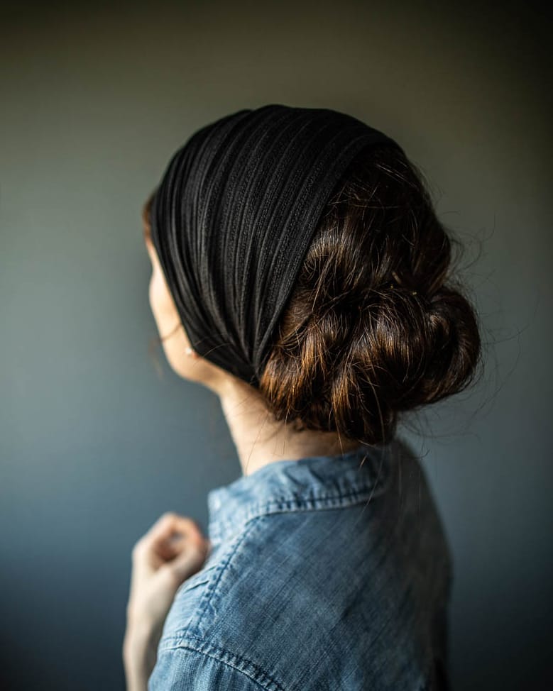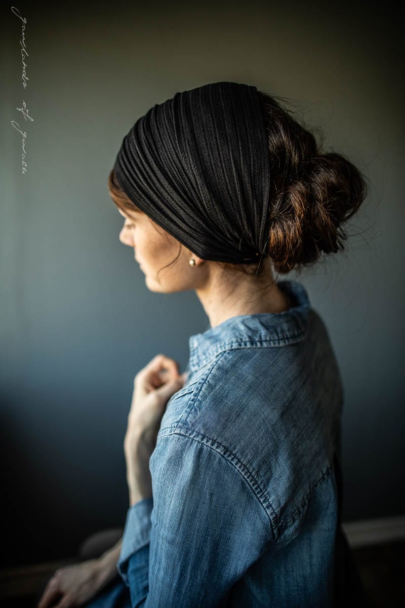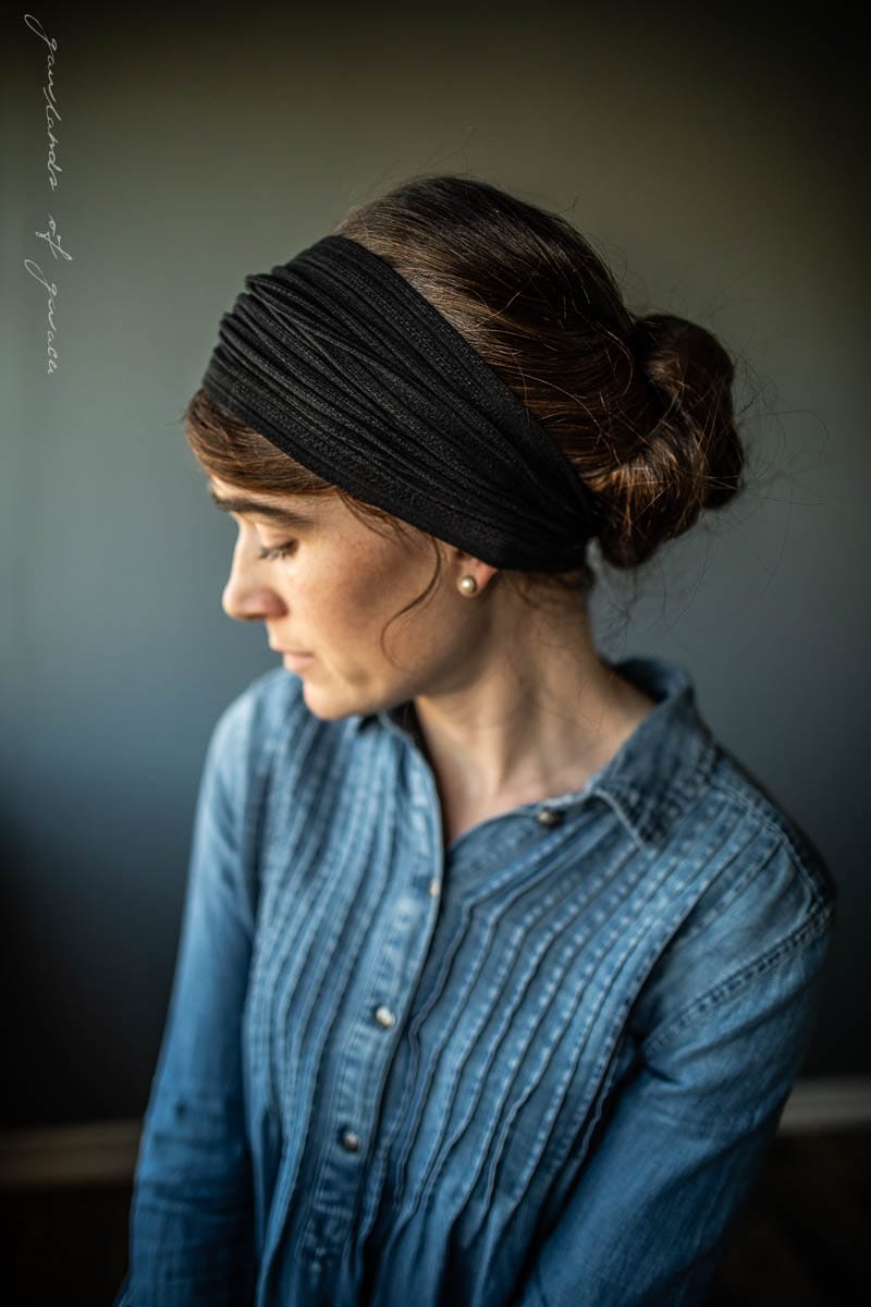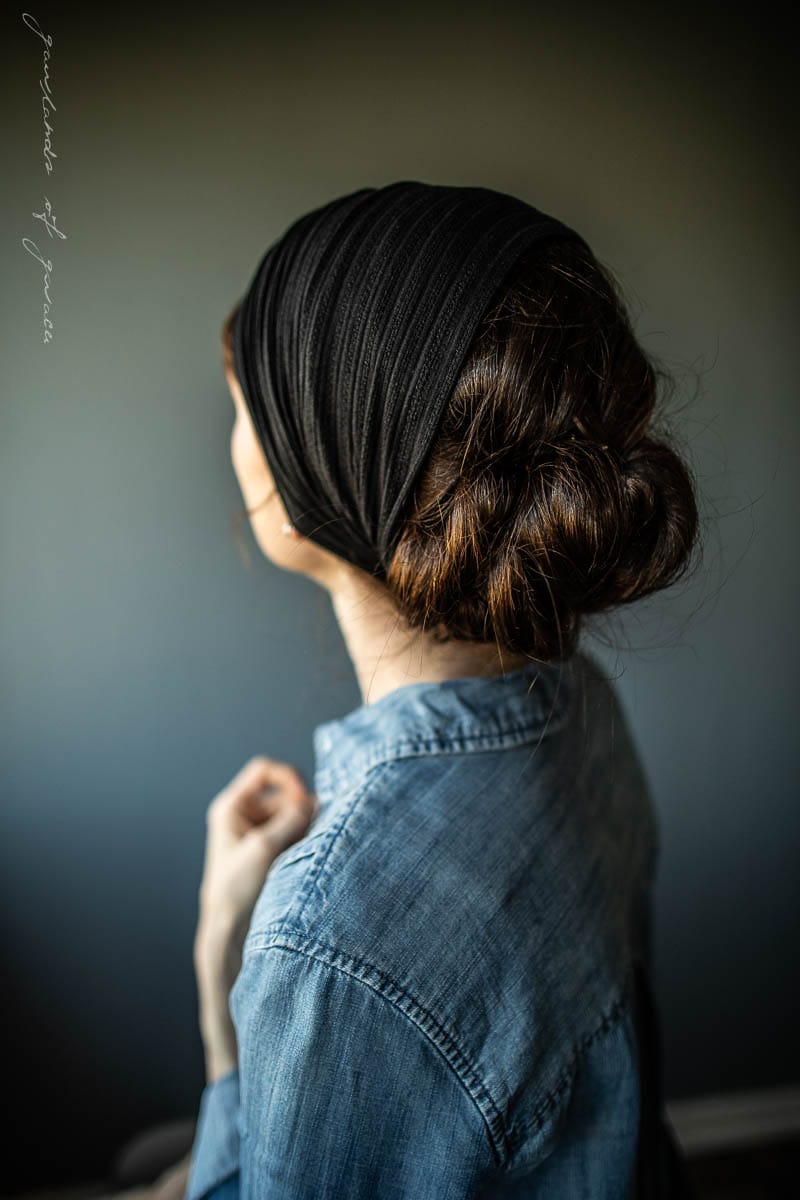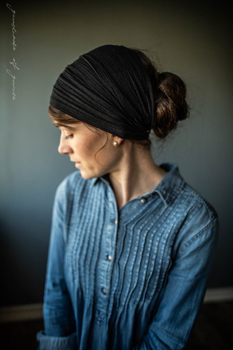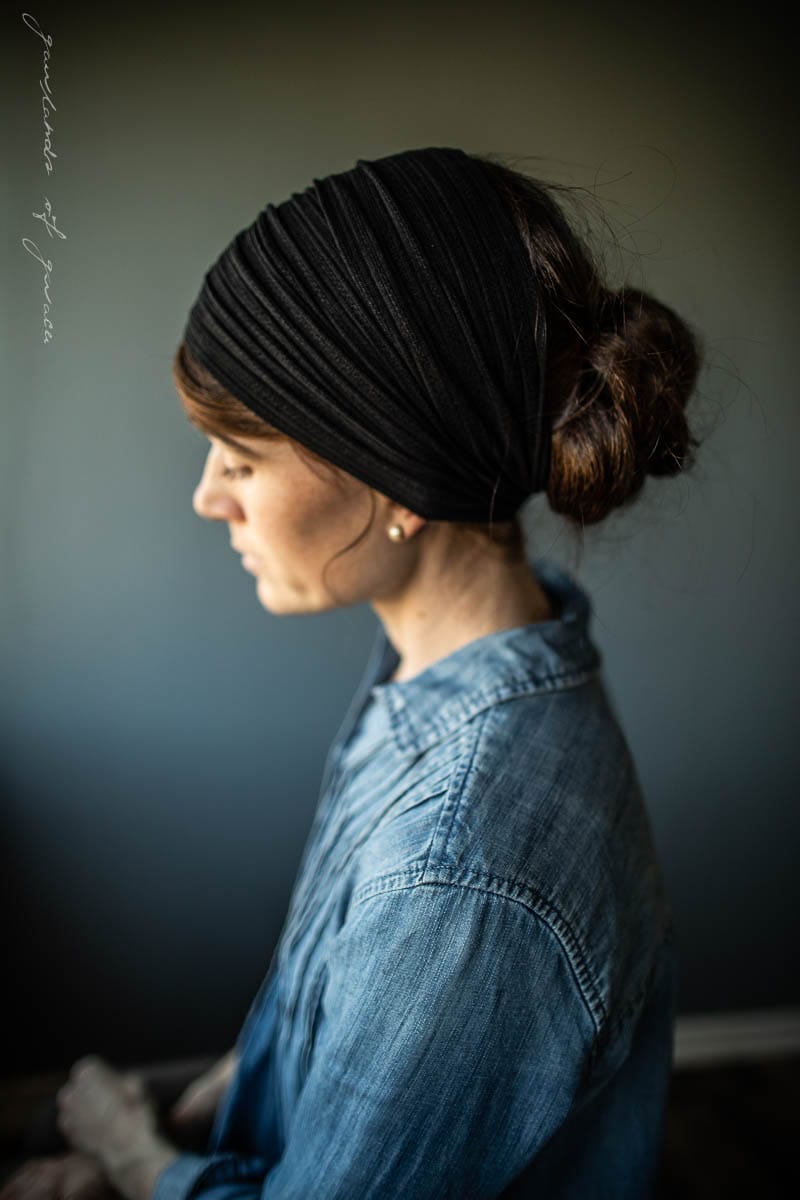 Stretch Floral Cecily style Headcoverings, Clasp Closure, Convertible, wear fully extended for moderate length headcovering or bunched into thinner headband style!