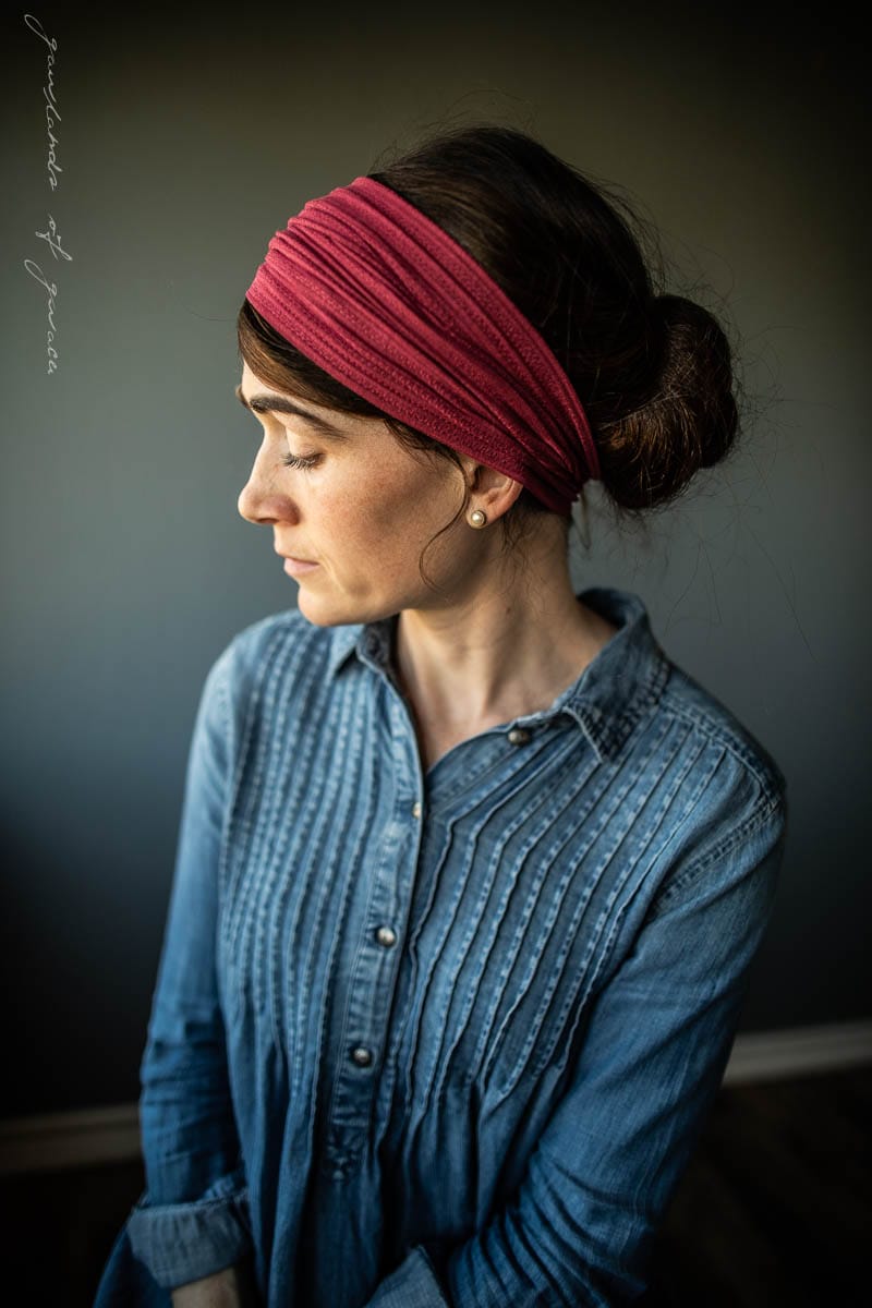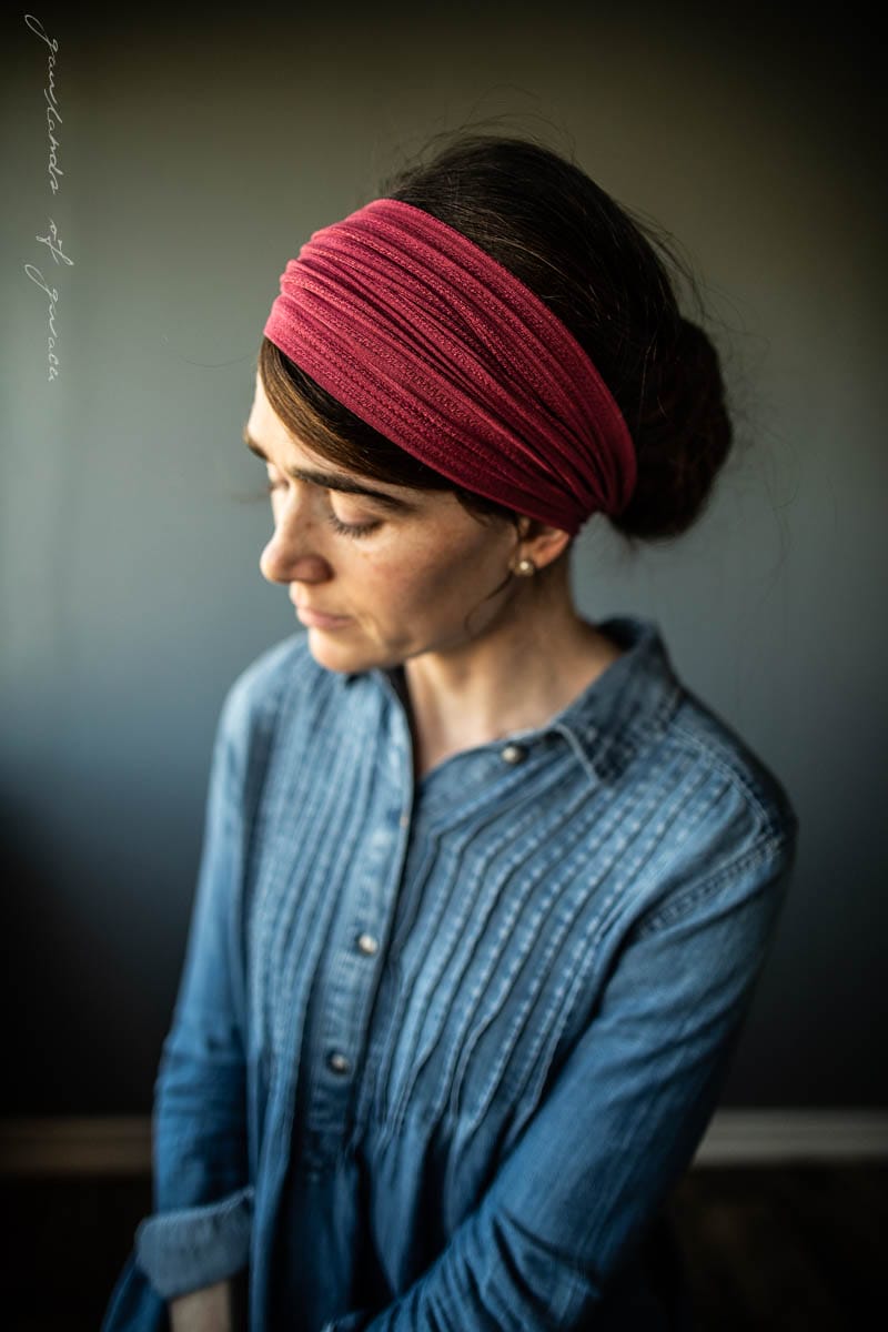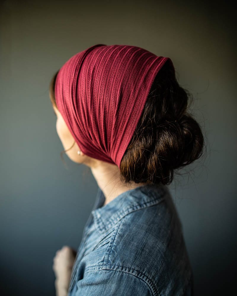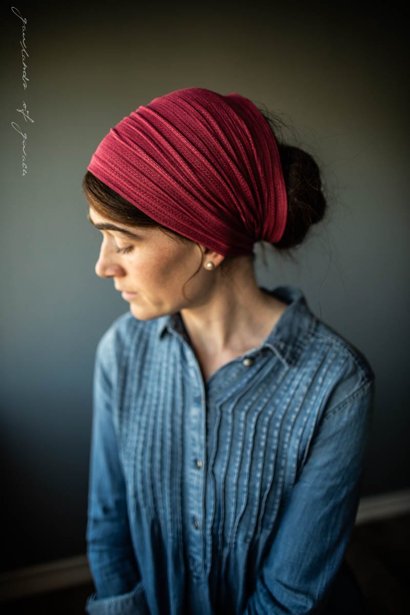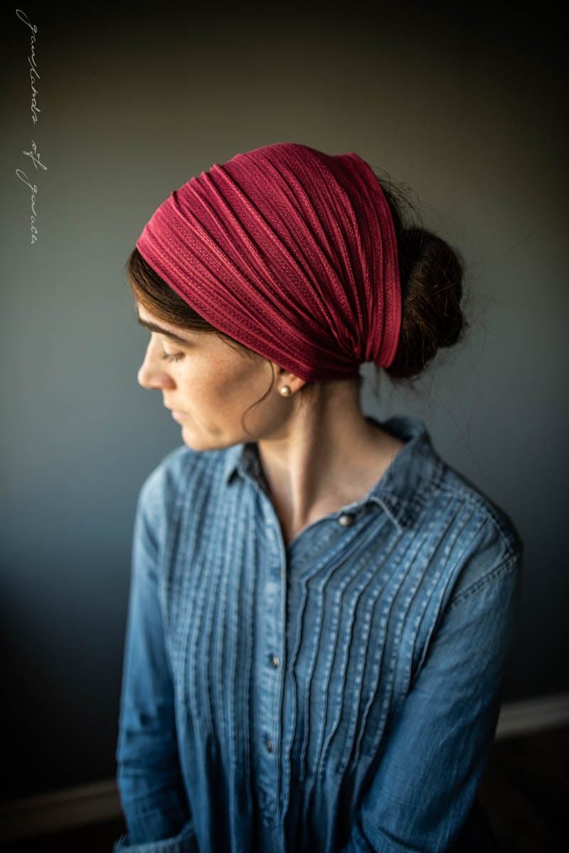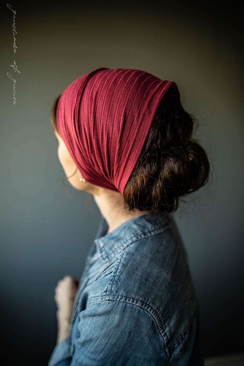 Stretch Floral Cecily style Headcoverings, Clasp Closure, Convertible, wear fully extended for moderate length headcovering or bunched into thinner headband style!