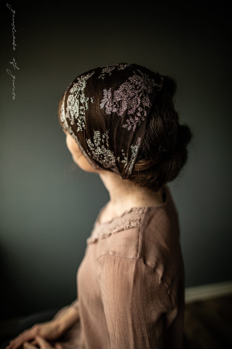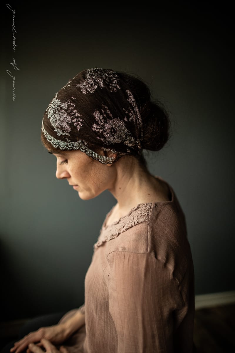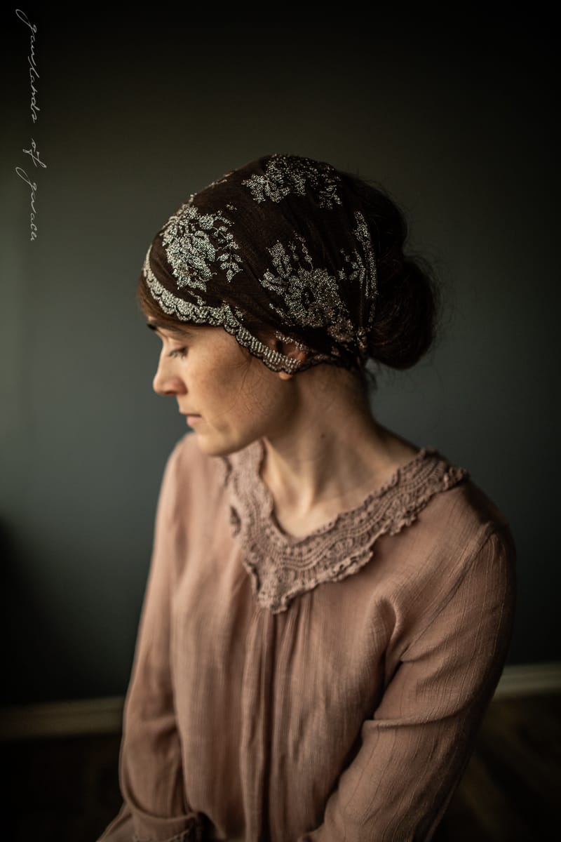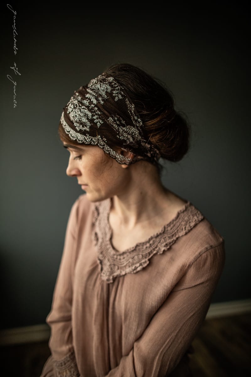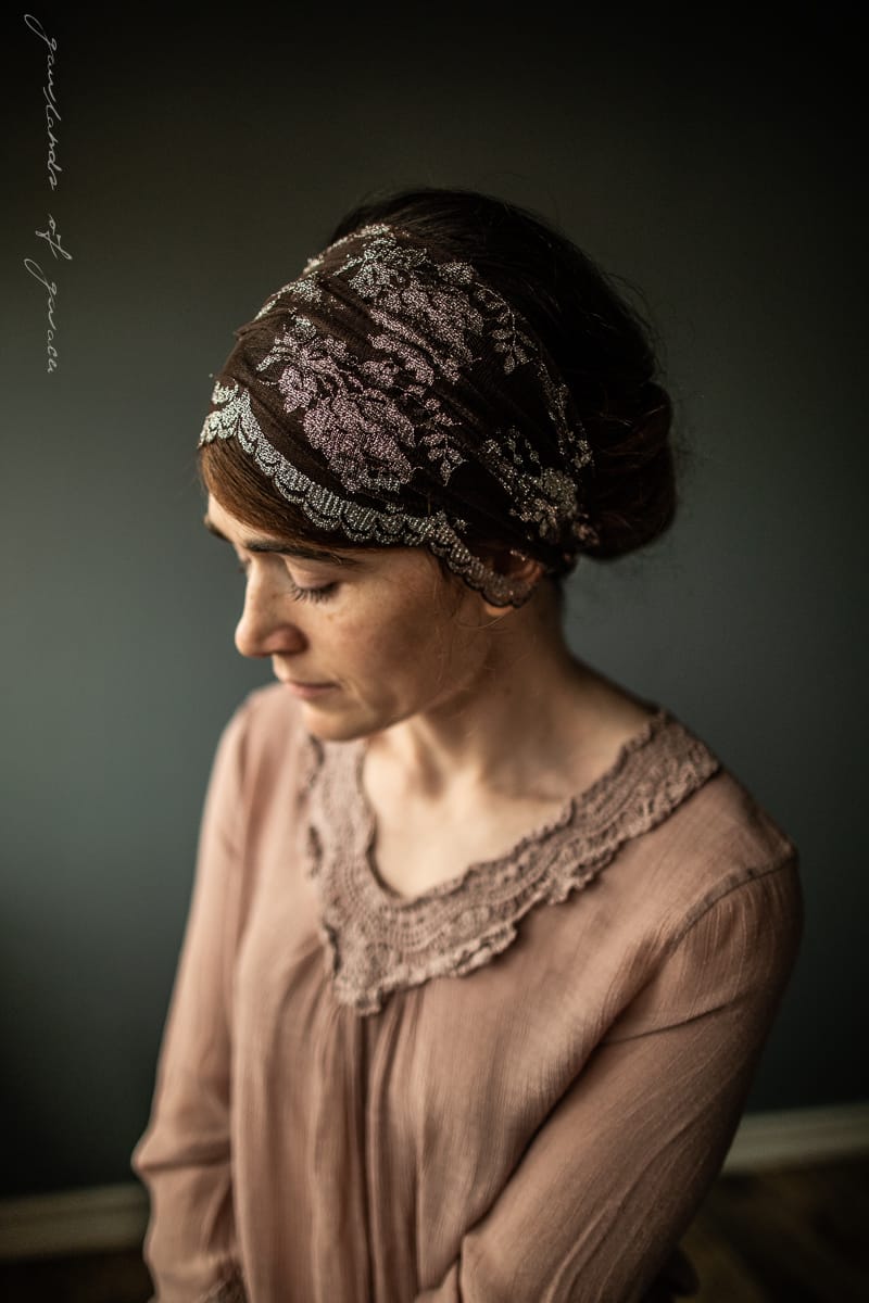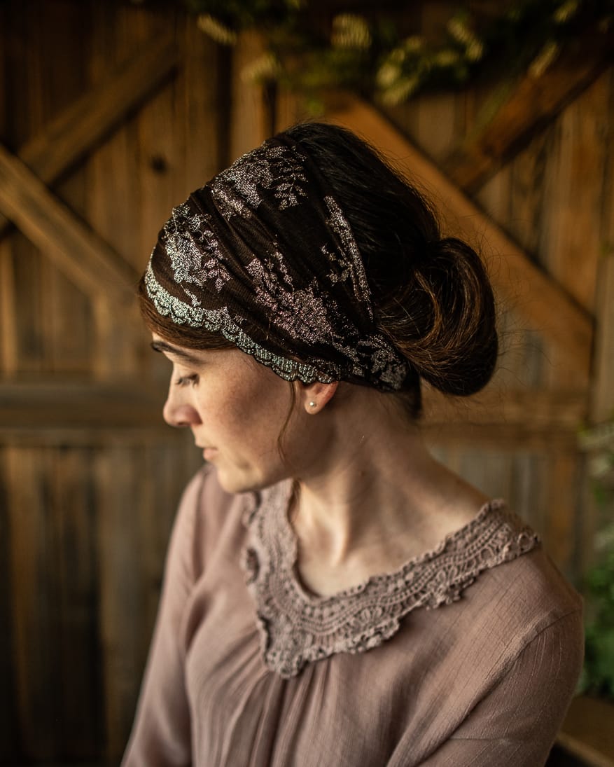 Simply stunning. Cecily’s classic hairwrap has been made from the lightest, most delicate lace with slightly raised detail and a bit of silver shimmer. Wear covering fully extended for medium length coverage or pull taught for a narrow headband style. Finished with slim tie closures for a comfortable, custom fit. Timeless and truly breathtaking.