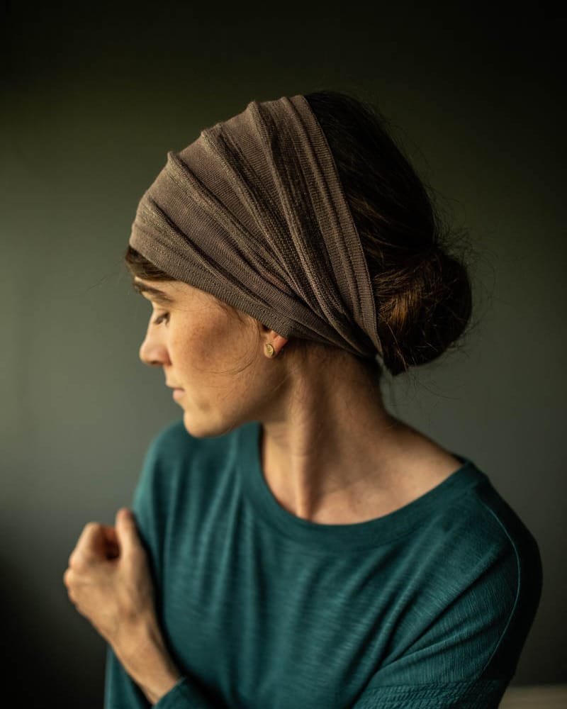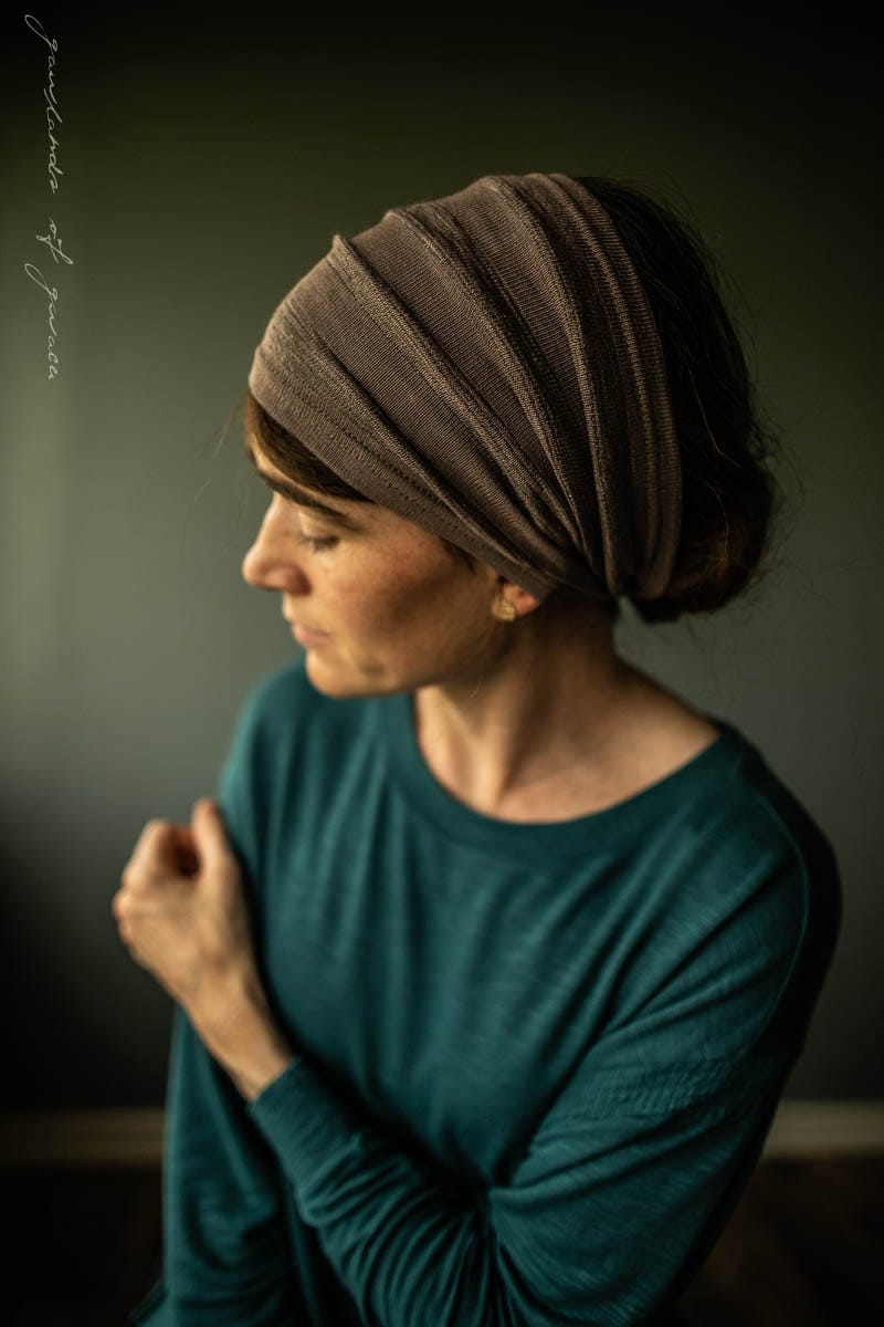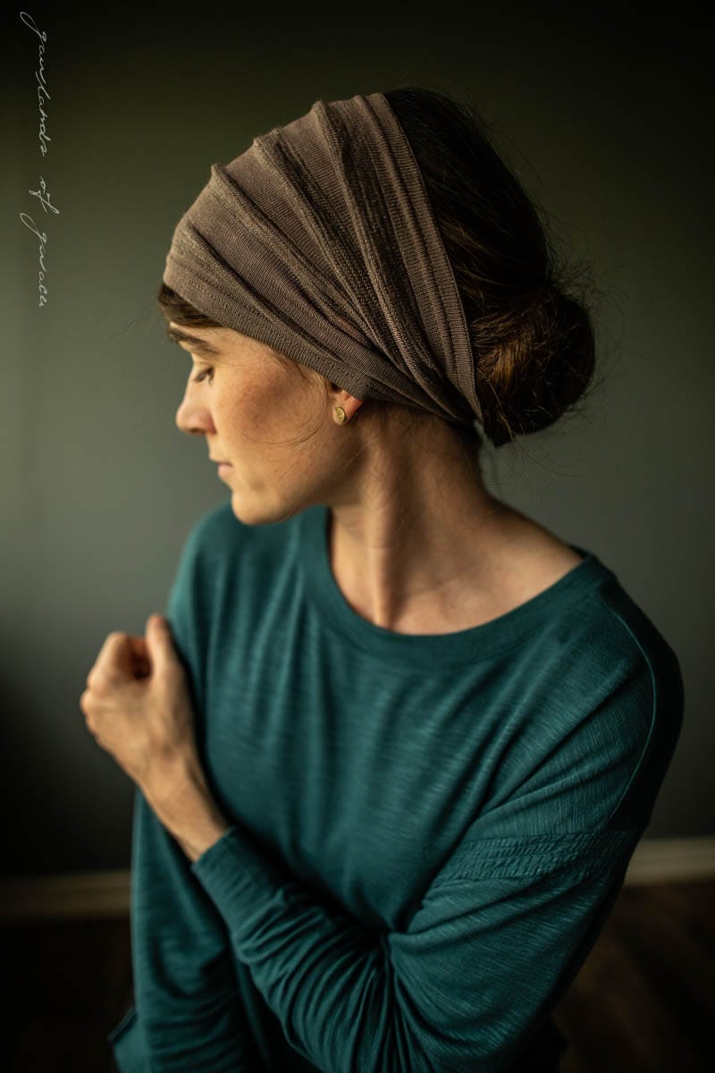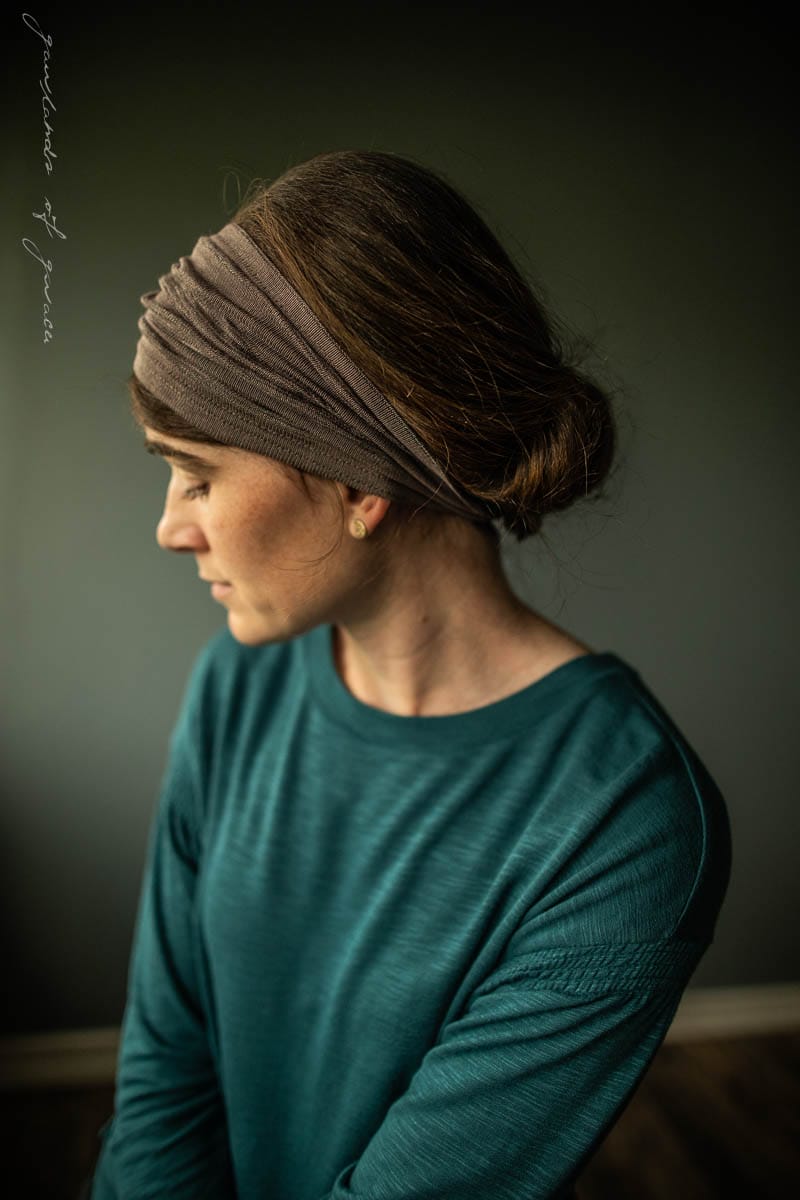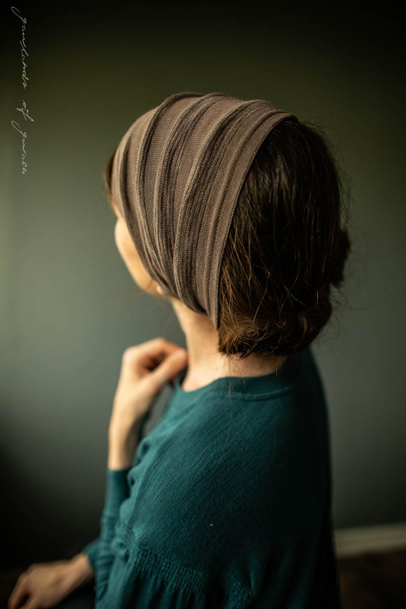 Cecily style Headcoverings, stretch, clasp closure, convertible design, wear fully extended for mid-length headcovering or bunched into headband style