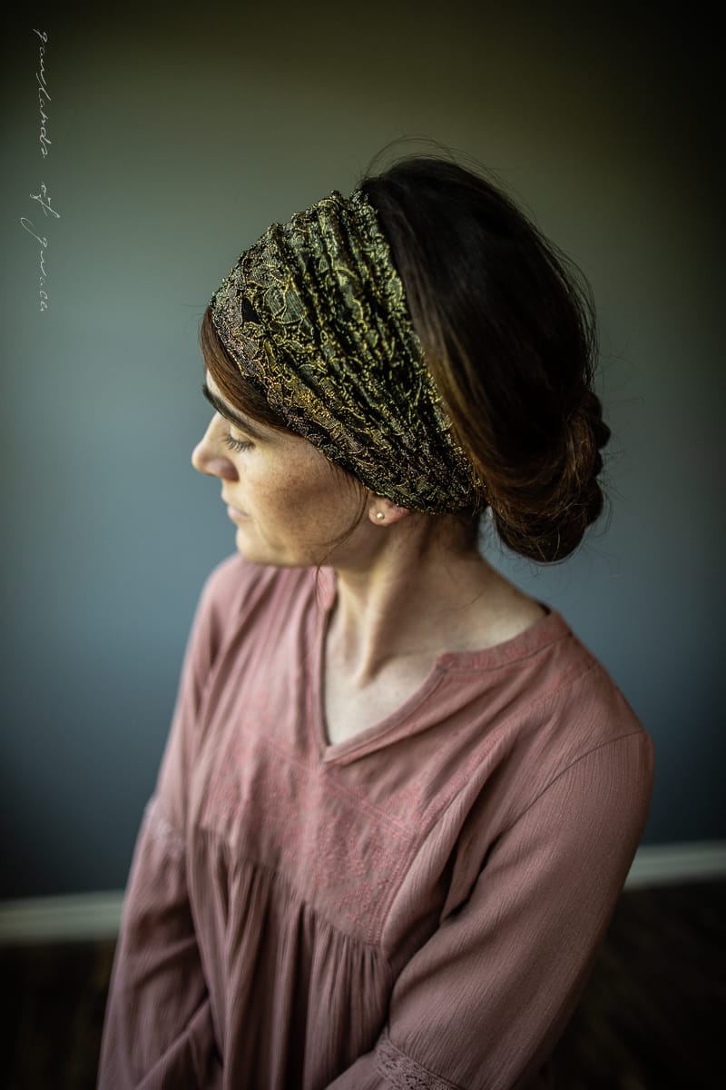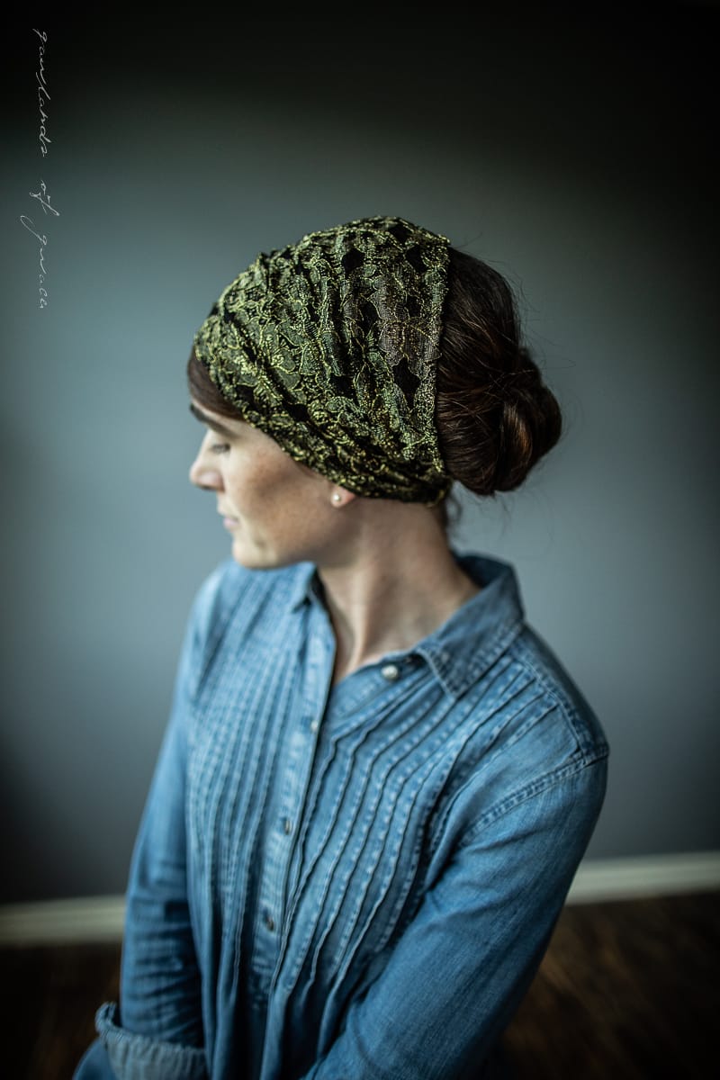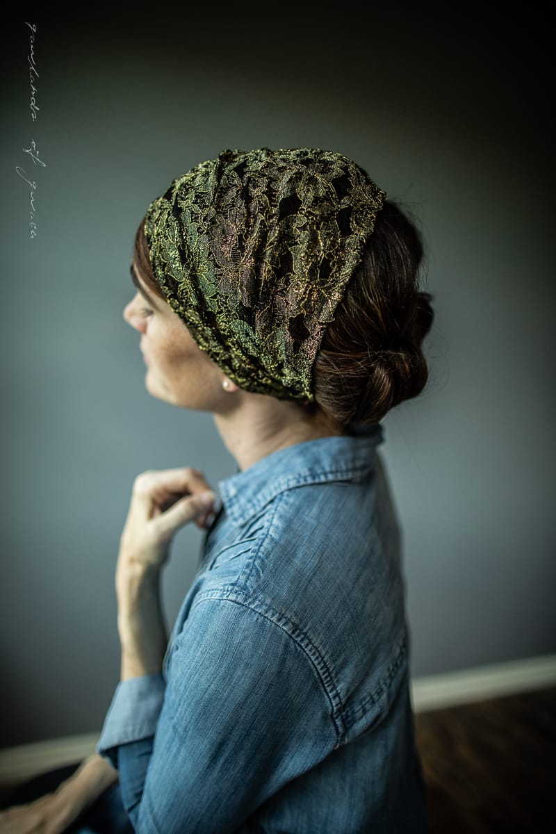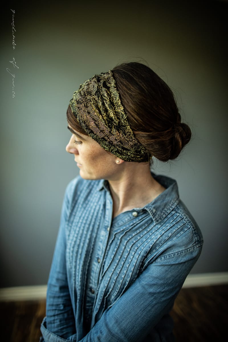 Garlands of Grace classic and best-selling hairwrap in timeless lace! Cecily’s Convertible hair wrap may be worn fully extended as medium width covering or bunched for a flattering headband style. Tie closure offers a comfortable, custom fit.