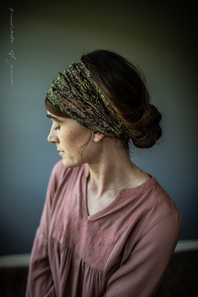 Cecily style cotton headwrap, tie closure, convertible design, wear fully extended for moderate length headcovering or bunched into headband style, approximately 9.5 inches wide