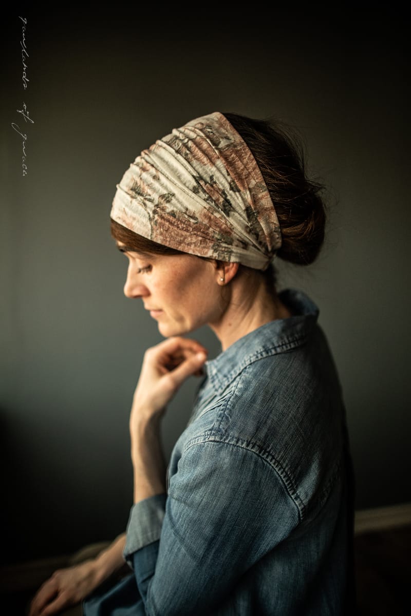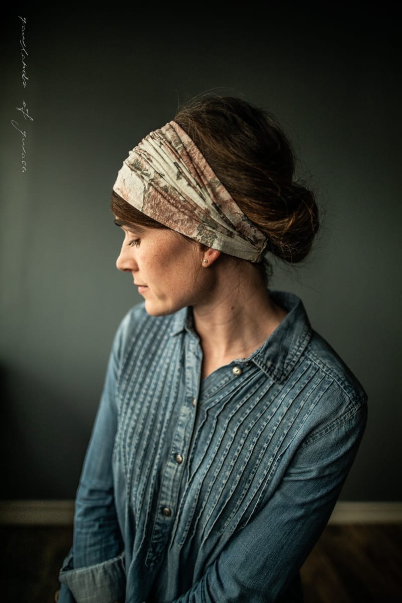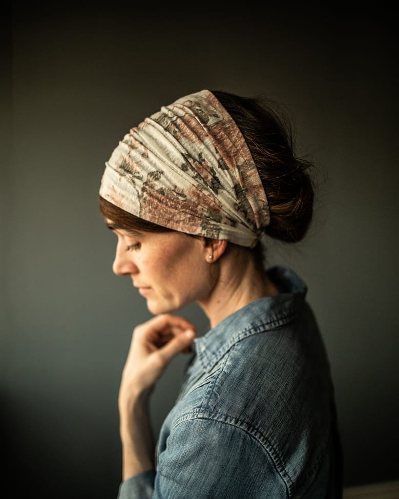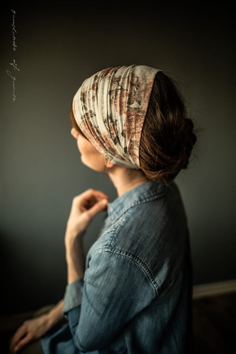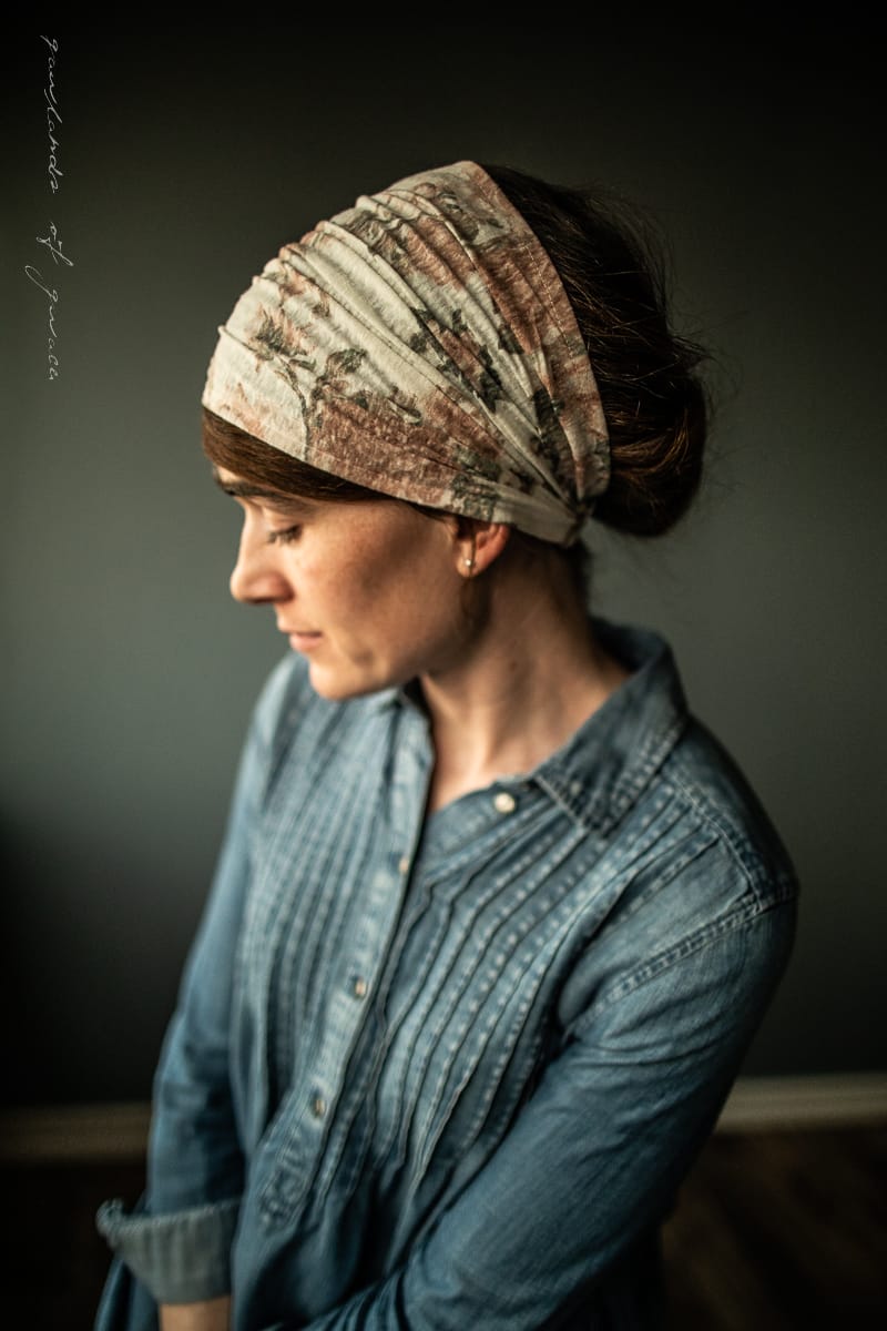 Cecily style cotton headwrap, tie closure, convertible design, wear fully extended for moderate length headcovering or bunched into headband style, approximately 9.5 inches wide