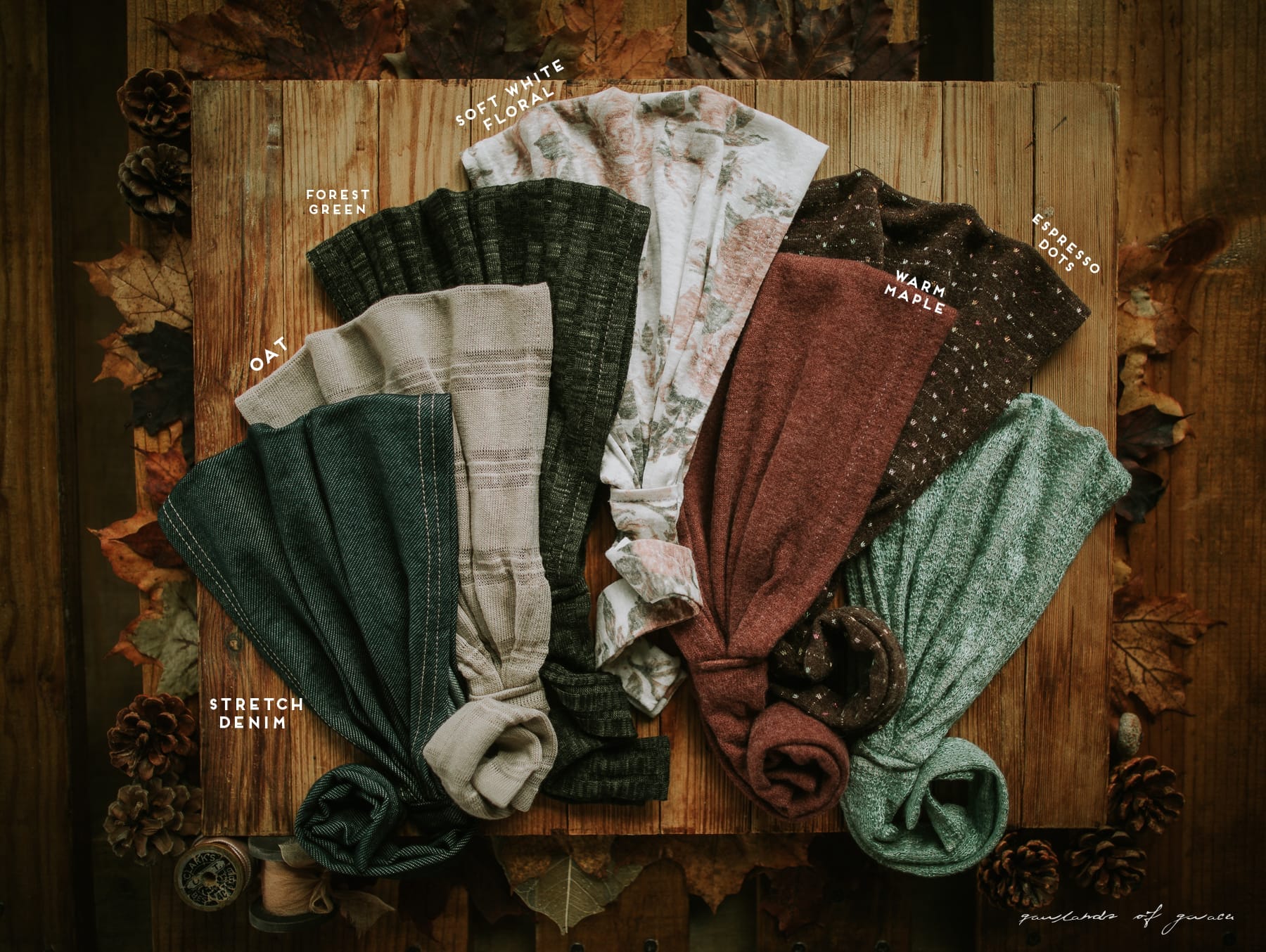 Soft White Floral, Oat, Espresso Dots, Stretch Denim, Warm Maple, Forest Green, Mint |