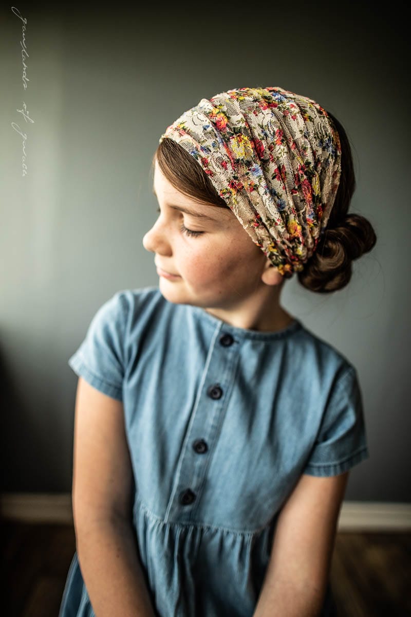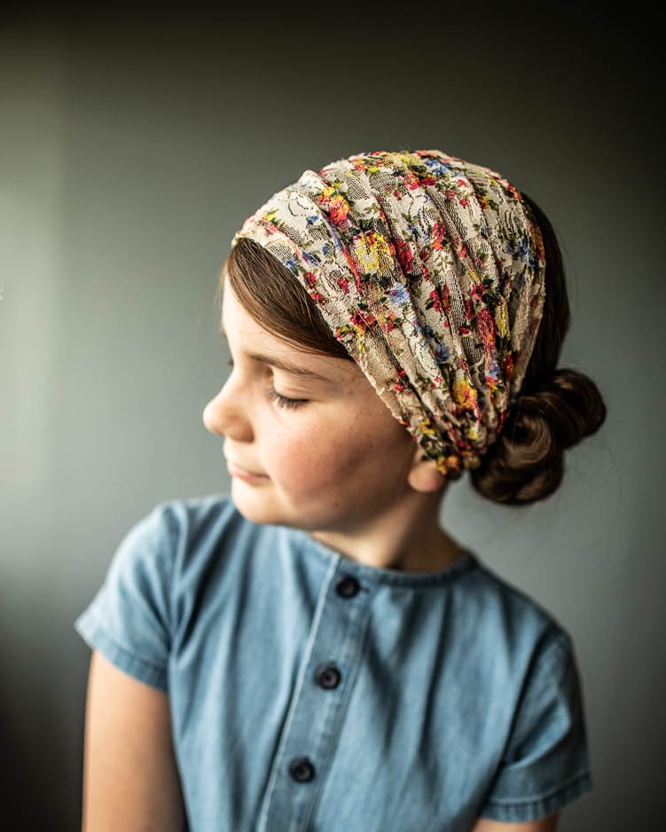 Stretch Cecily Lace Headwrap, Clasp Closure, Convertible Design! Wear fully extended for moderate length headcovering or bunched into a feminine headwrap.