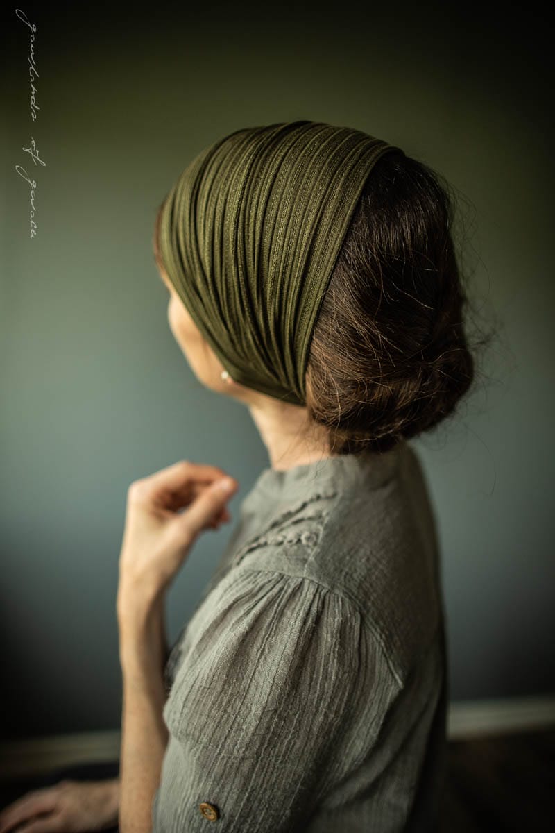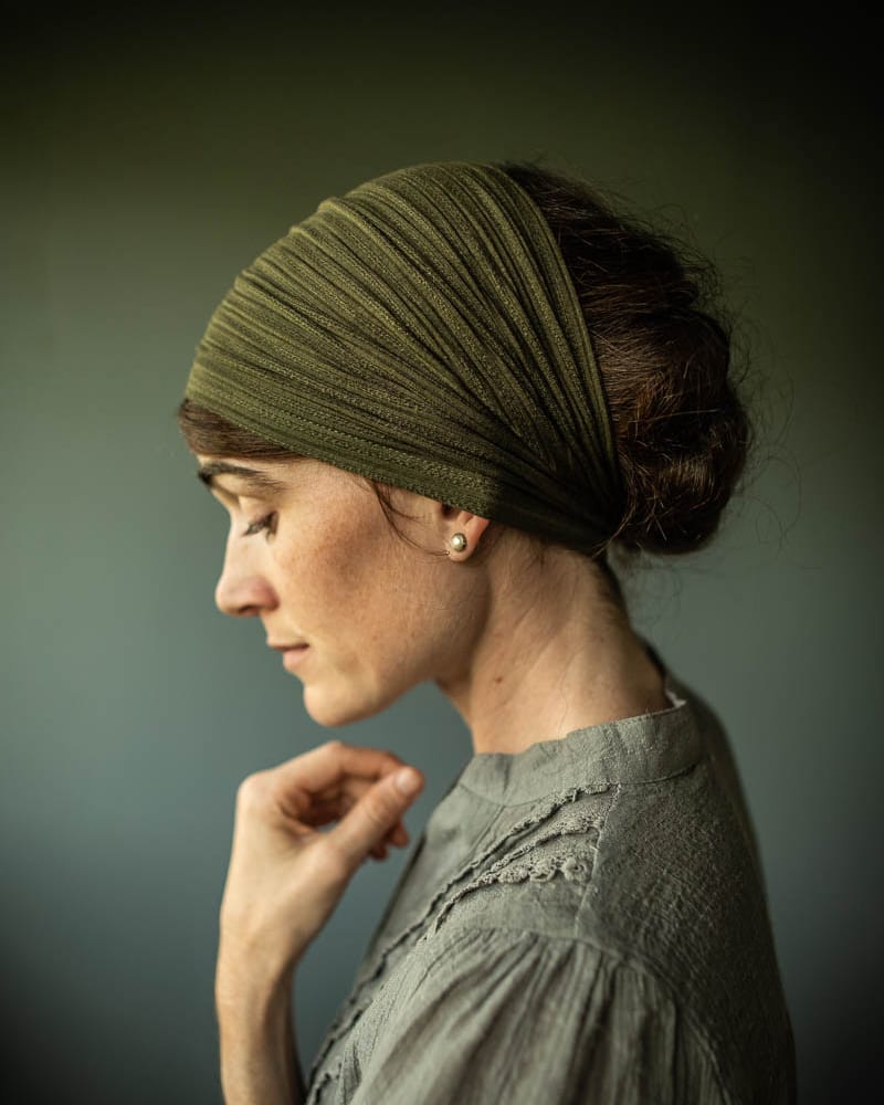 Cecily style Headcoverings, stretch, clasp closure, convertible design, wear fully extended for mid-length headcovering or bunched into headband style
