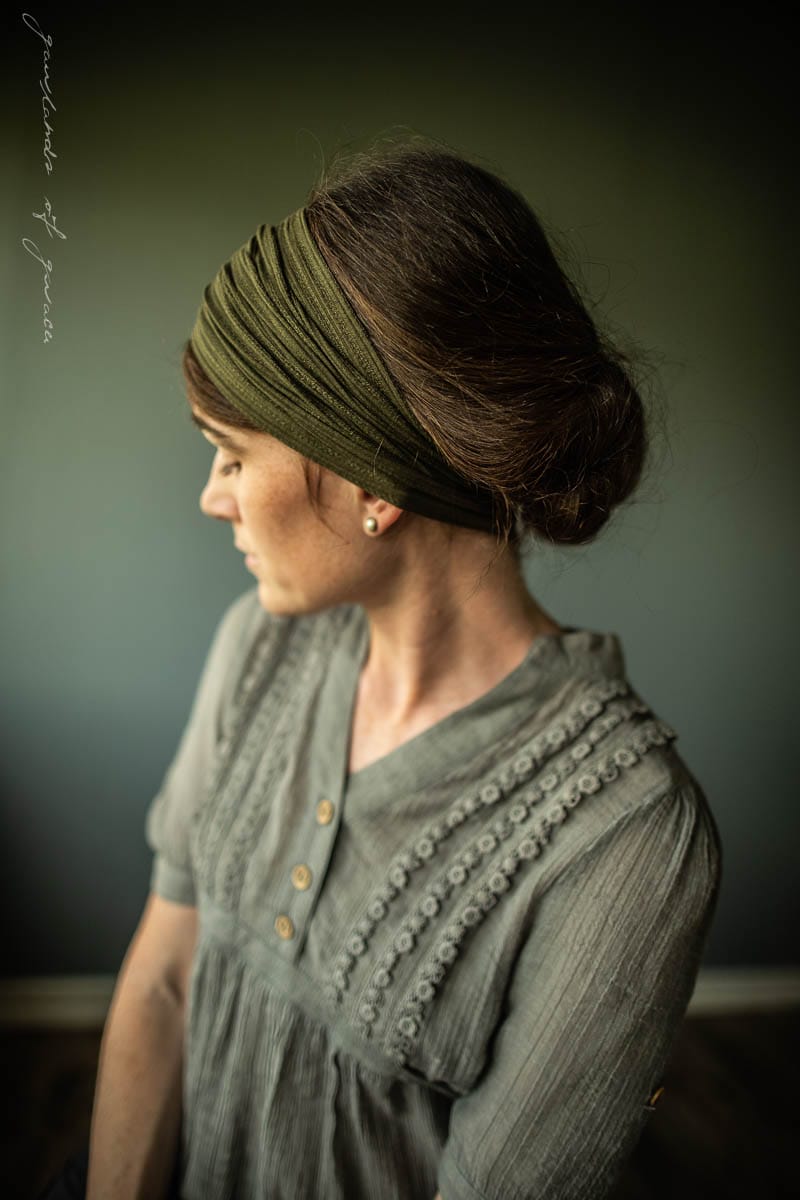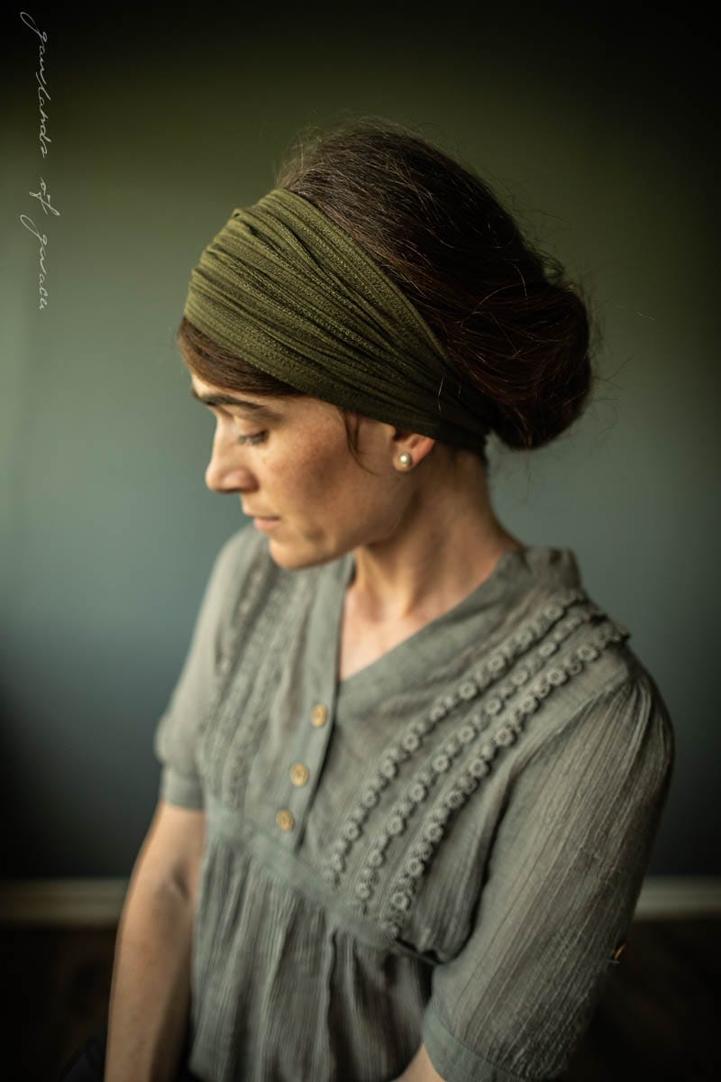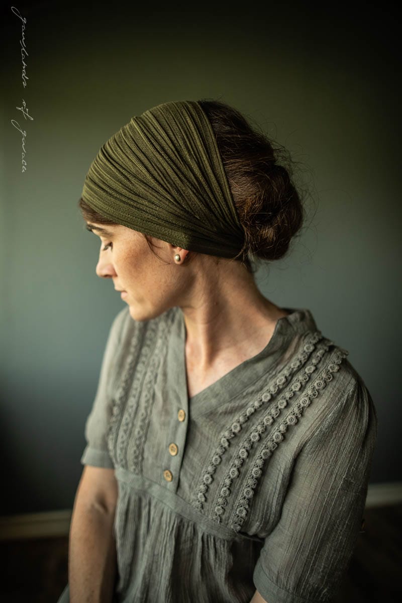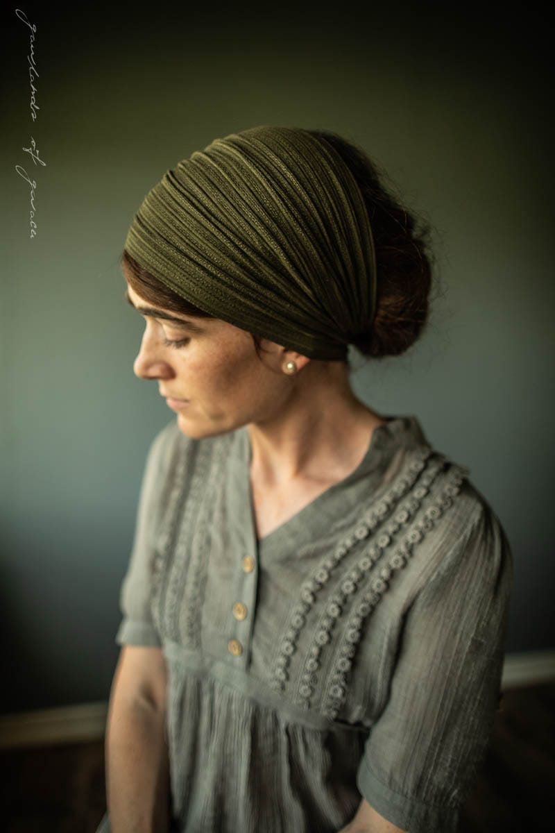 Soft Sweaterknits, breathtaking Florals and feminine florals! Garlands of Grace Classic stretch Cecily hairwrap has arrived in a simply stunning collection filled with pieces fit for any occasion! Stretch Cecily may be worn fully extended as a medium length covering, or bunched into a narrower headband style. Finished with clasp closure for a seamless look. Timeless, flattering and feminine!