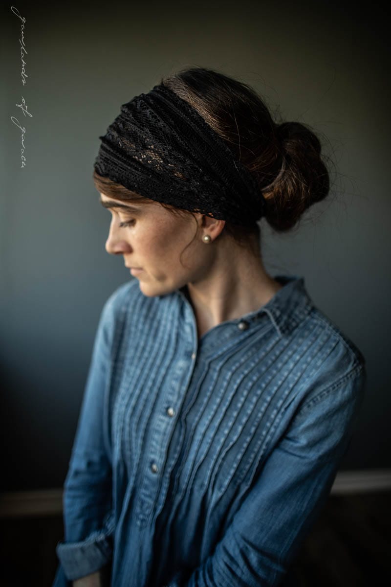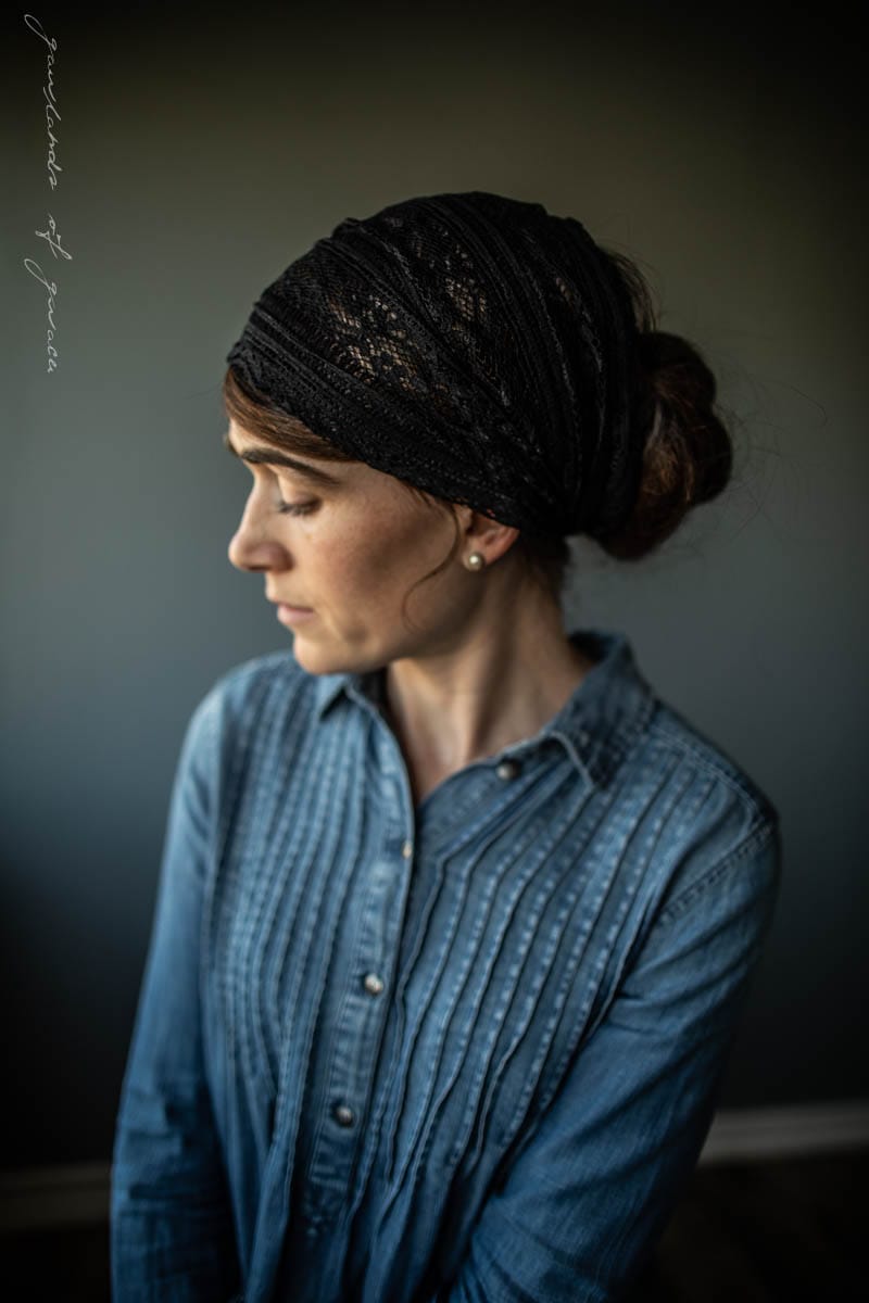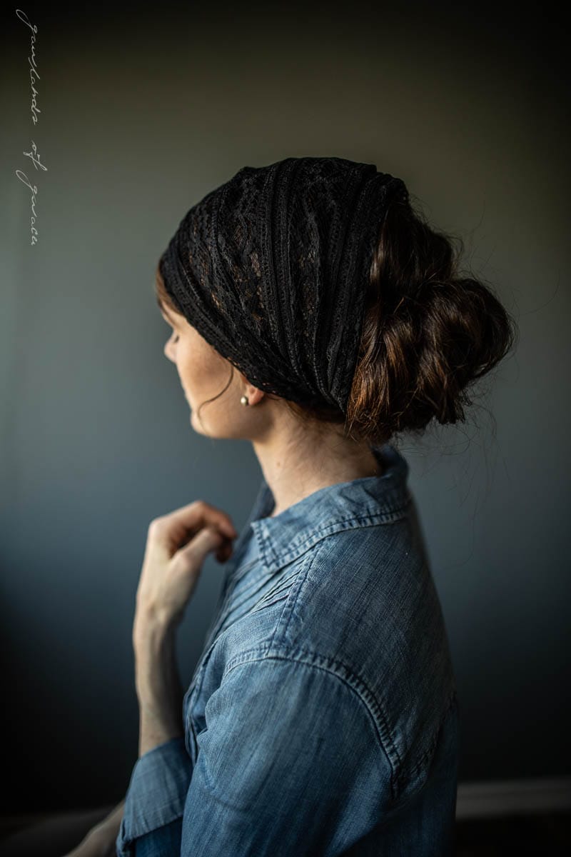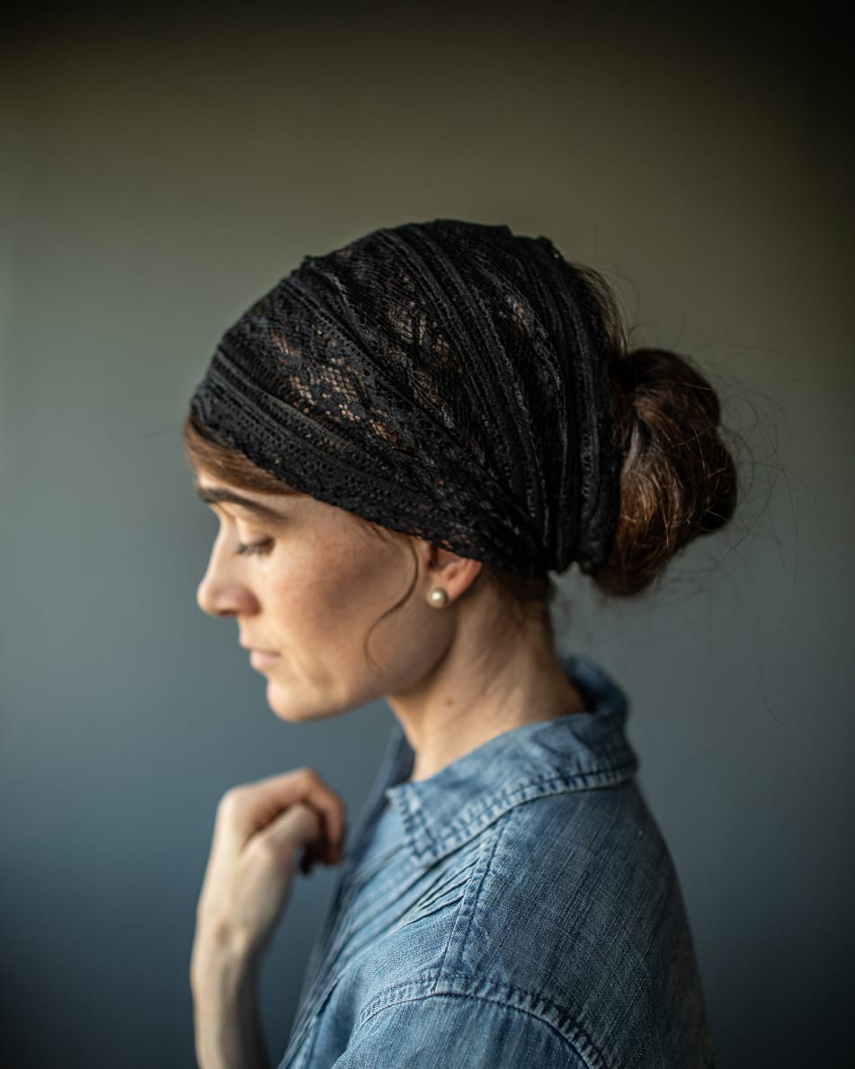 Stretch Cecily Lace Headwrap, Clasp Closure, Convertible Design! Wear fully extended for moderate length headcovering or bunched into feminine headwrap.