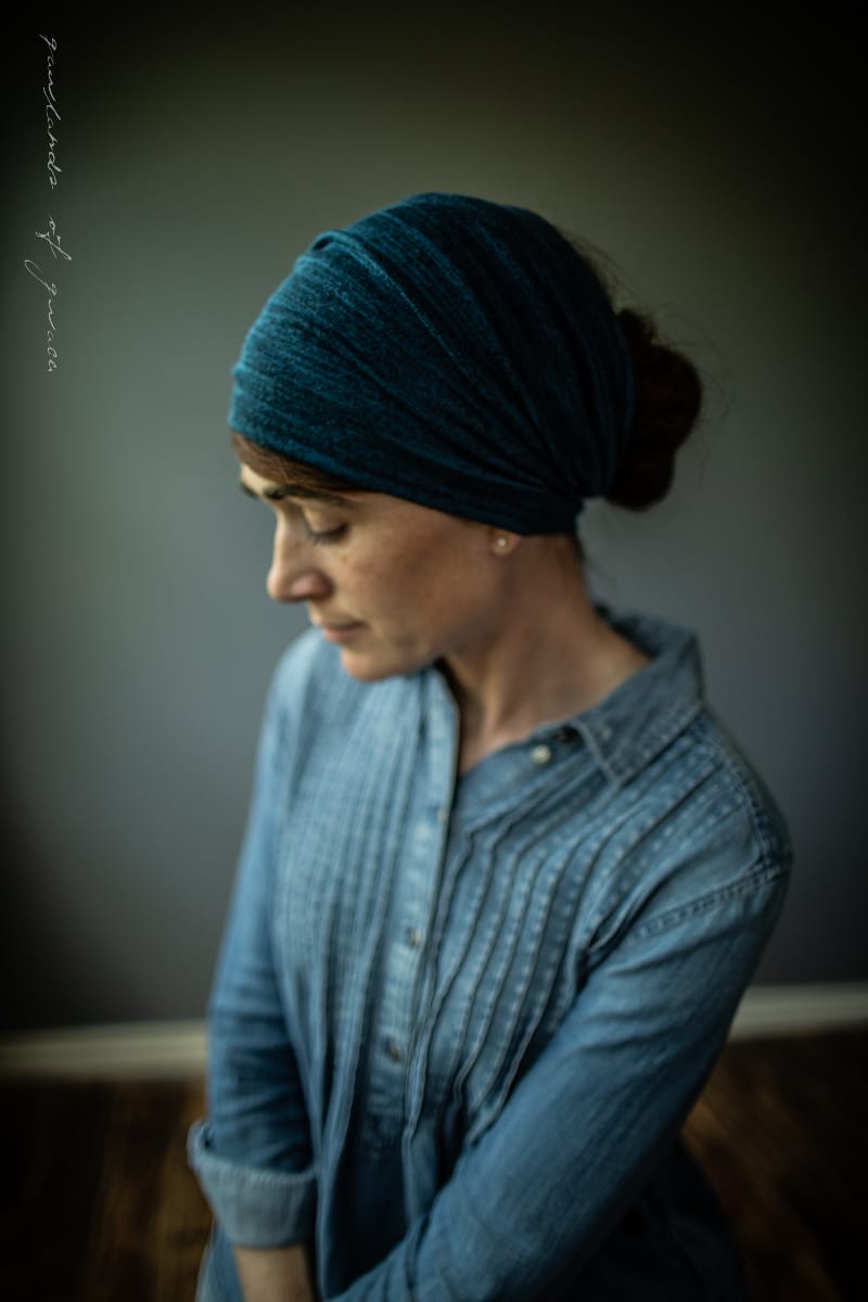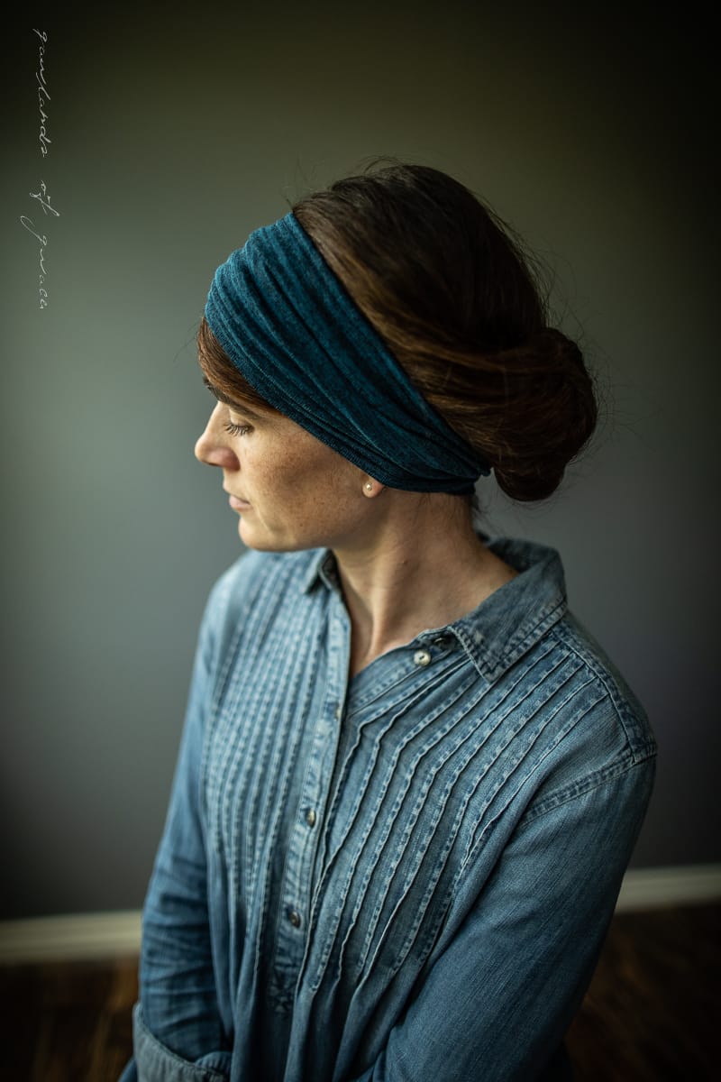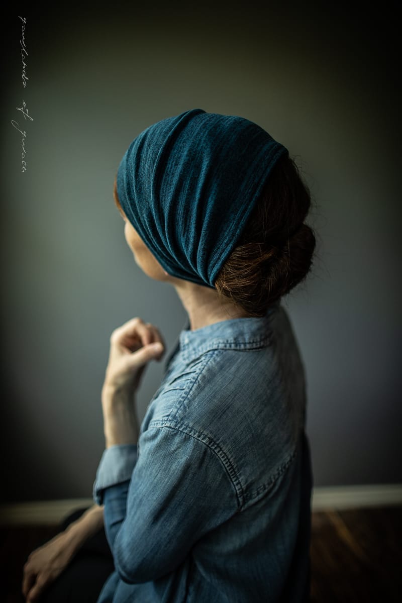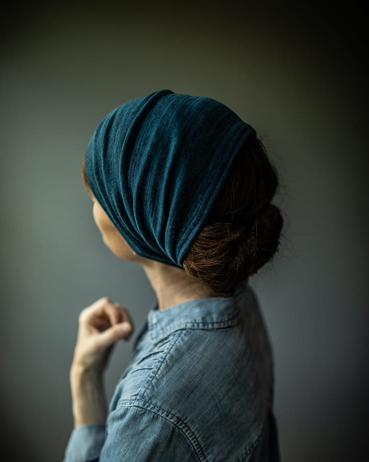 Cecily style Headcoverings, stretch, clasp closure, convertible design, wear fully extended for mid-length headcovering or bunched into headband style