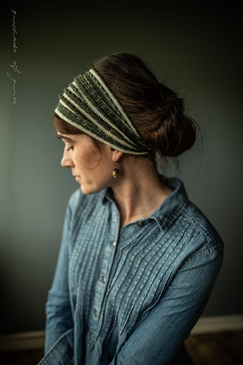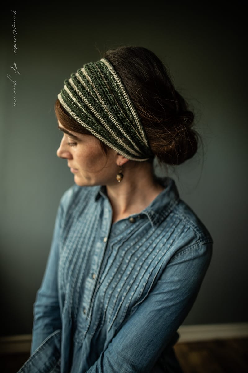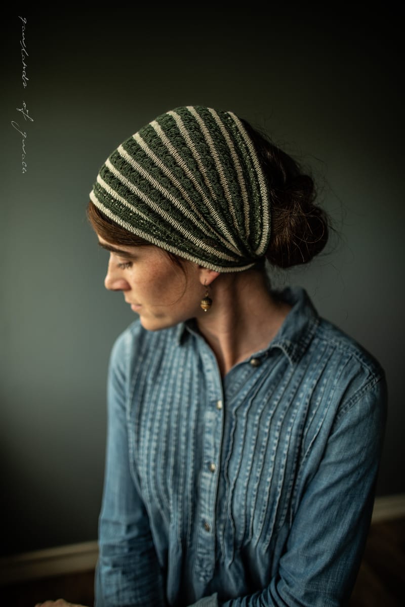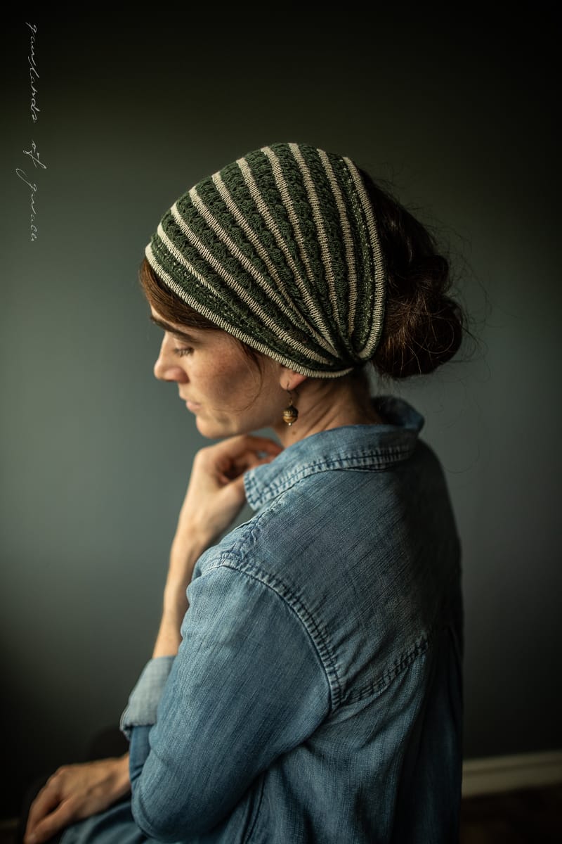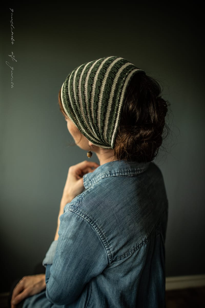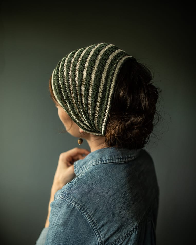 Cecily style Headcoverings, stretch, clasp closure, convertible design, wear fully extended for mid-length headcovering or bunched into headband style