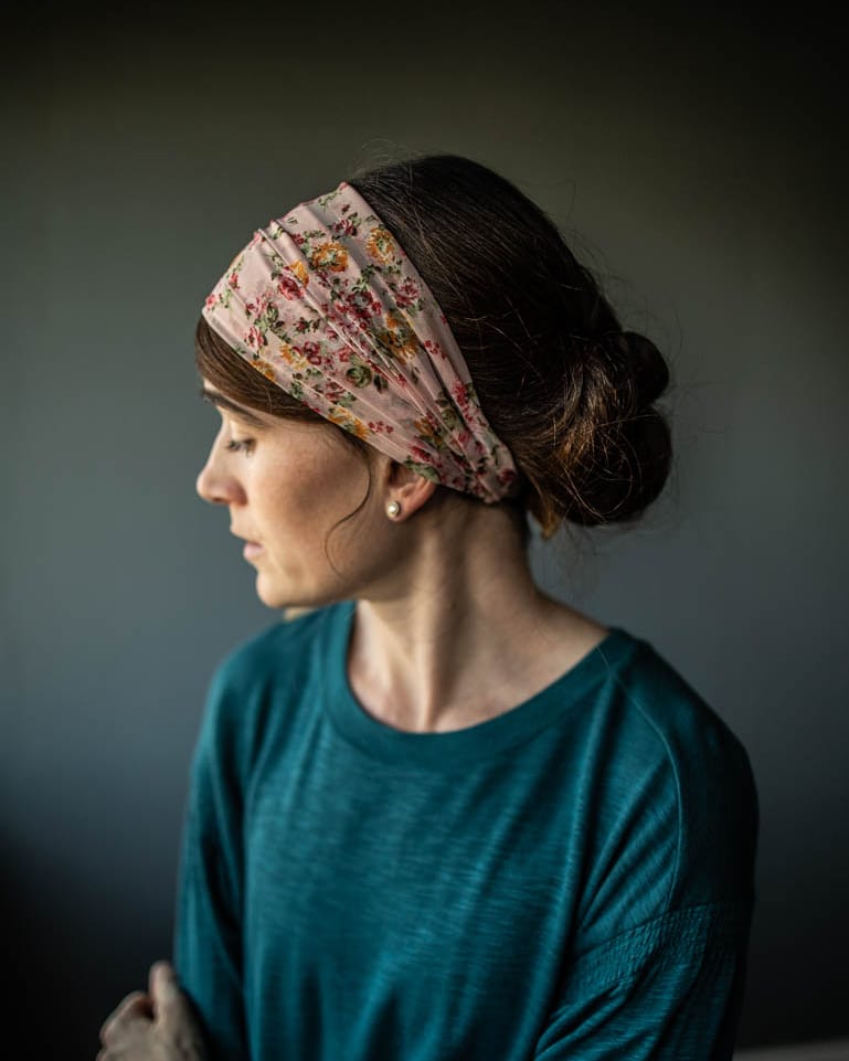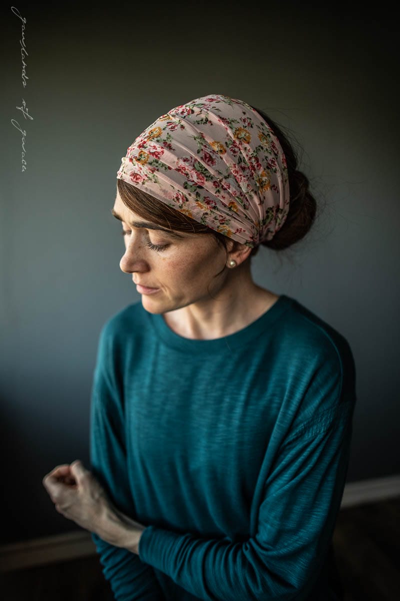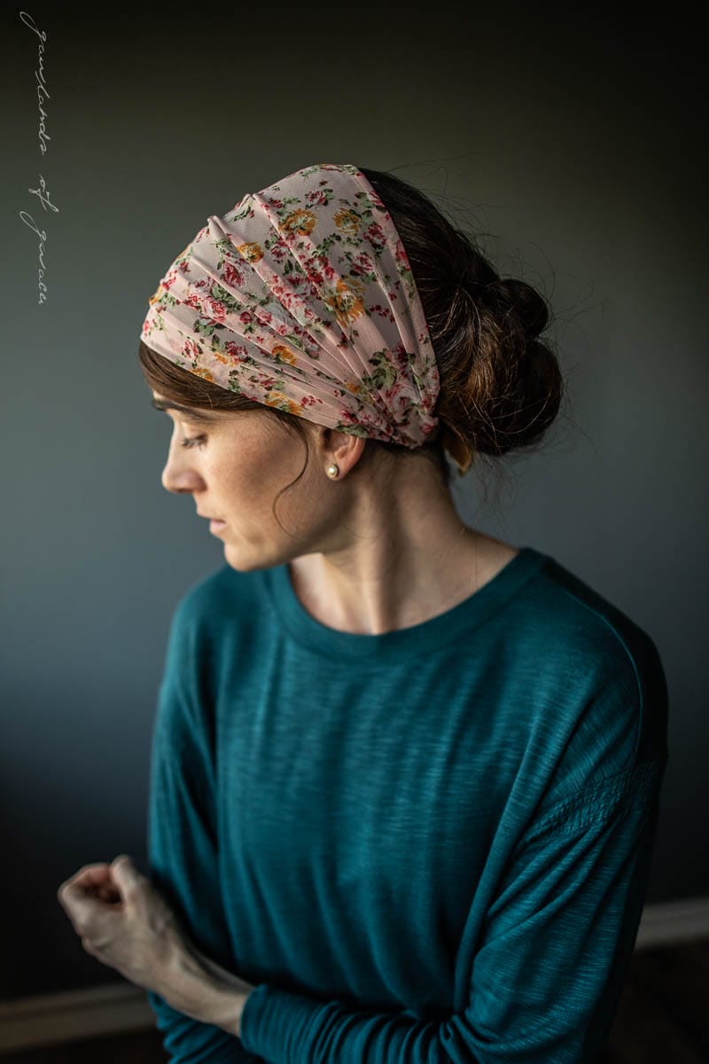 Because the lovely and elegant weight of chiffon provides the most flattering fit! Garlands of Grace offers our bestselling chiffon style hair wrap in a breathtaking array of timeless feminine florals! Wear as a medium length covering or pull into a narrower headband style. Stay Put Lining has been added to help keep your covering from slipping! Tie Closures offer a comfortable, custom fit.