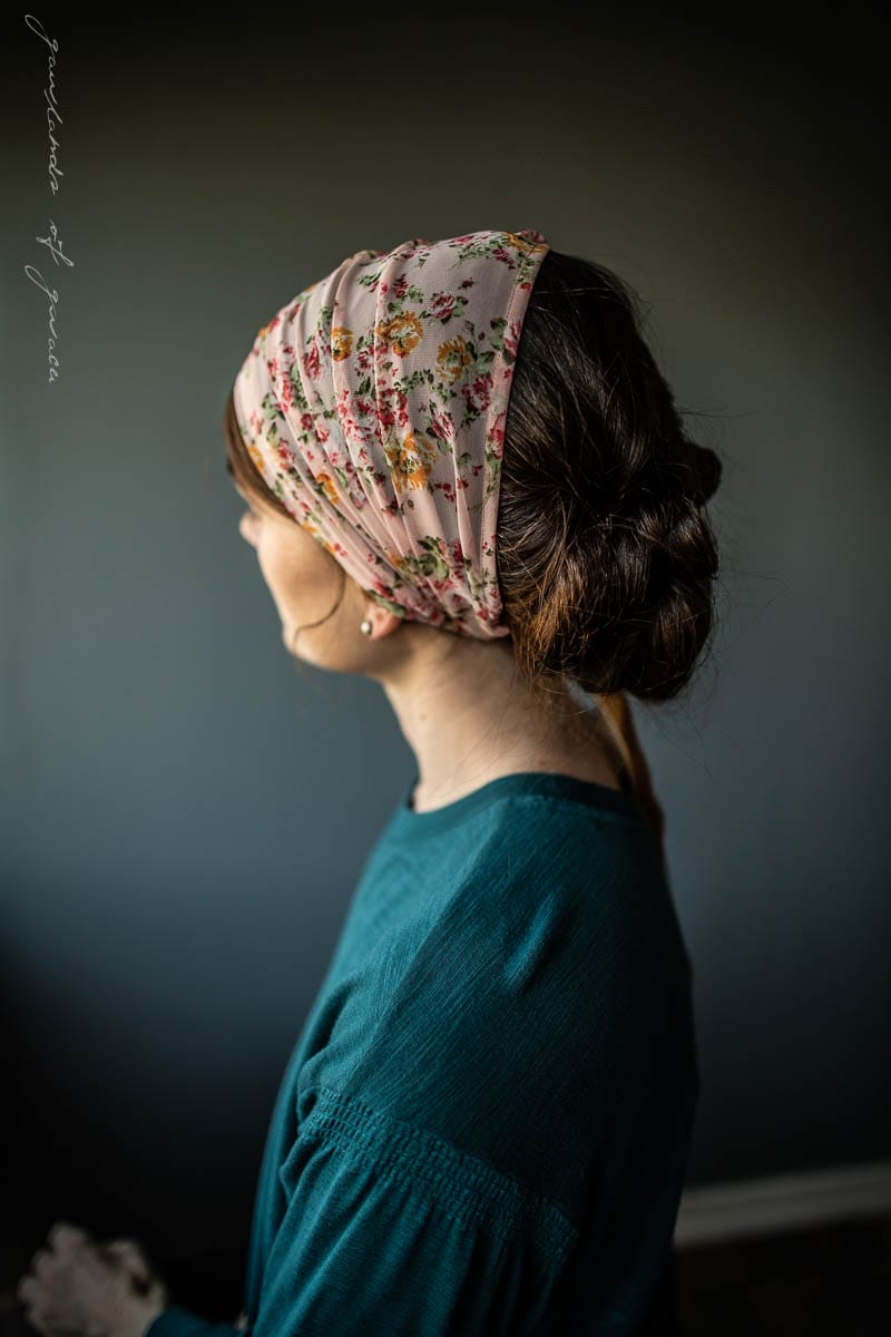 Lightweight Floral Chiffon Cecily Headcovering style, tie closure, No-Slip lining added, Convertible Design, wear fully extended for moderate length headcoverings or bunched into vintage style headband