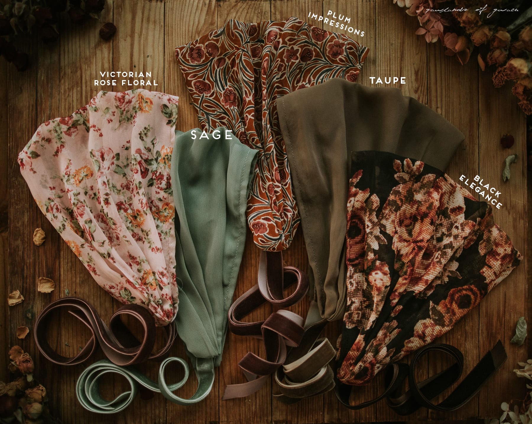 Black Elegance, Sage, Victorian Rose Floral, Taupe, Plum Impressions, Rose Dust, Pure White, Cappuccino |