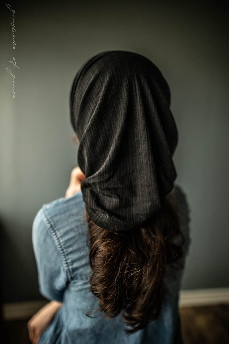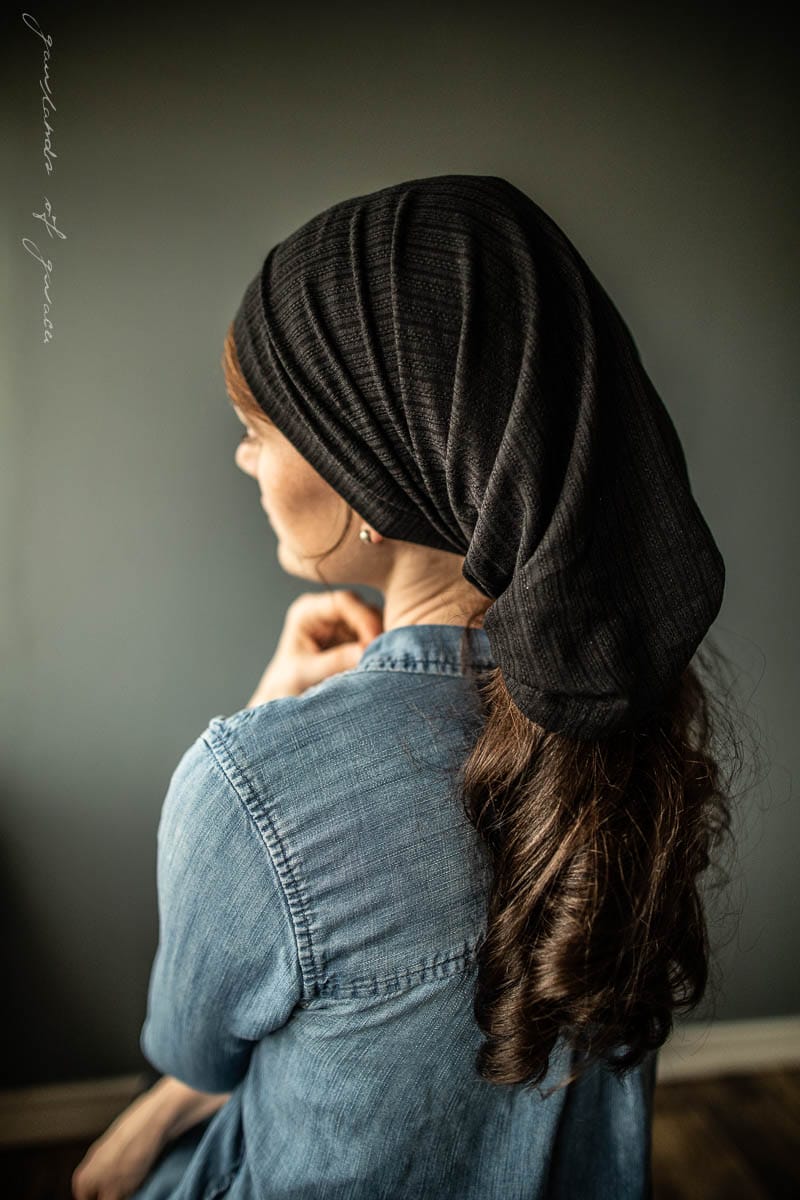 Long Sweaterknit Cowl Headwraps and headcoverings, Clasp Closure, Convertible Design, wear fully extended for full-coverage headcovering or bunched into headband style