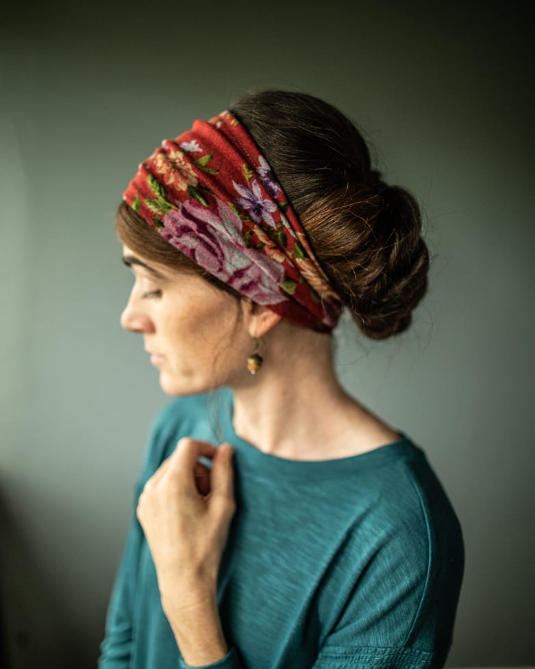 Essential textured solids, soft sweater knits and breathtaking Floral prints! Garlands of Grace Classic Stretch Katherine hairwrap has arrived in a simply stunning collection fit for any occasion! Katherine may be worn fully extended as a smooth, wide headband. Simply pull taught to achieve a narrower hairwrap style. Finished with a clasp closure for a seamless look. Timeless, flattering and feminine.