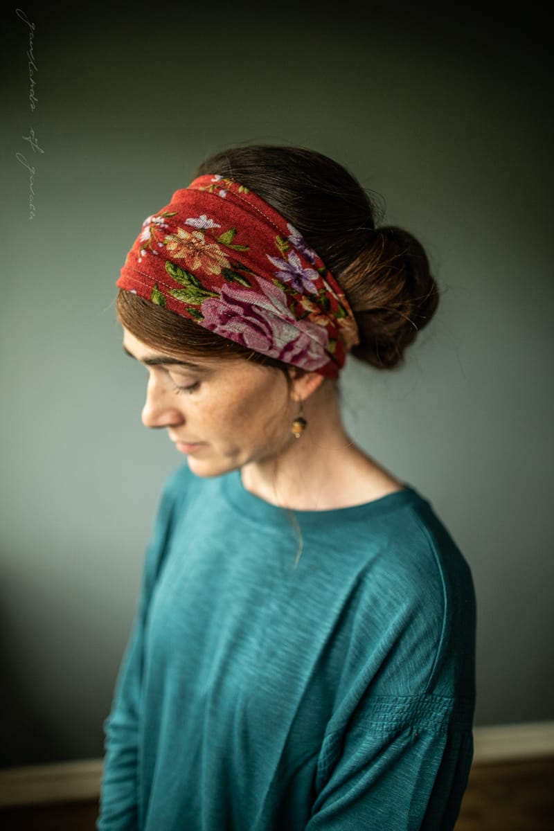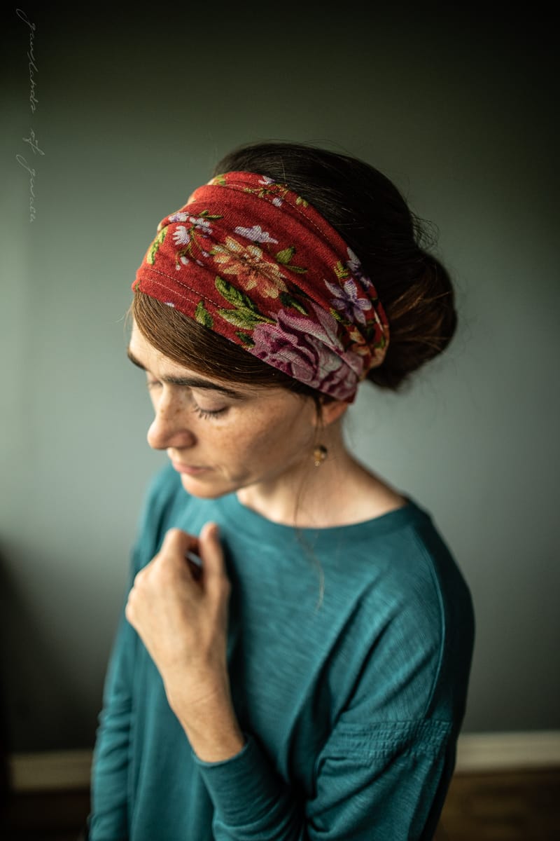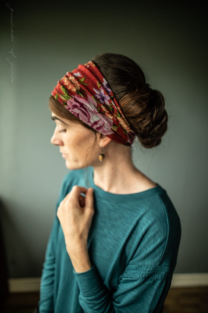 Classic Stretch Katherine style headband, forals, clasp closure, Stretch knit, comfortable design, approximately 5 inches in width