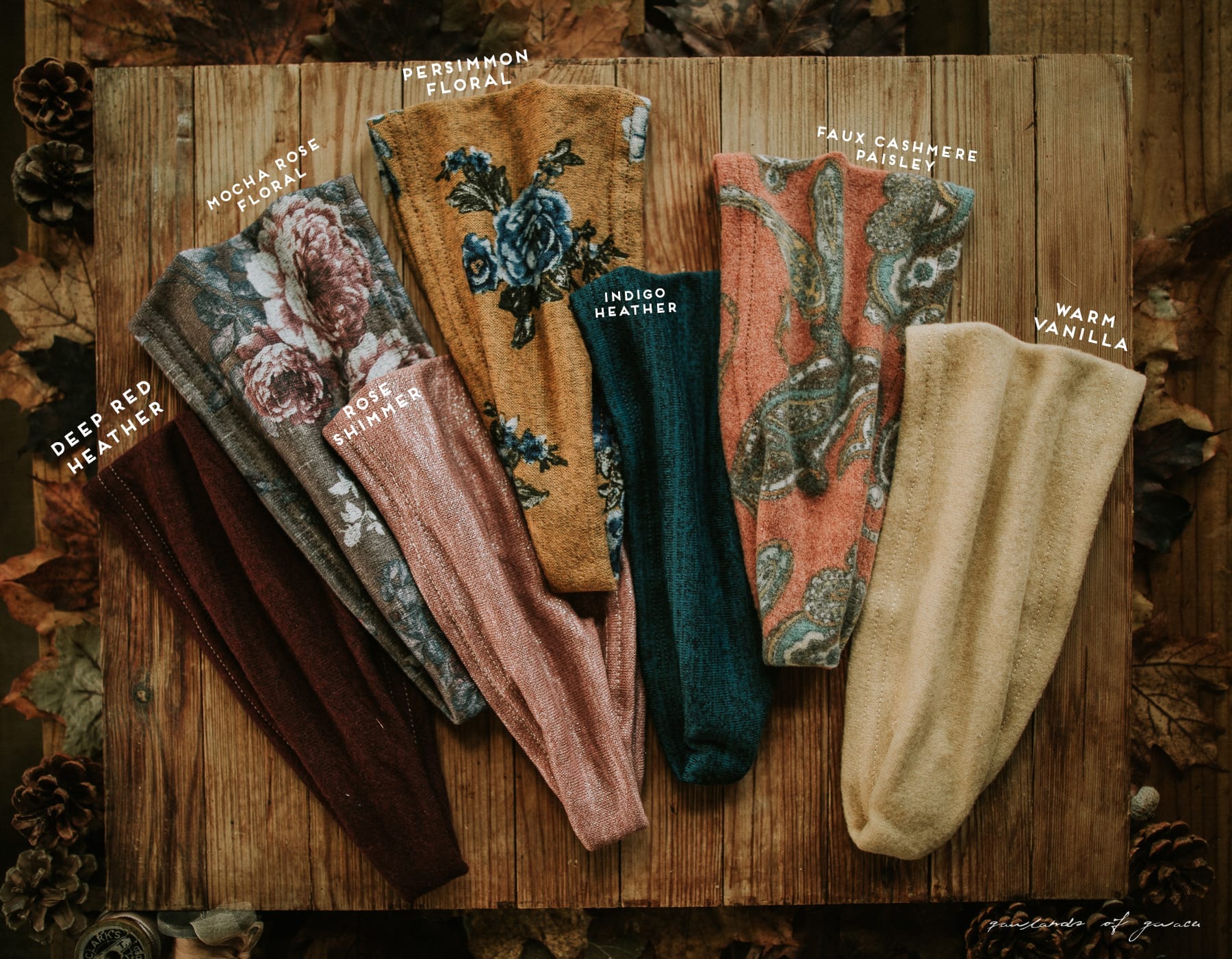 Deep Red heather, Warm Vanilla, Mocha Rose, Deep Indigo, Rose Shimmer, Faux Cashmere Paisley, Persimmon Floral, Mocha Rose Floral |
