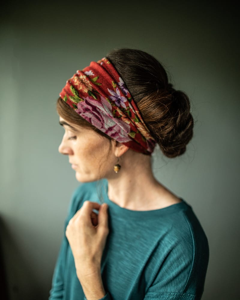 Feminine textured solids and breathtaking Floral prints! Garlands of Grace Classic Stretch Katherine hairwrap has arrived in a simply stunning collection fit for any occasion! Katherine may be worn fully extended as a smooth, wide headband. Simply pull taught to achieve a narrower hairwrap style. Finished with a clasp closure for a seamless look. Timeless, flattering and feminine.