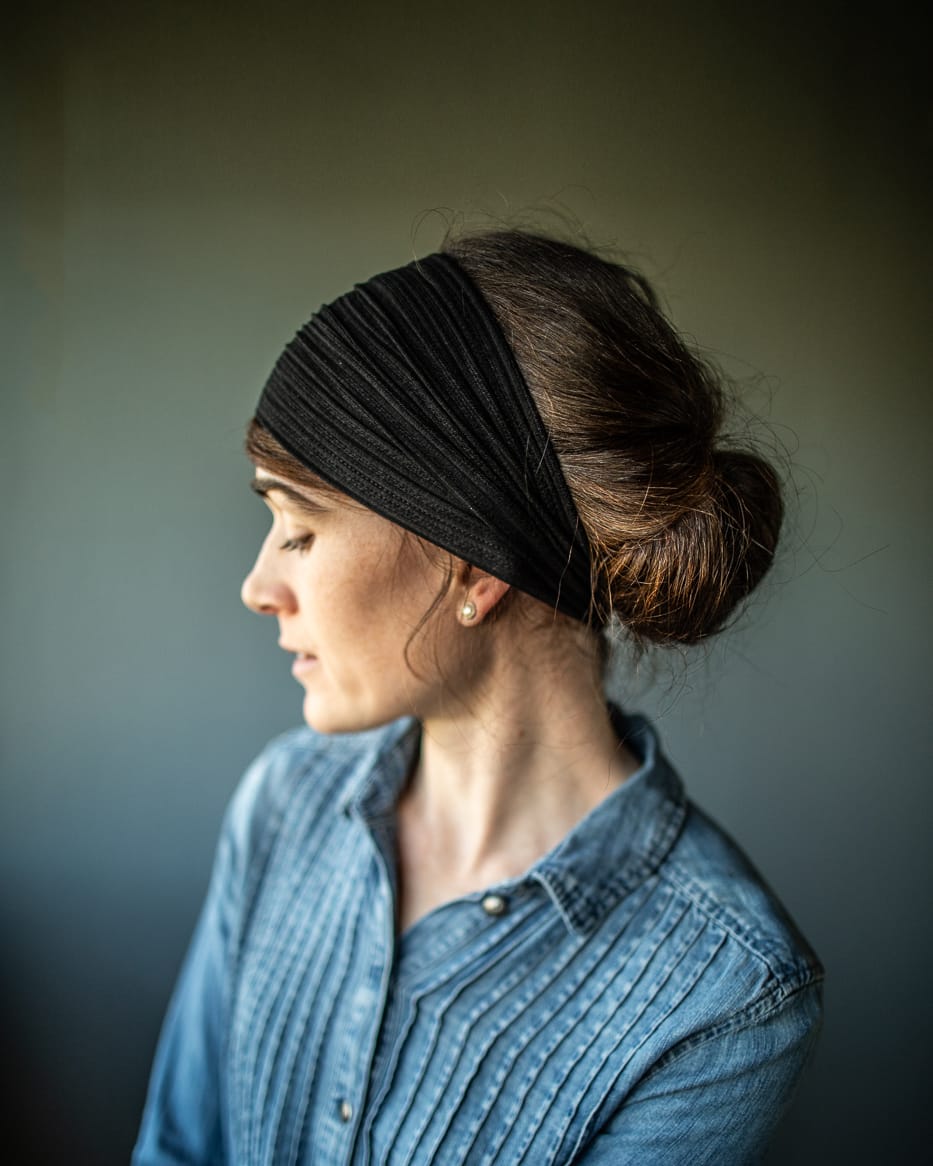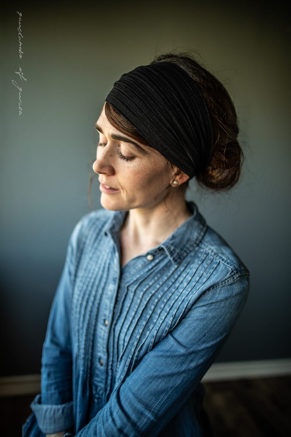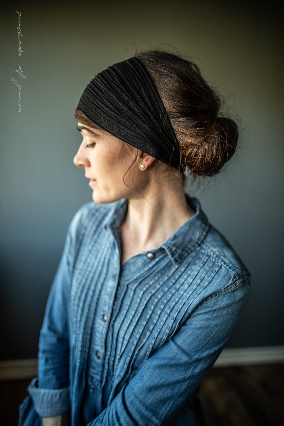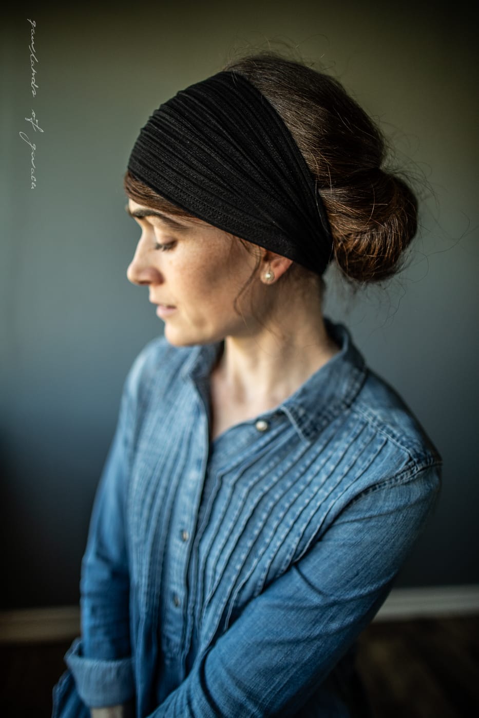 Feminine textured solids and breathtaking Floral prints! Garlands of Grace Classic Stretch Katherine hairwrap has arrived in a simply stunning collection fit for any occasion! Katherine may be worn fully extended as a smooth, wide headband. Simply pull taught to achieve a narrower hairwrap style. Finished with a clasp closure for a seamless look. Timeless, flattering, and feminine.