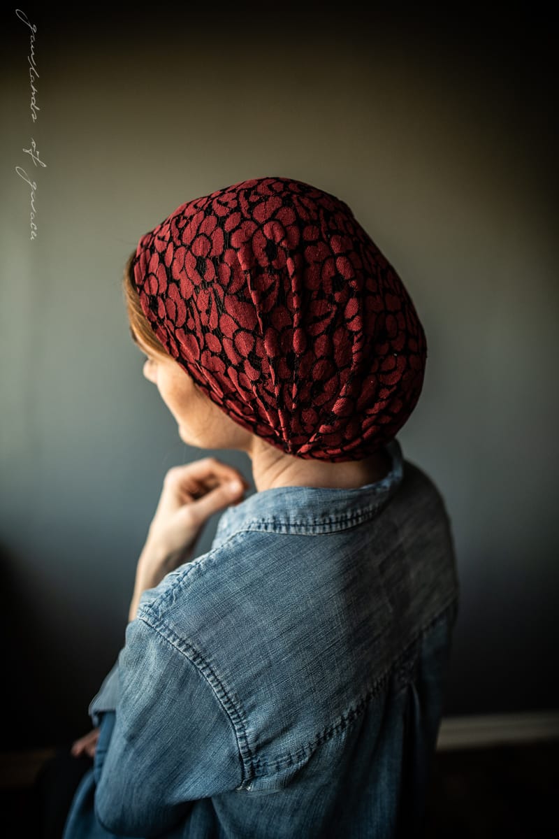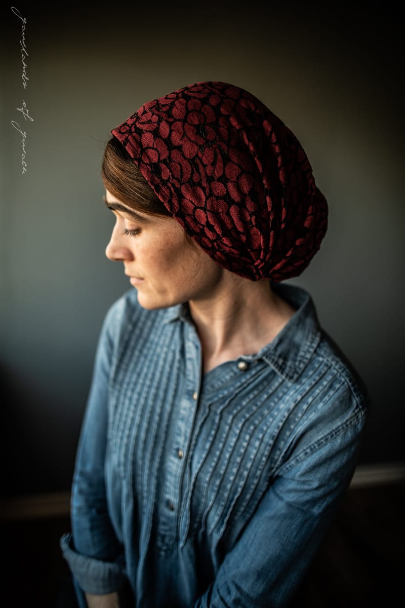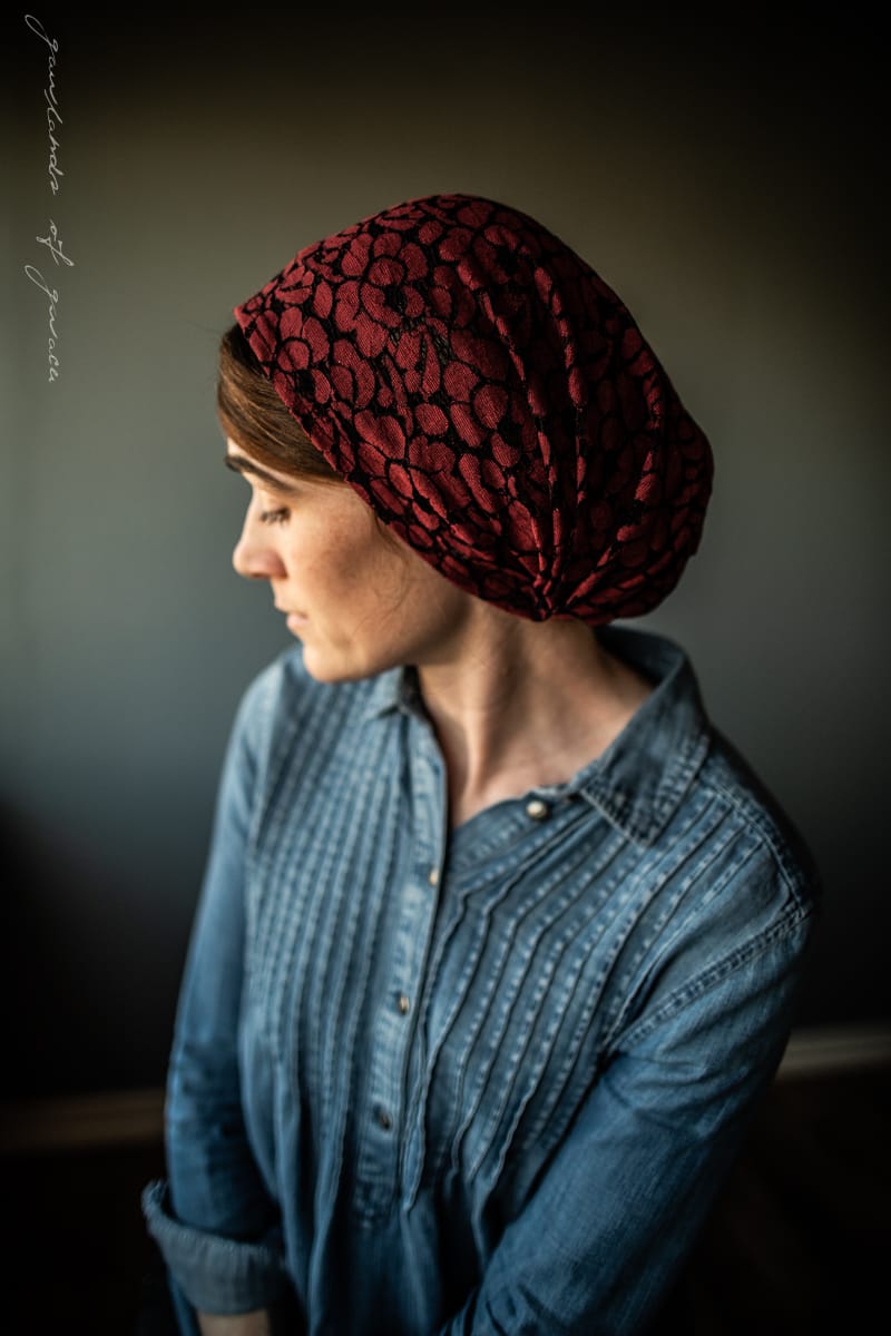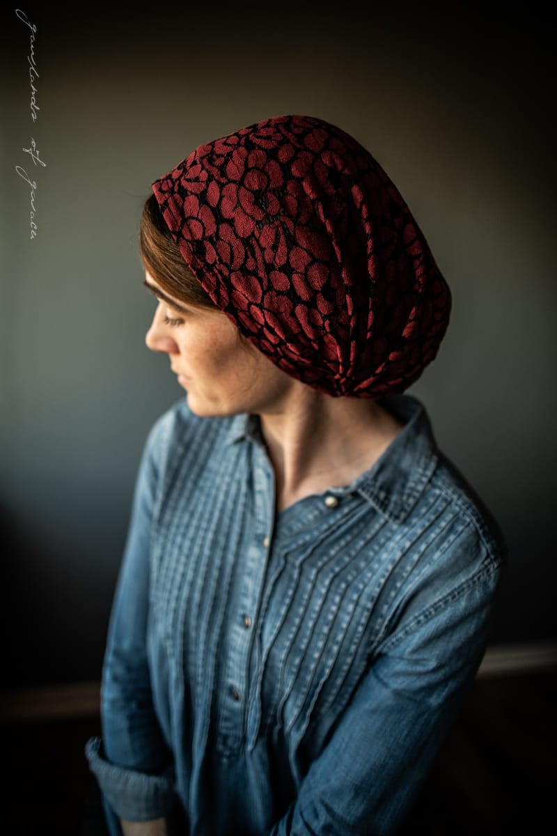 Keep hair back without ties! Meg’s classic Victorian style snood covering is offered this season in a collection featuring the softest stretch and loveliest lace! Meg’s hairwrap offers full coverage and is made to wrap the head and fasten at the base of the neck with Garlands of Grace signature Tie Closure. Truly one of a kind!