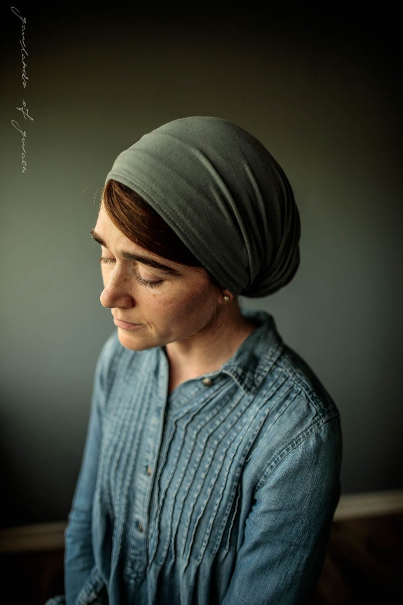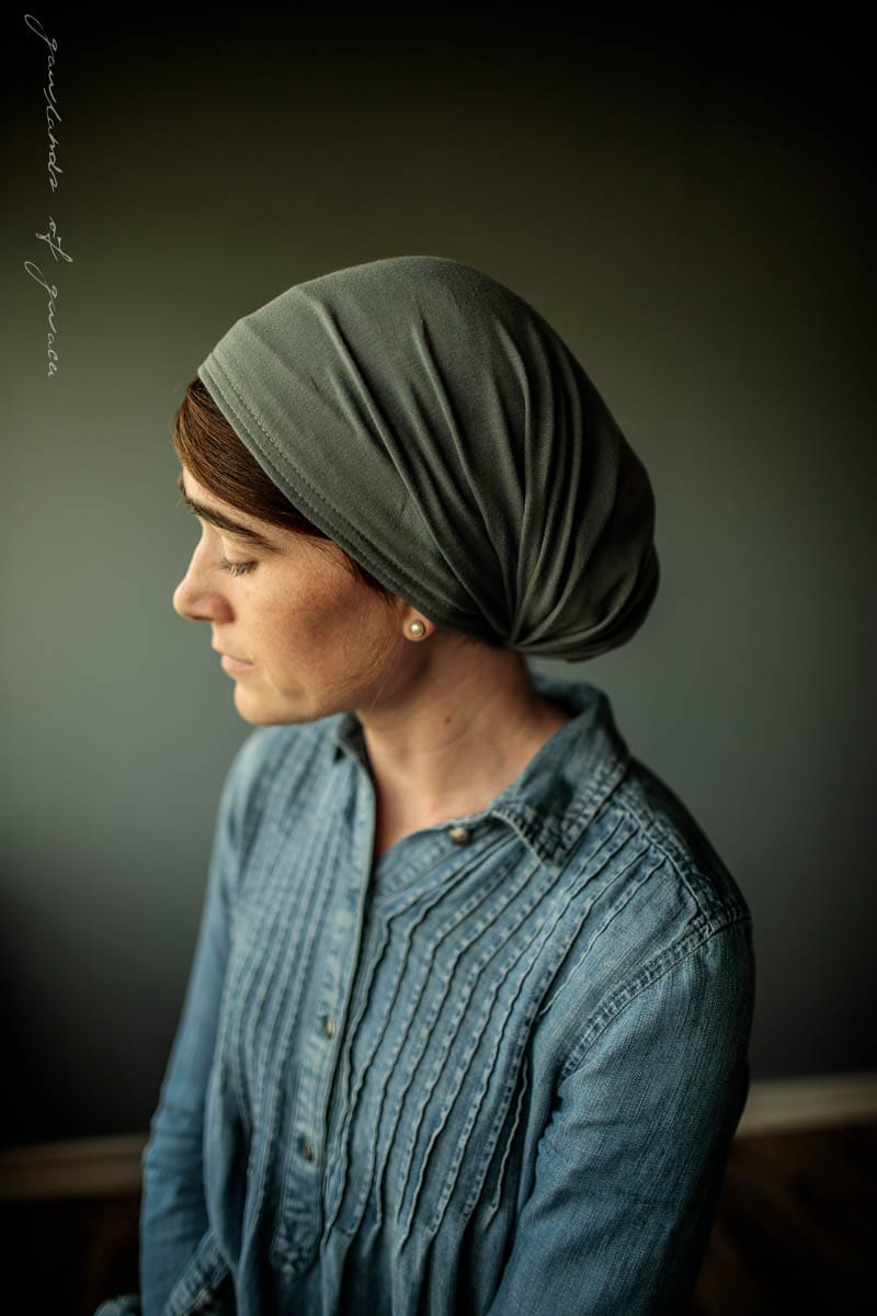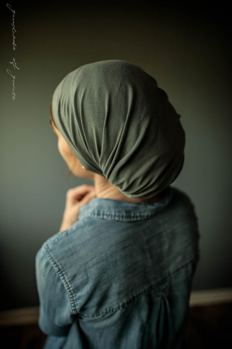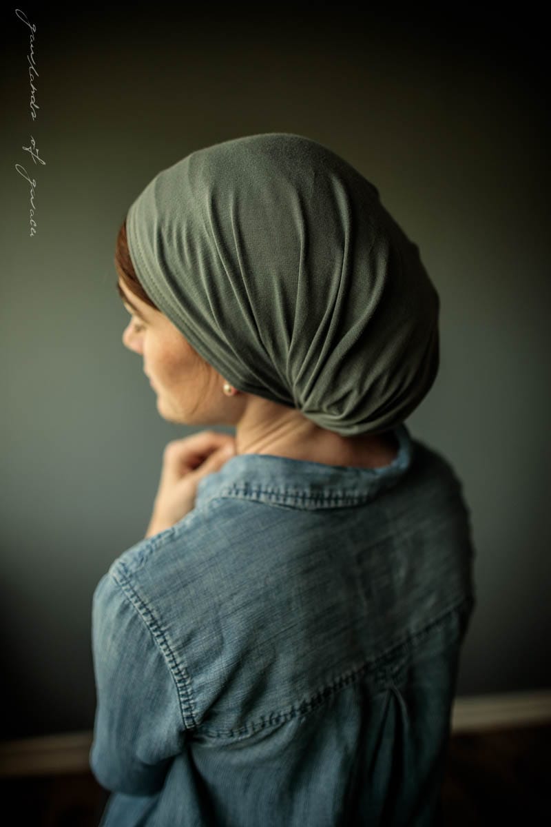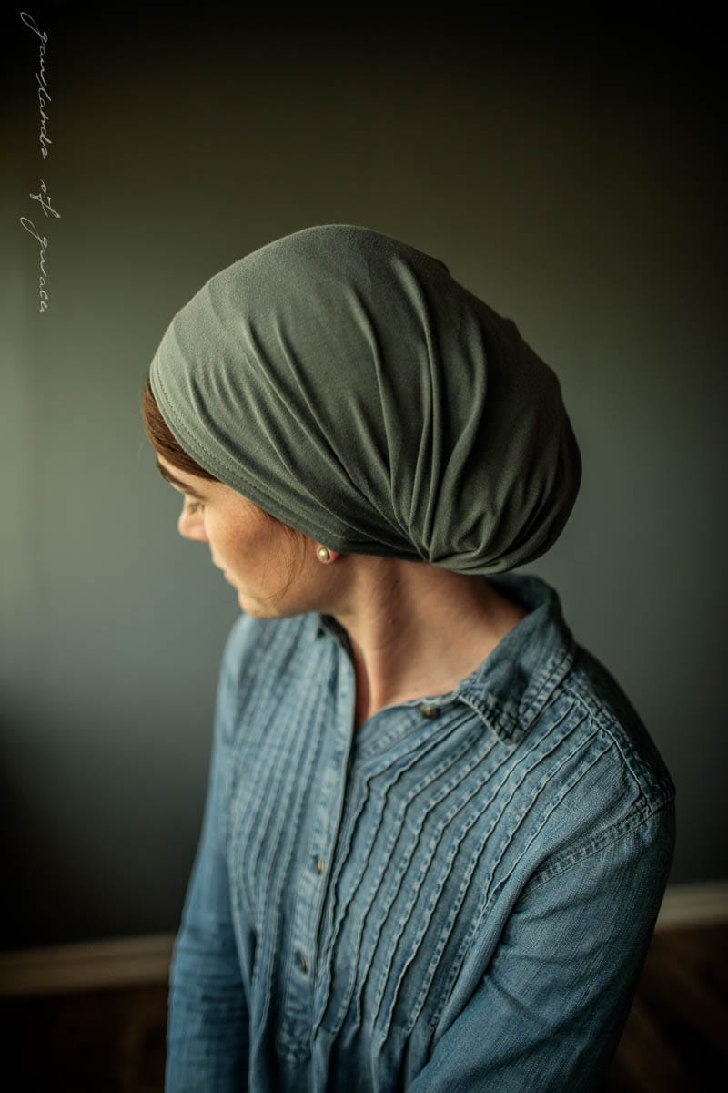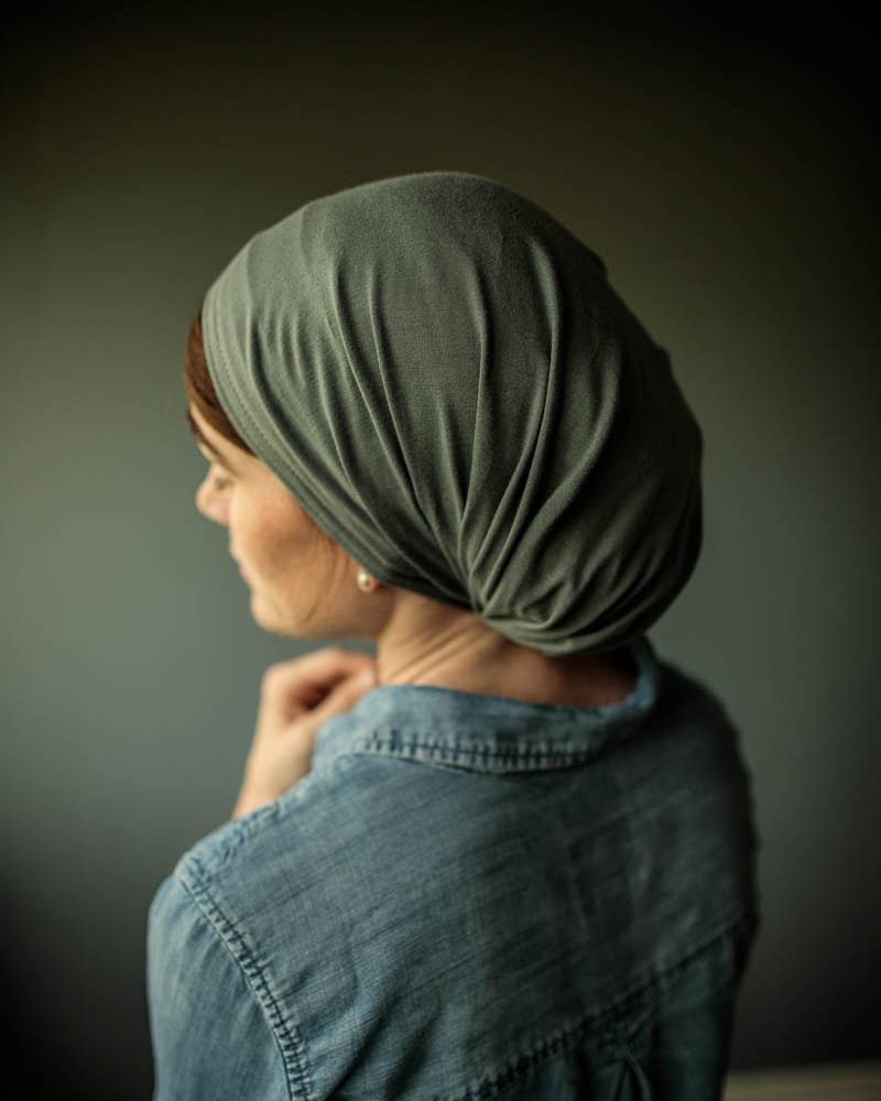 Snood style headcovering, tie closure, soft stretch knit, no slip design, full coverage