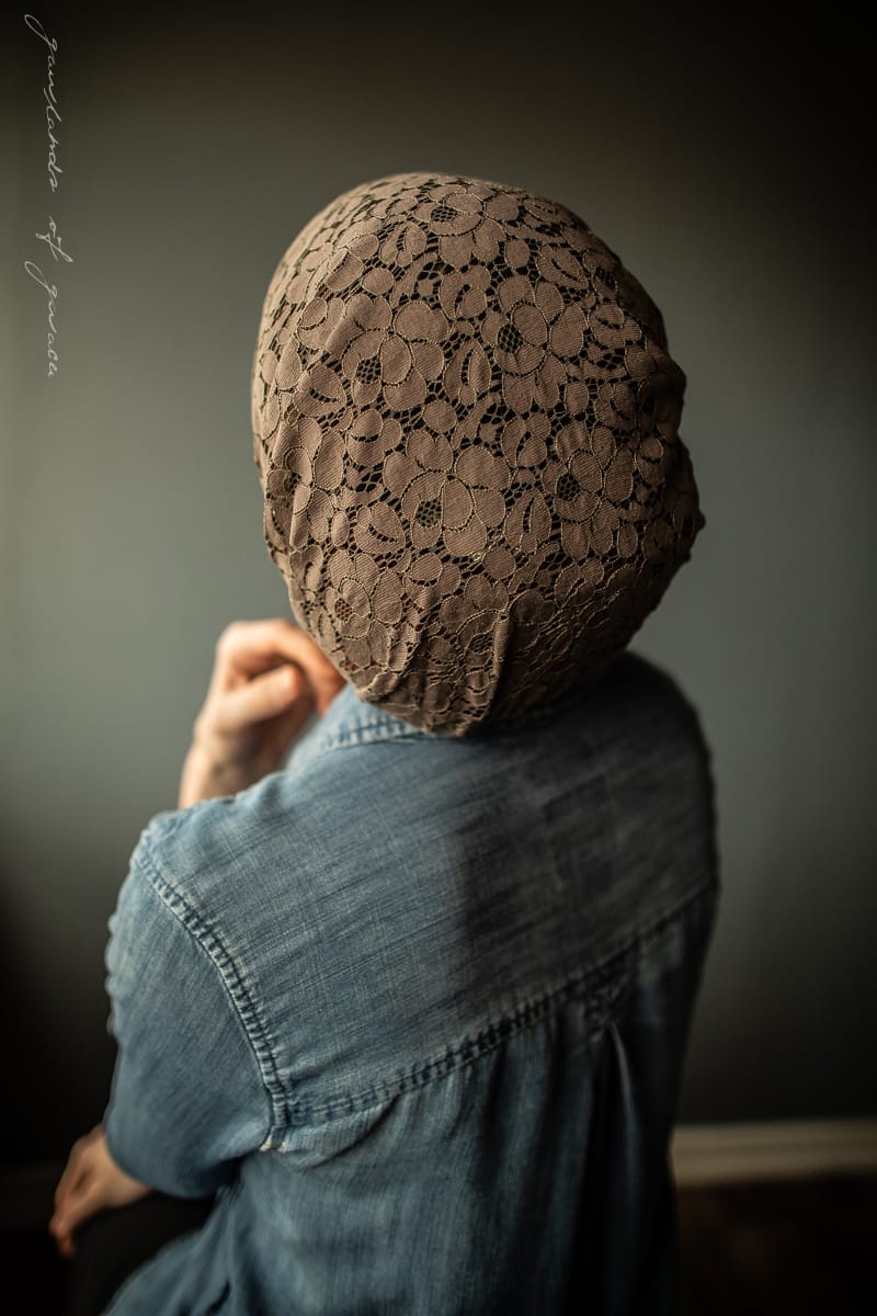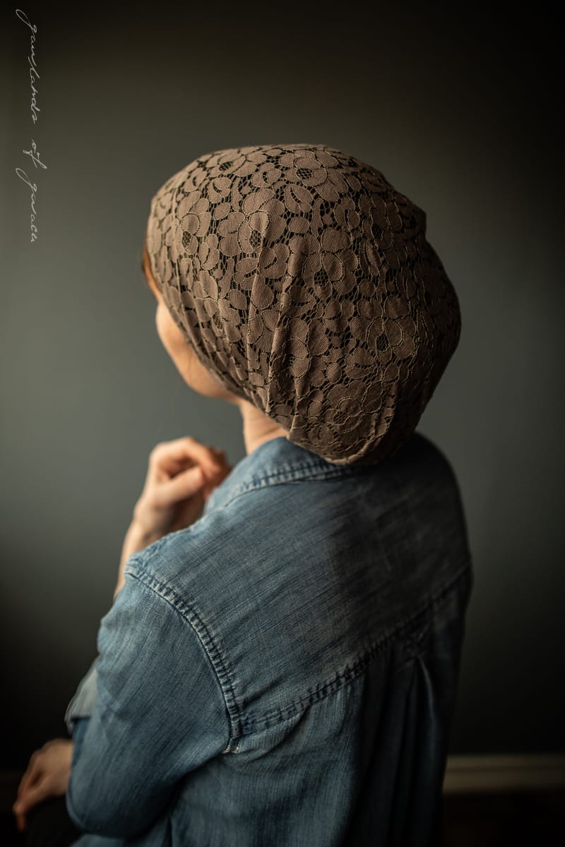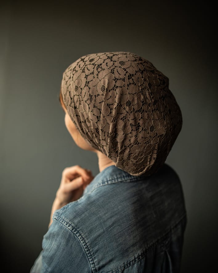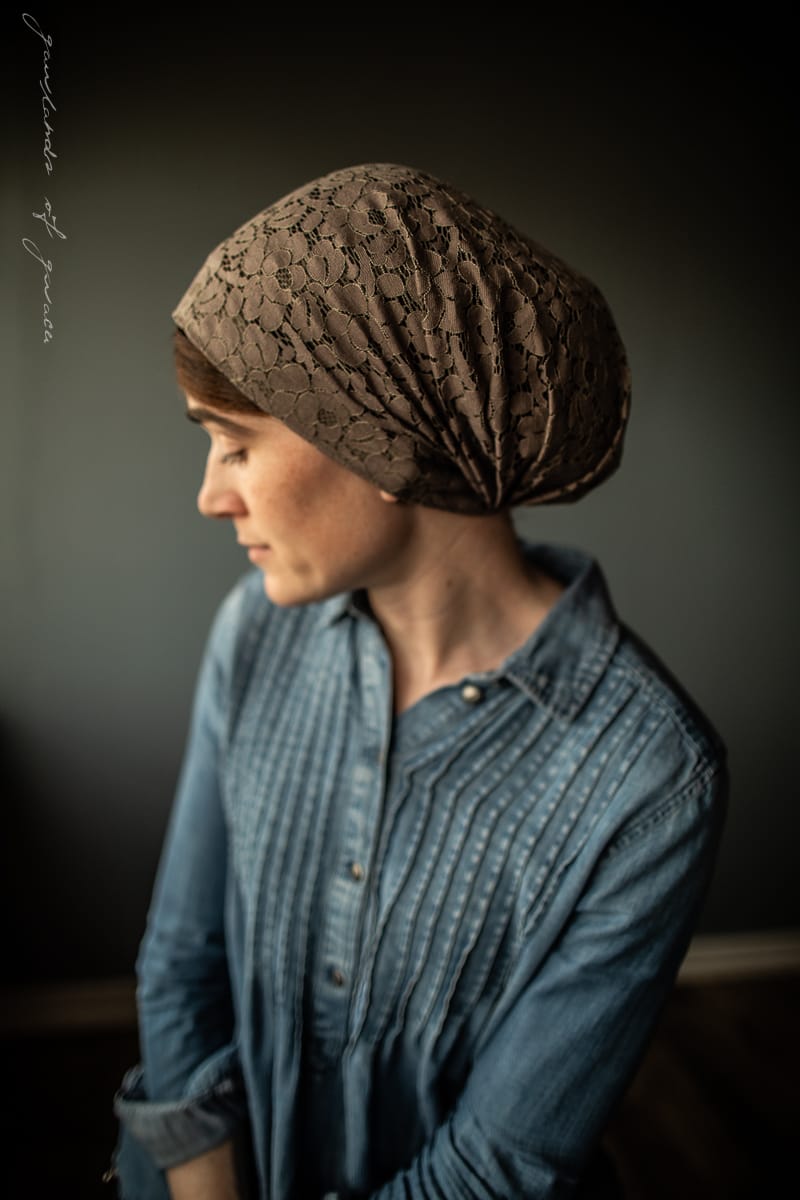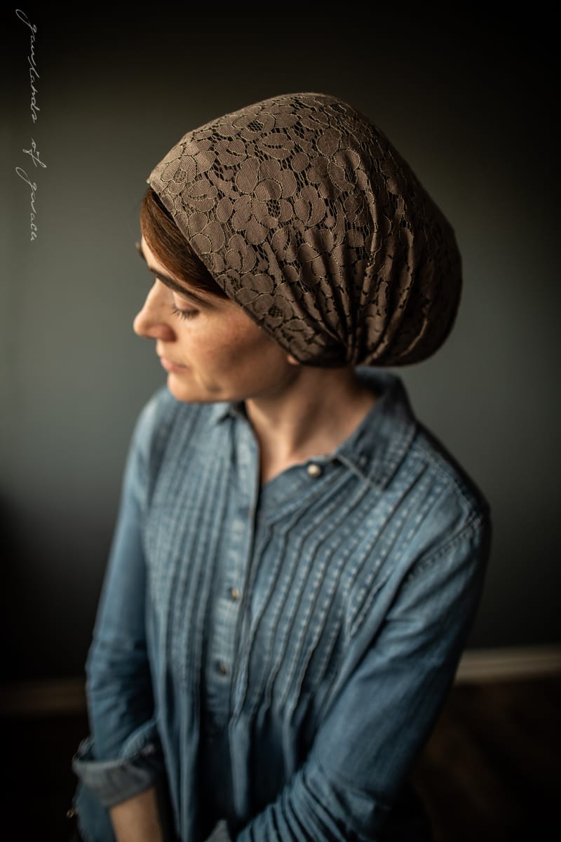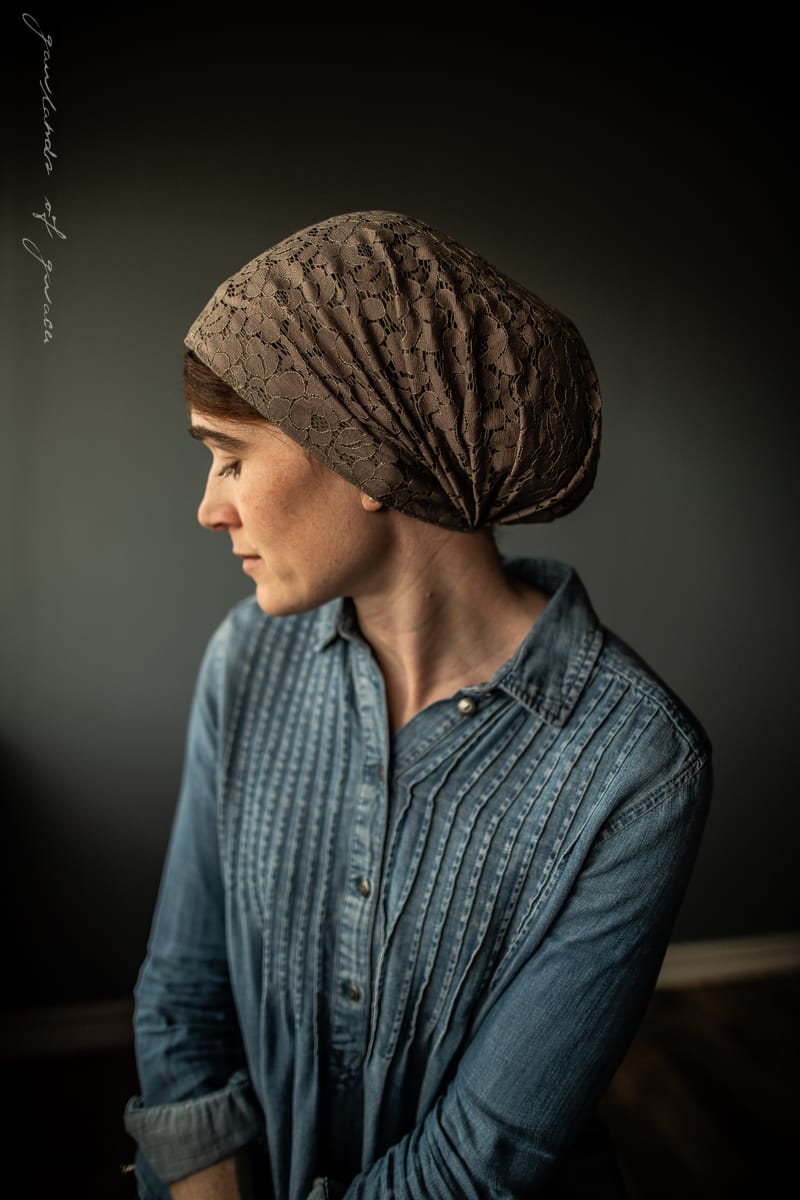 Classic Cotton Snood style full coverage headcoverings, tie closure, no slip lining,