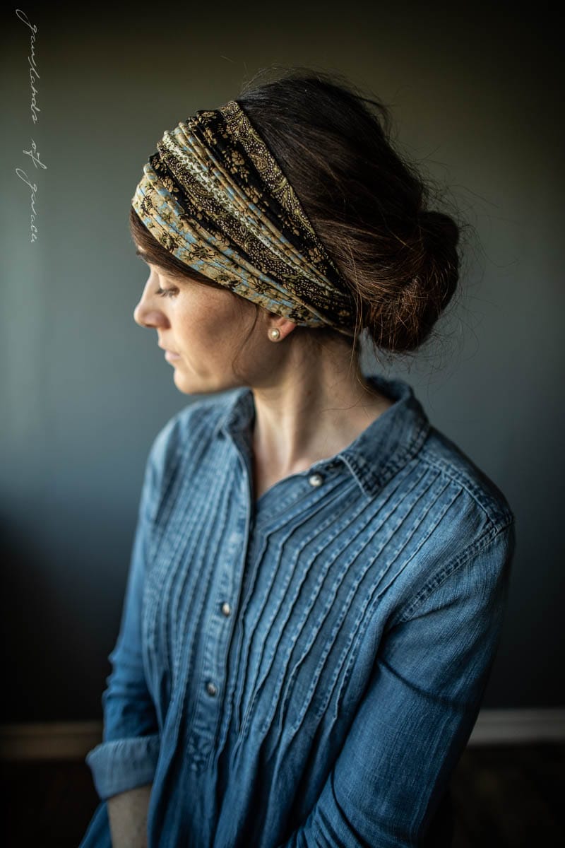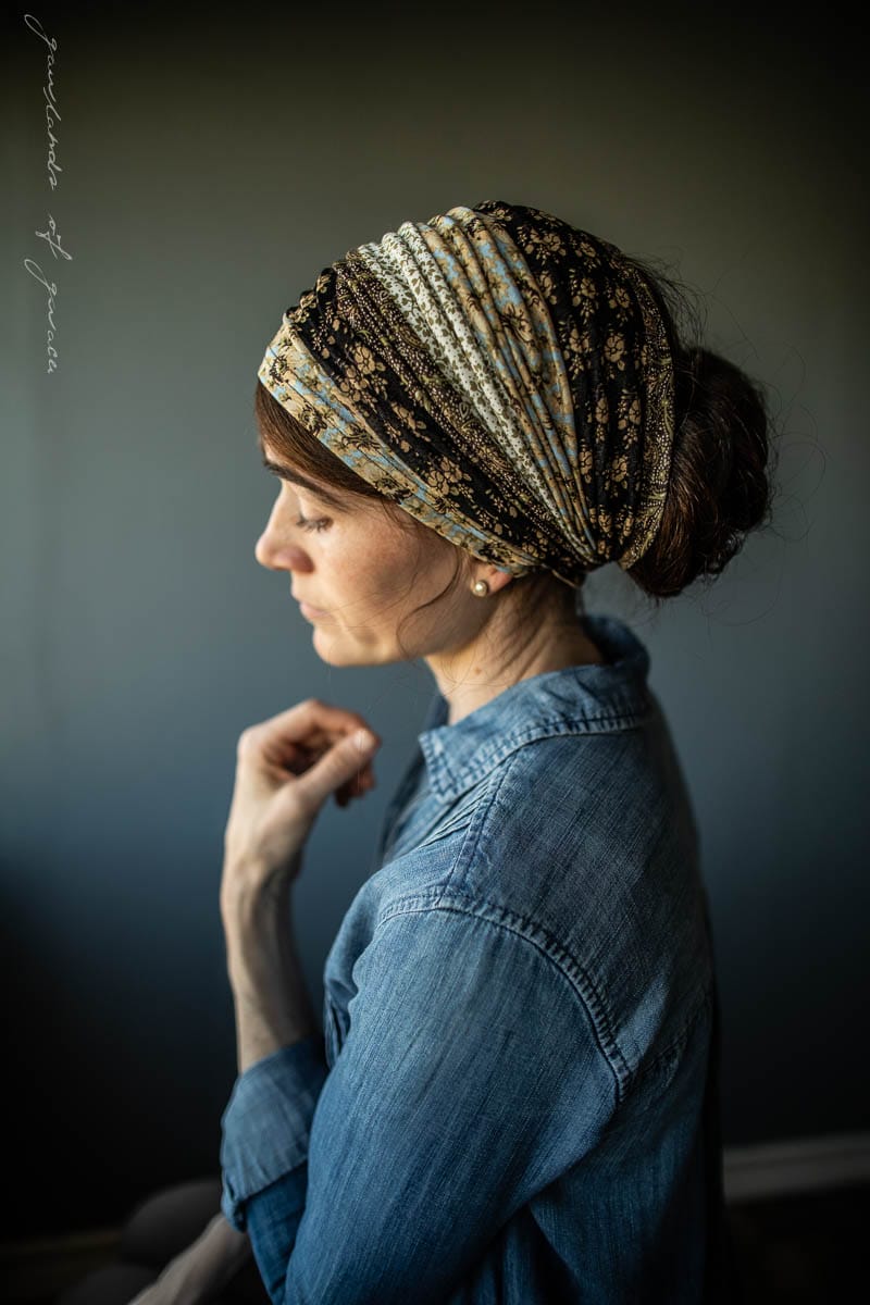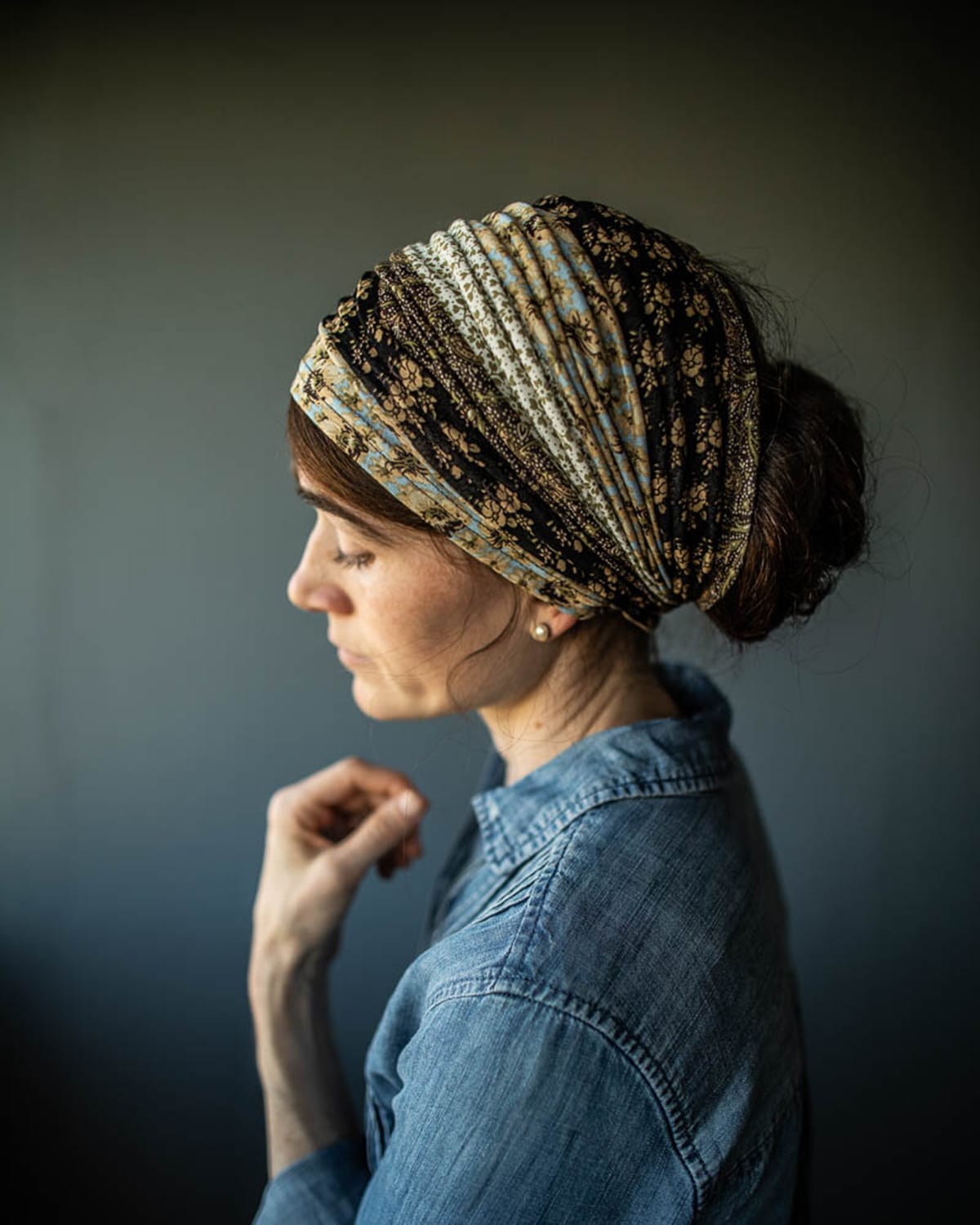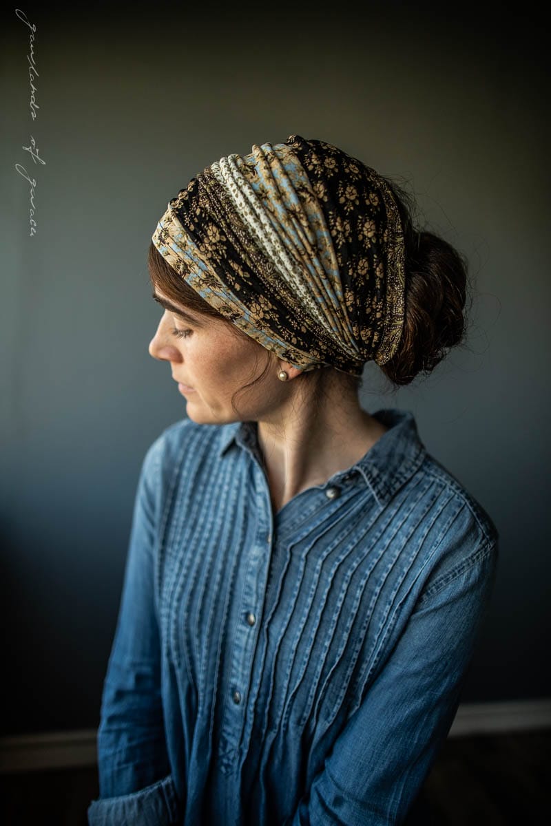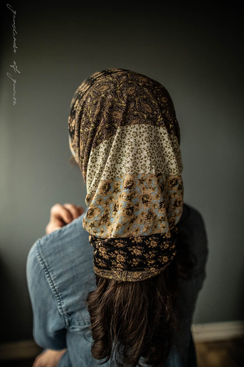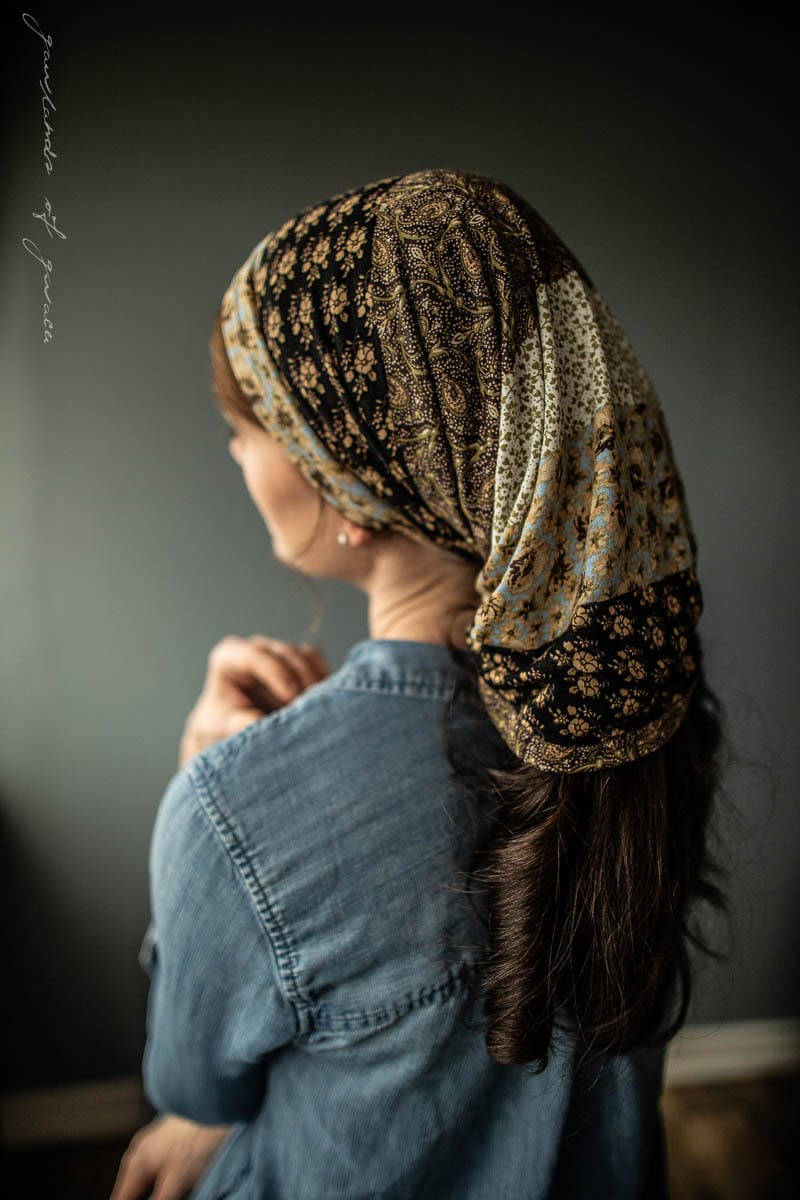 Garlands of Grace original Cowl Headcovering is offered for the season in a breathtaking collection of rich, vintage florals! Garlands Classic soft stretch hair wrap offers several styling options in one! Headwrap may be worn long, folded for medium length, or bunched into a classy headband style! Clasp Closure offers easy on and off wear and styling. Versatile, Flattering and Feminine.