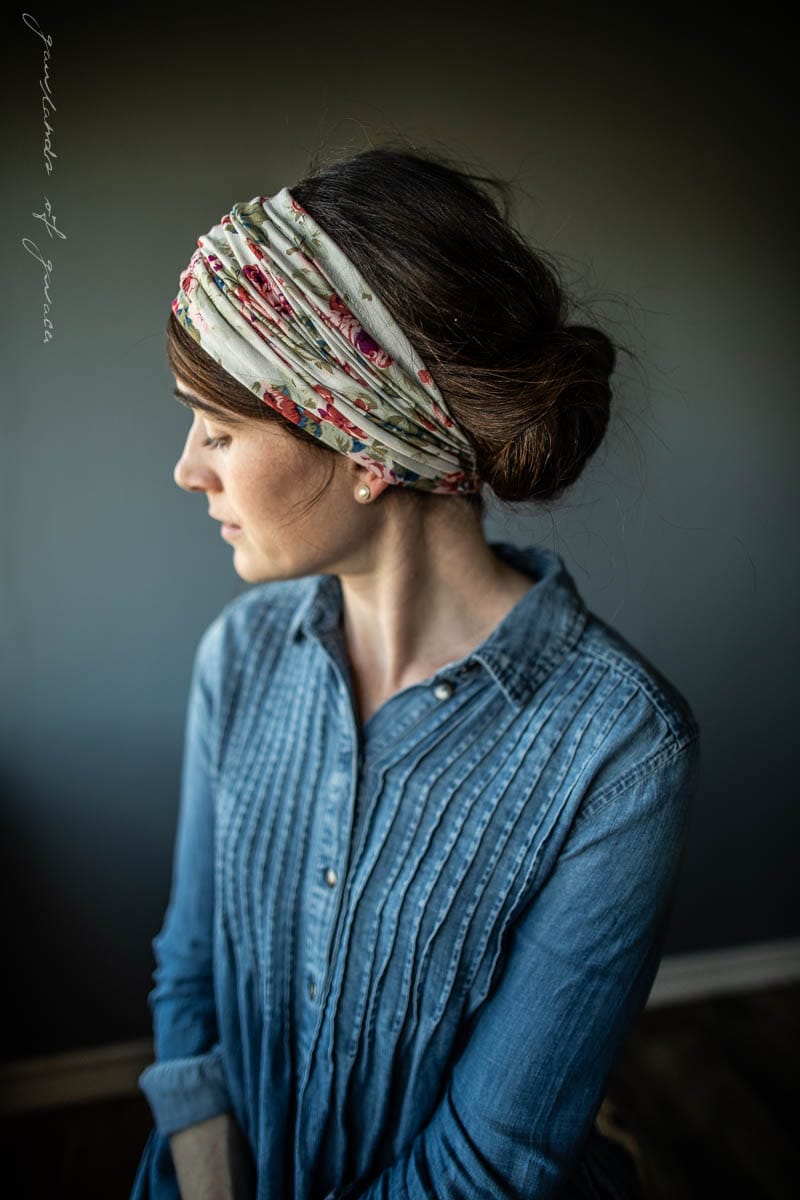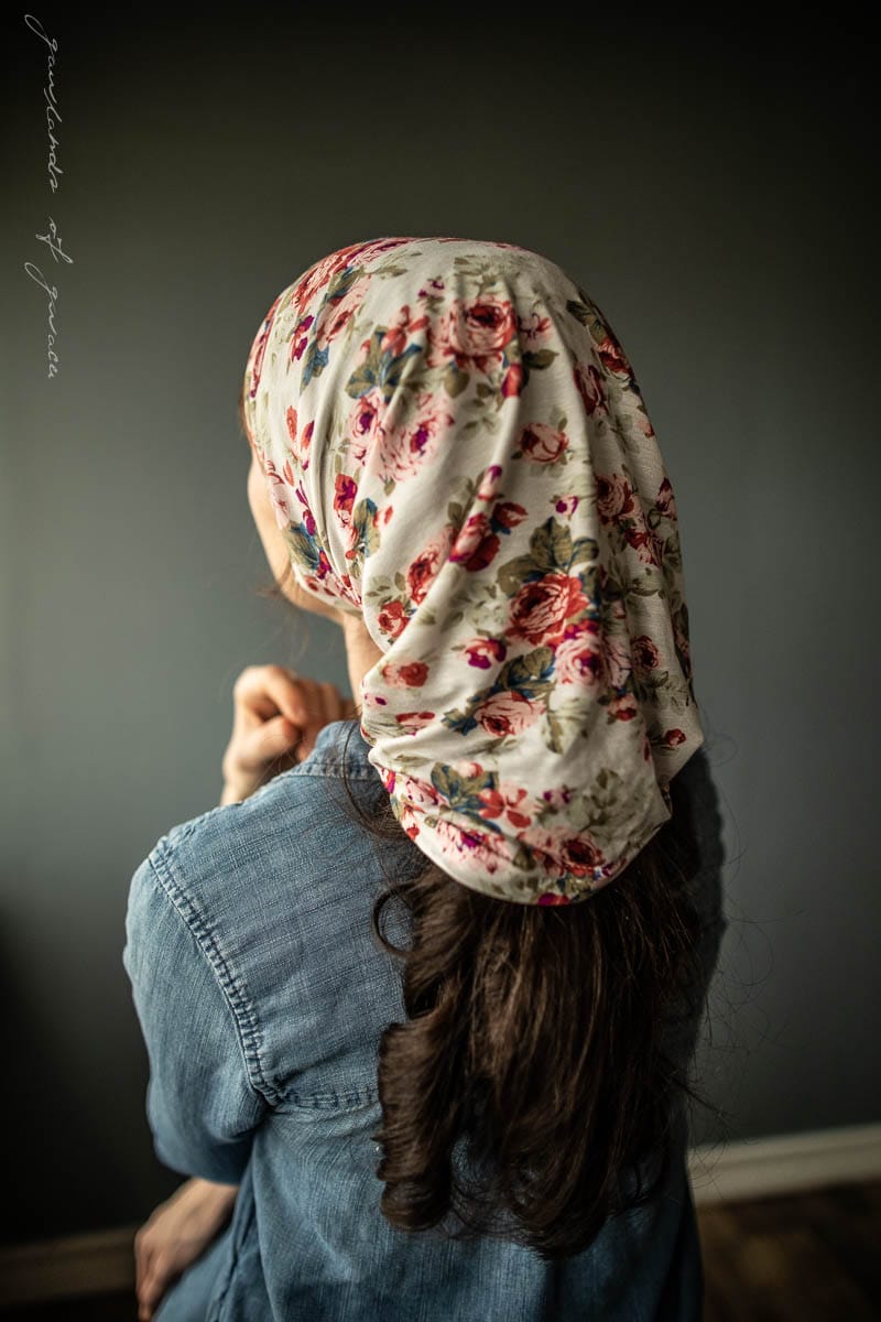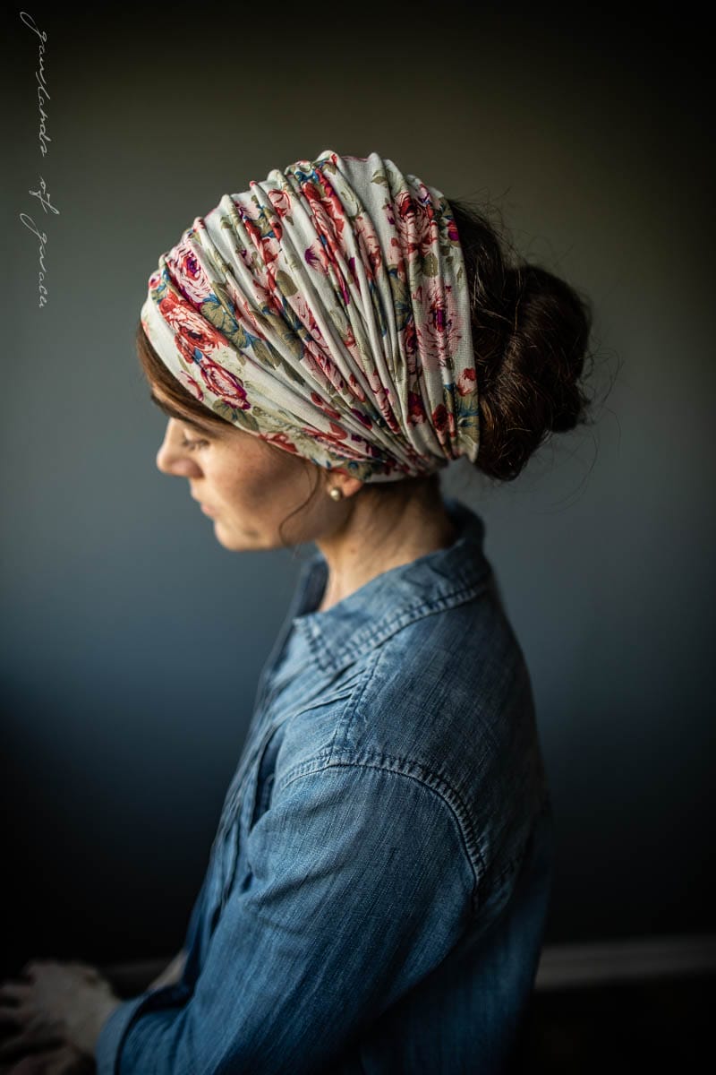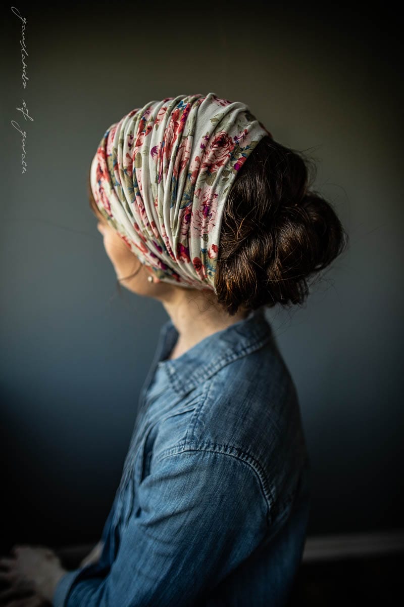 Garlands of Grace original Cowl Headcovering is offered for the season in a breathtaking collection of rich, vintage florals! Garlands Classic soft stretch hair wrap offers several styling options in one! Headwrap may be worn long, folded for medium length, or bunched into a classy headband style! Clasp Closure offers easy on and off wear and styling. Versatile, Flattering and Feminine.