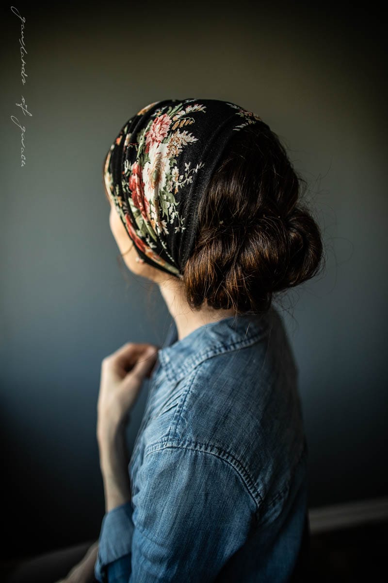 The most breathtaking hairwrap collection featuring soft, textured solids and breathtaking floral prints! Cecily’s soft stretch covering features convertible styling! Wear fully extended as a medium-length headcovering or bunched for a flattering Headband style. Clasp Closure offers easy on/off wear and a seamless, finished look. Timeless, Flattering and Feminine!