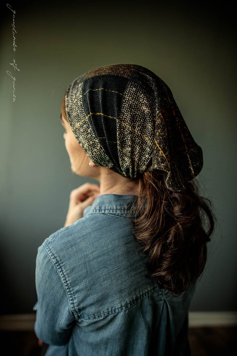 Long Suzanne Stretch Headcoverings, modern Hanging prayer veil design, Convertible, Tie Closure, No Slip Lining added, approximately 14 inches fully extended!